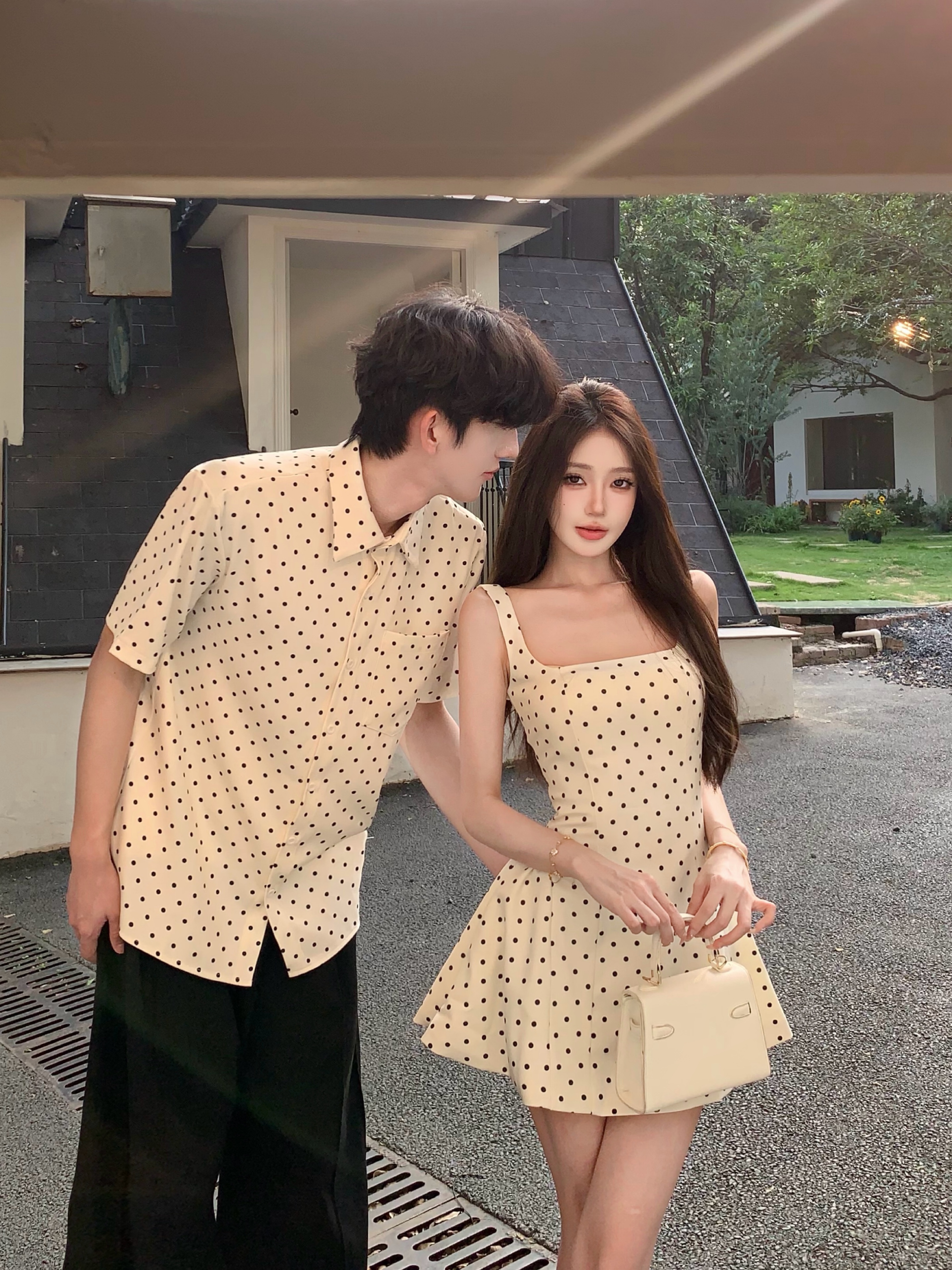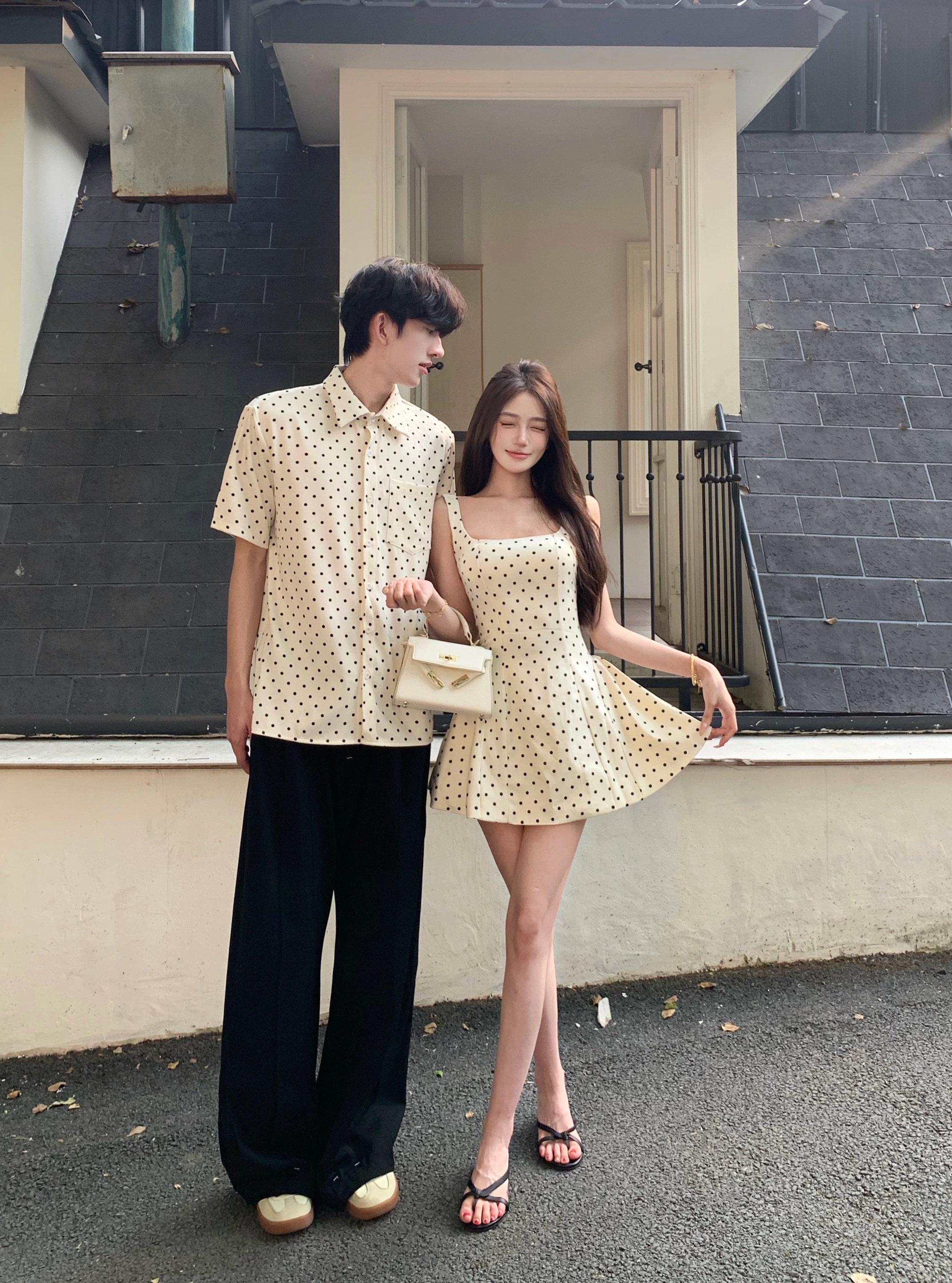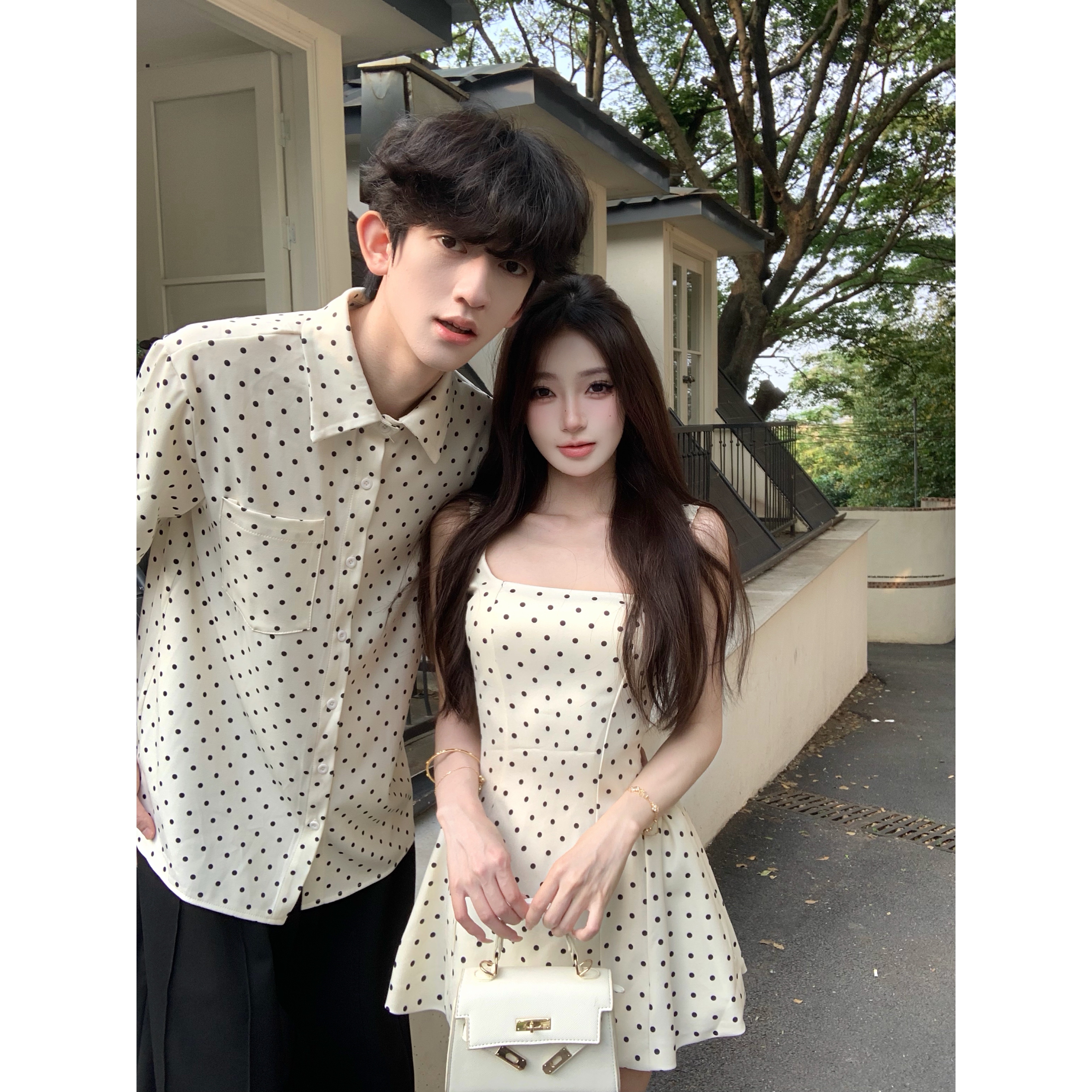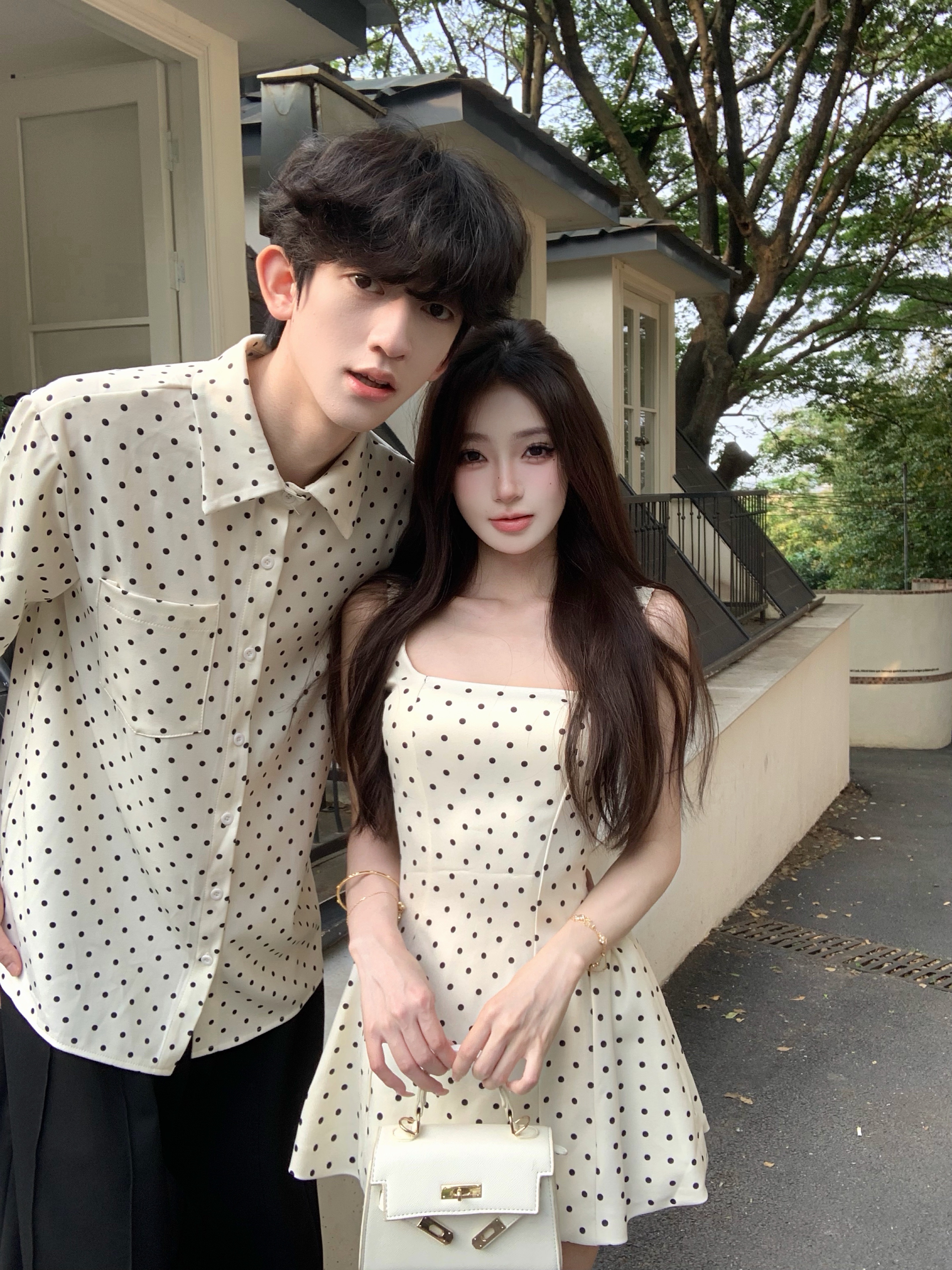 실사 디자인 센스 작은 키 화이트 도트 무늬 드레스 고급 센스 퍼프 미니 스커트 커플룩