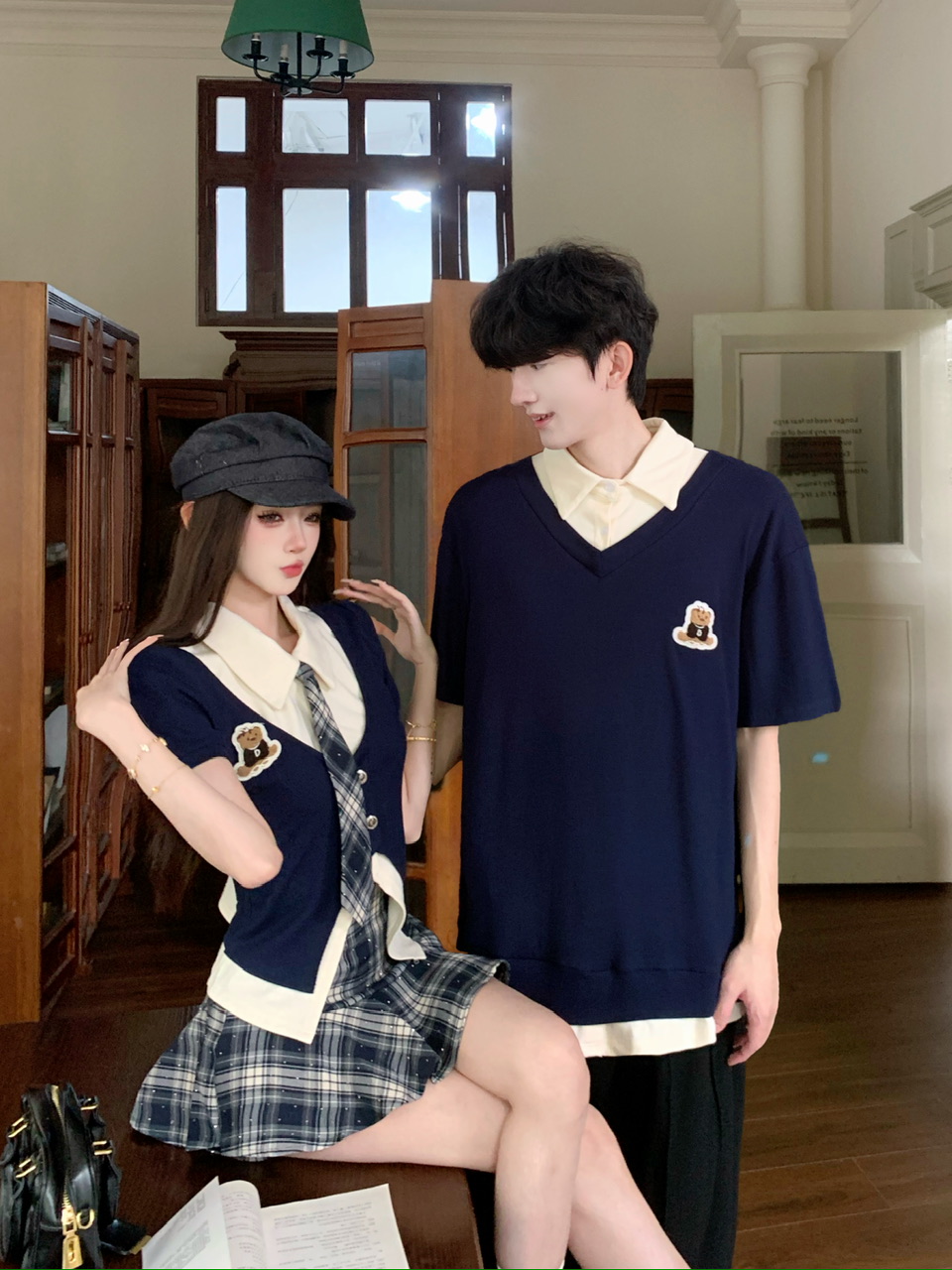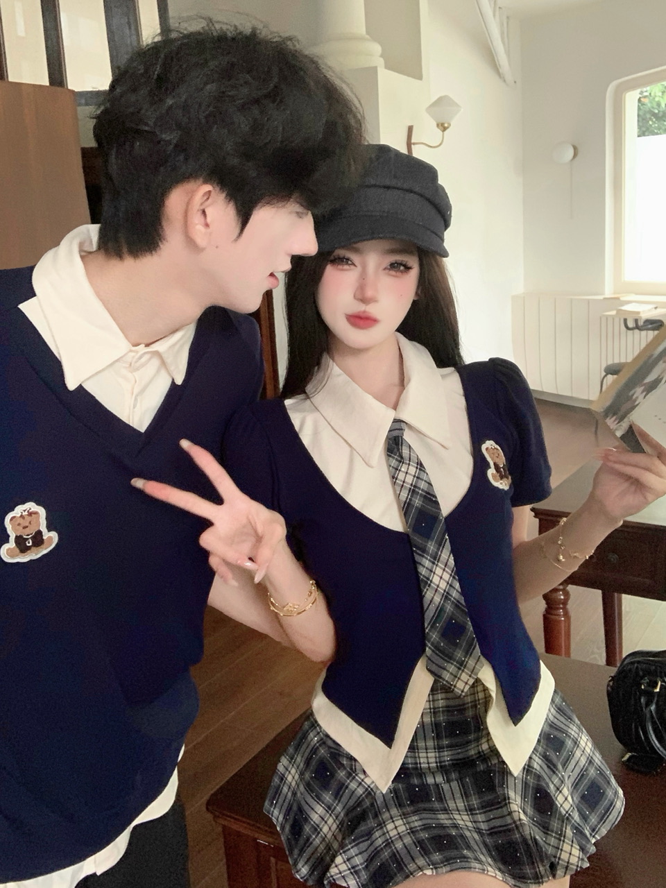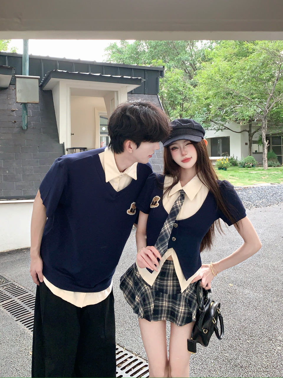 실사 페이크 레이어드 패치워크 폴로 칼라 체크무늬 여성 셔츠 한 부서 학원 스타일 맨위 짧은 치마 세트 커플룩