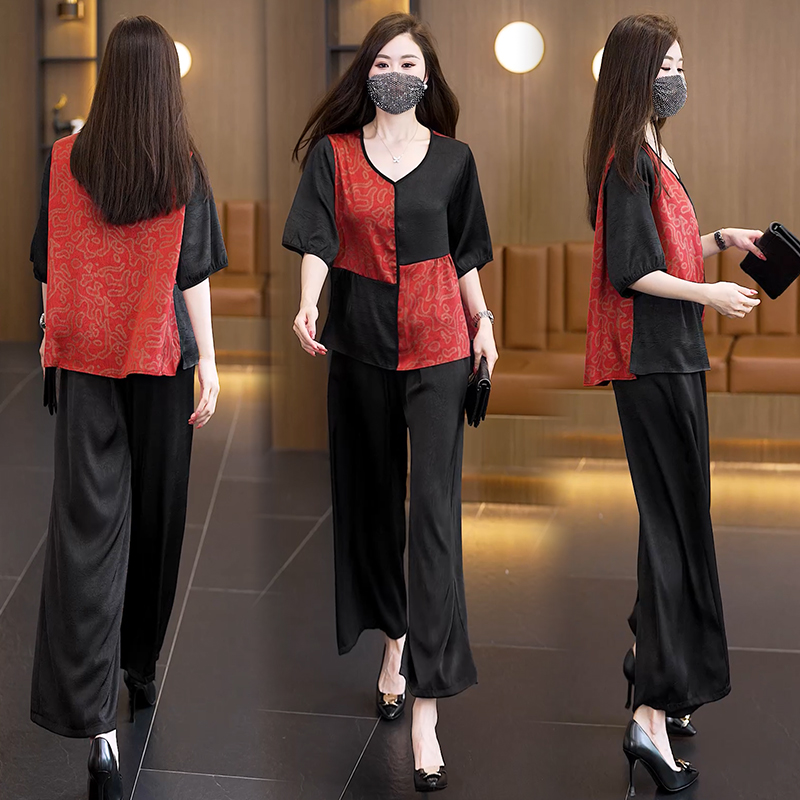중년 엄마 여름 드레스 패션 세트 루즈핏 와이드 레그 팬츠 외국 가스 빅 사이즈 여성 의류 아세트산 공단 고급 투피스 세트