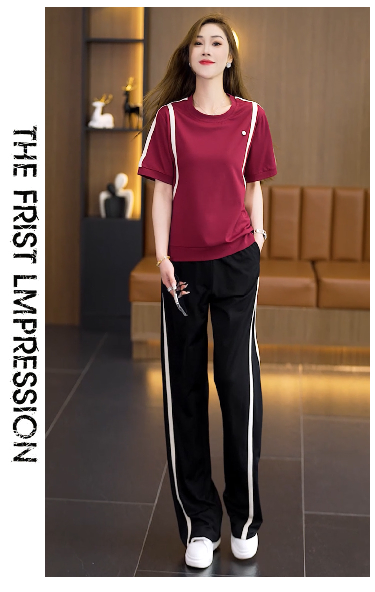 여름 새로운 어머니 드레스 중년 여성 투피스 세트 패션 다용도 반팔 와이드 레그 팬츠 슬림해 보이는 세트