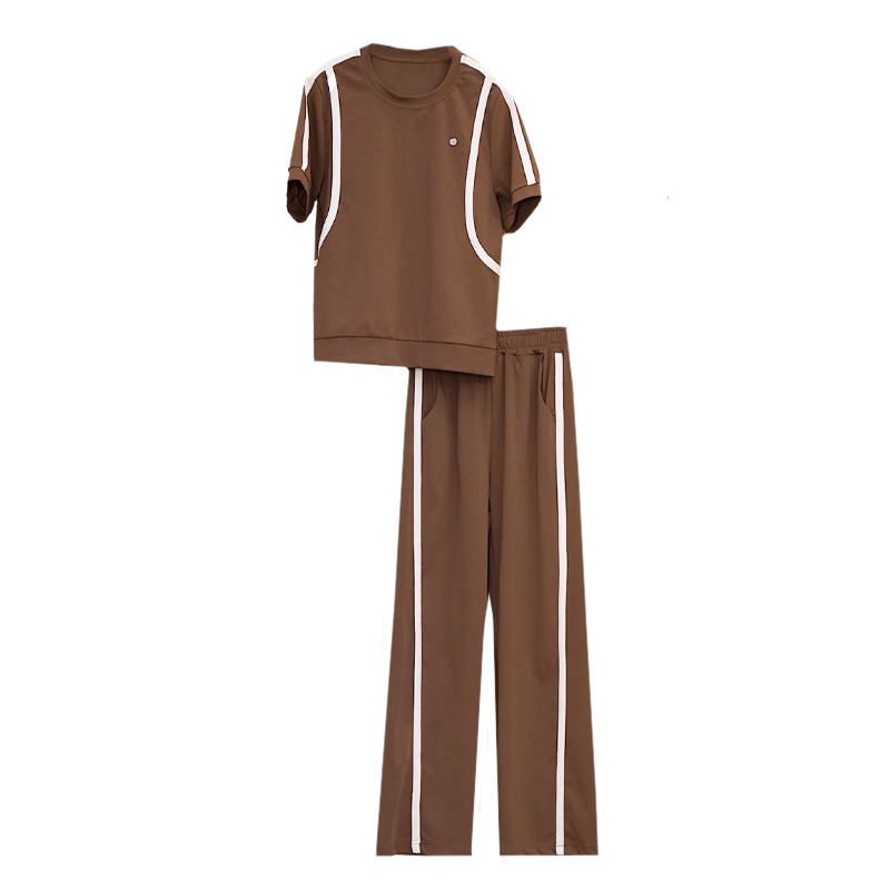 캐주얼 스포츠 슈트 여성 여름 새로운 루즈핏 슬림해 보이는 해군 칼라 반팔 후드티 넓은 다리 투피스 세트