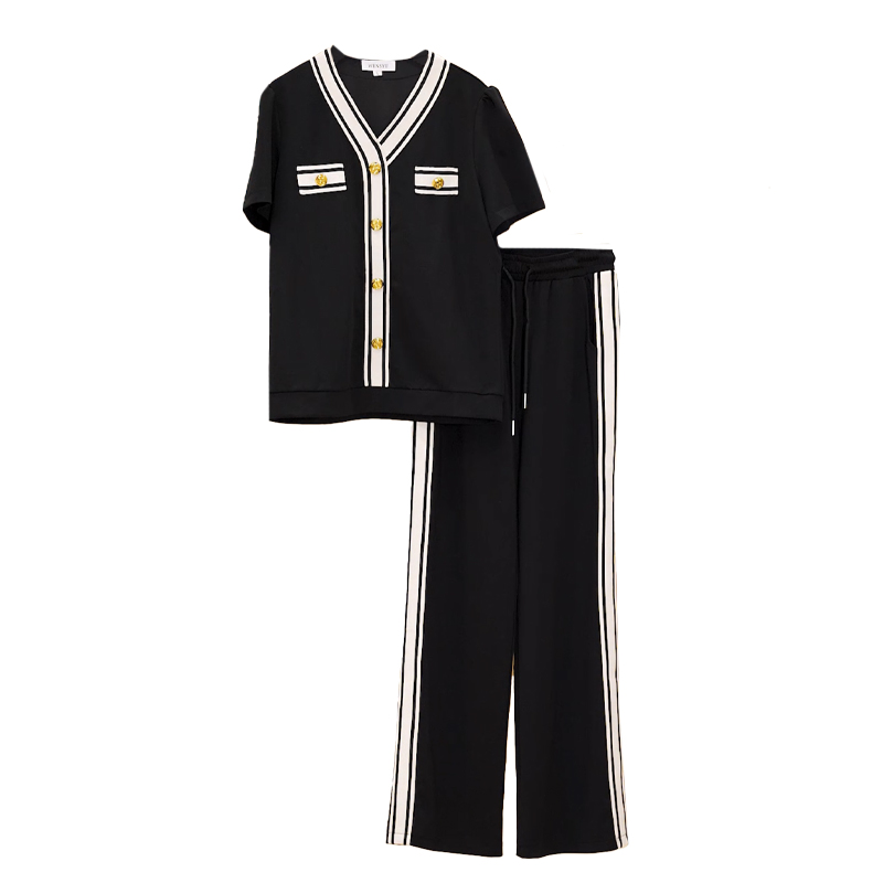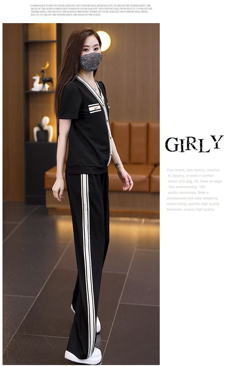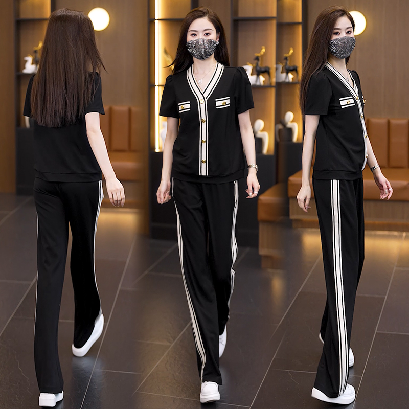 캐주얼 스포츠 슈트 여성 여름 새로운 루즈핏 슬림해 보이는 해군 칼라 반팔 후드티 넓은 다리 투피스 세트