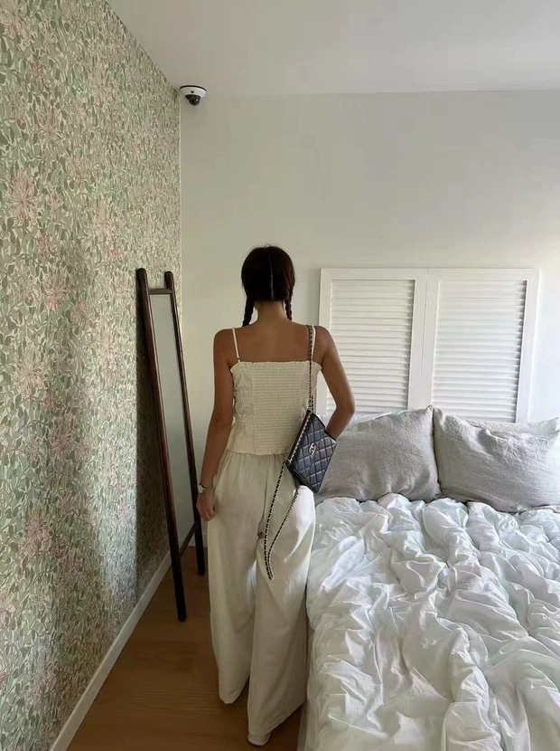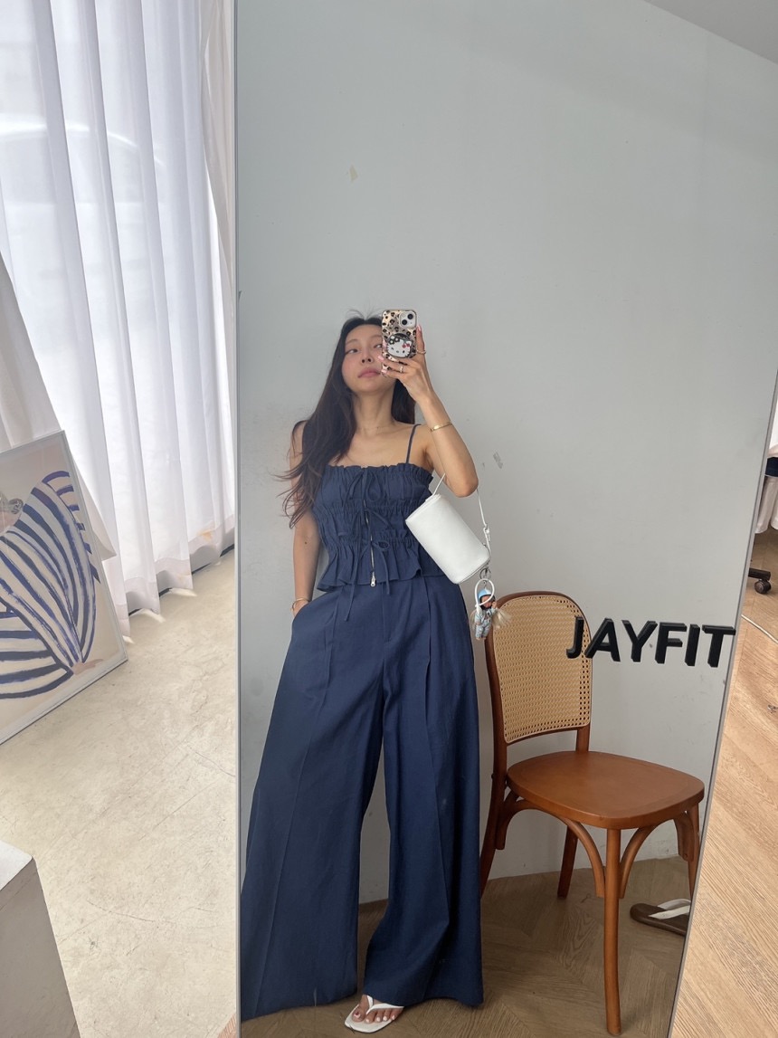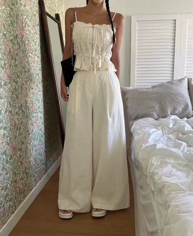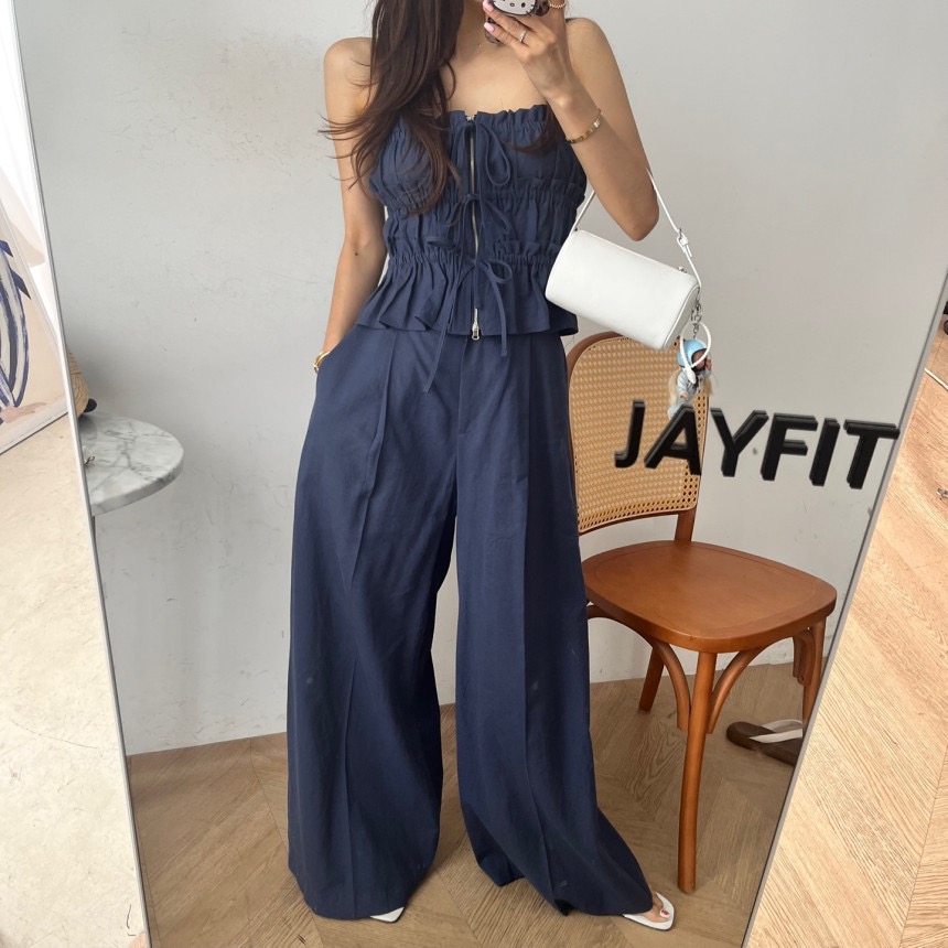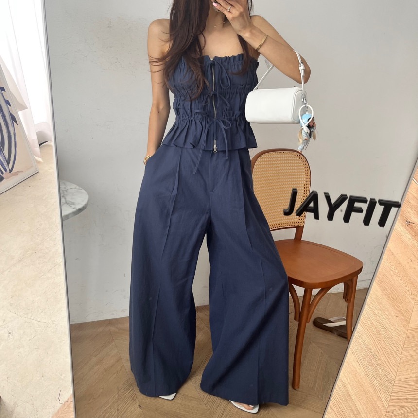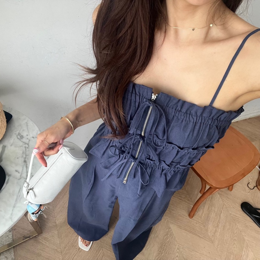 있음 선적 한국 ins 단색 튜브탑 스트랩 지퍼 캐미솔 루즈핏 긴 바지 패션 세트