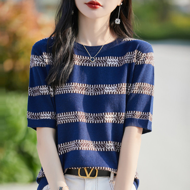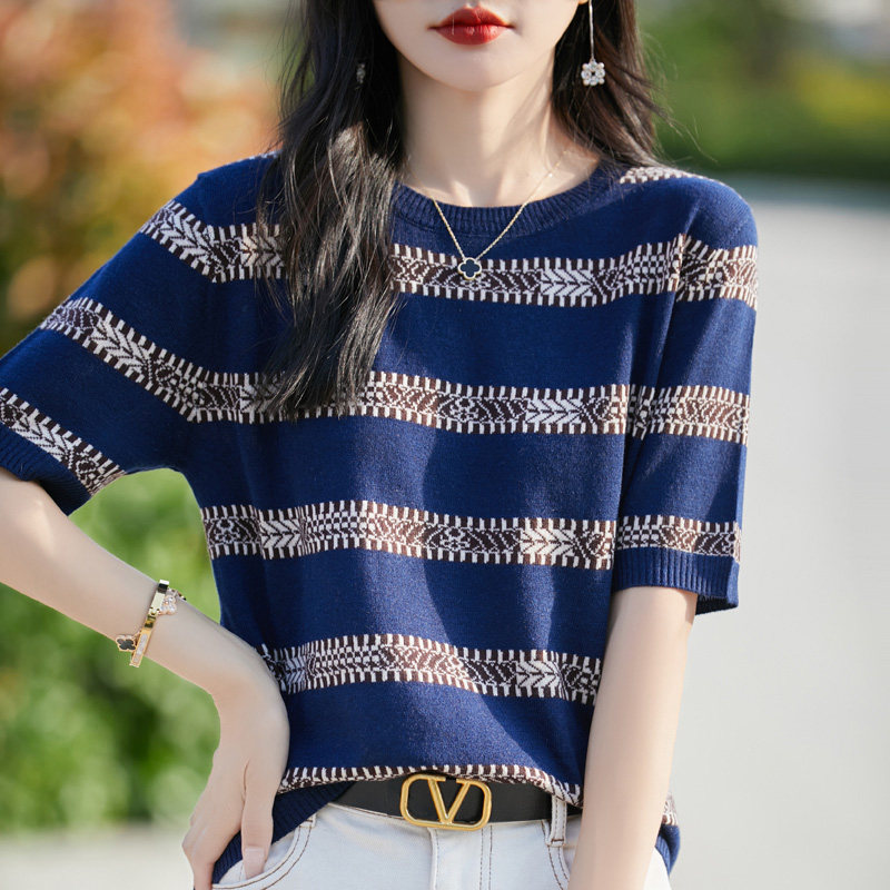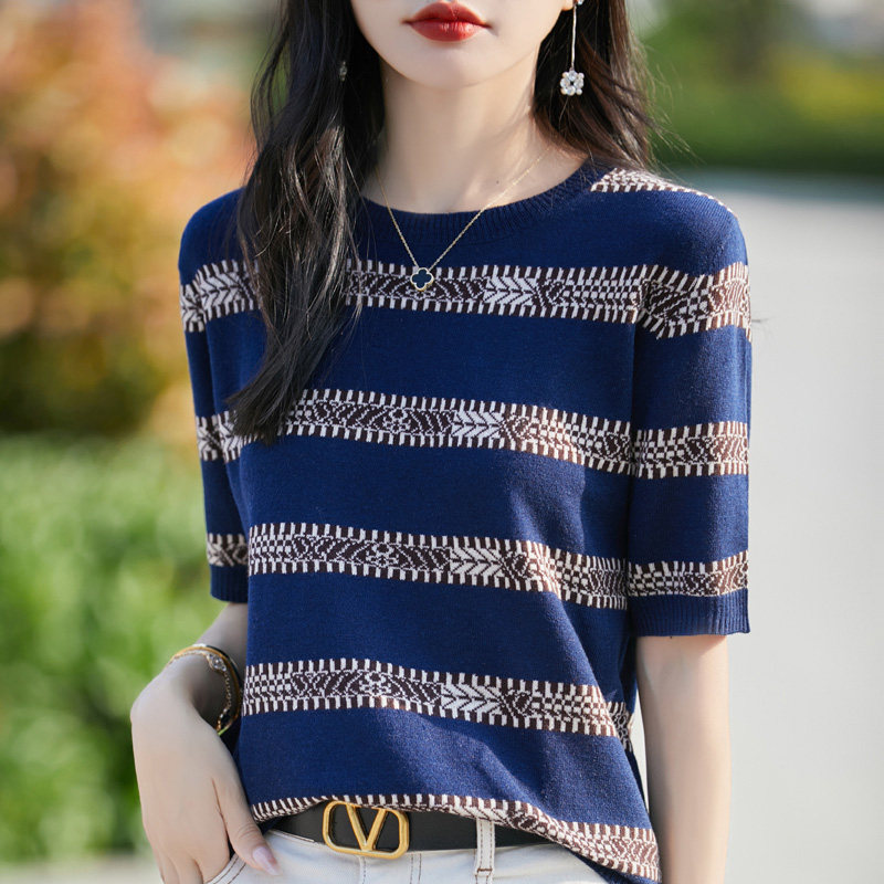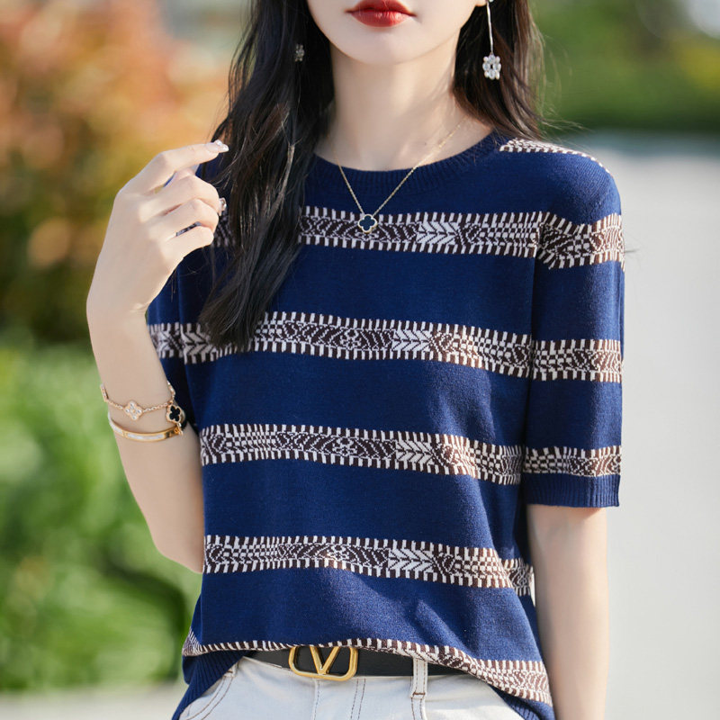 새로운 흑백 줄무늬 티셔츠 하트 반팔 여성 여름 외출용 얼음 실크 주간 실크 중간 소매 니트 슬림해 보이는 5 점 소매