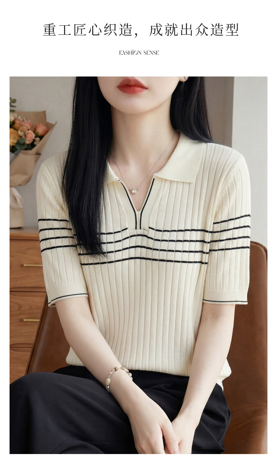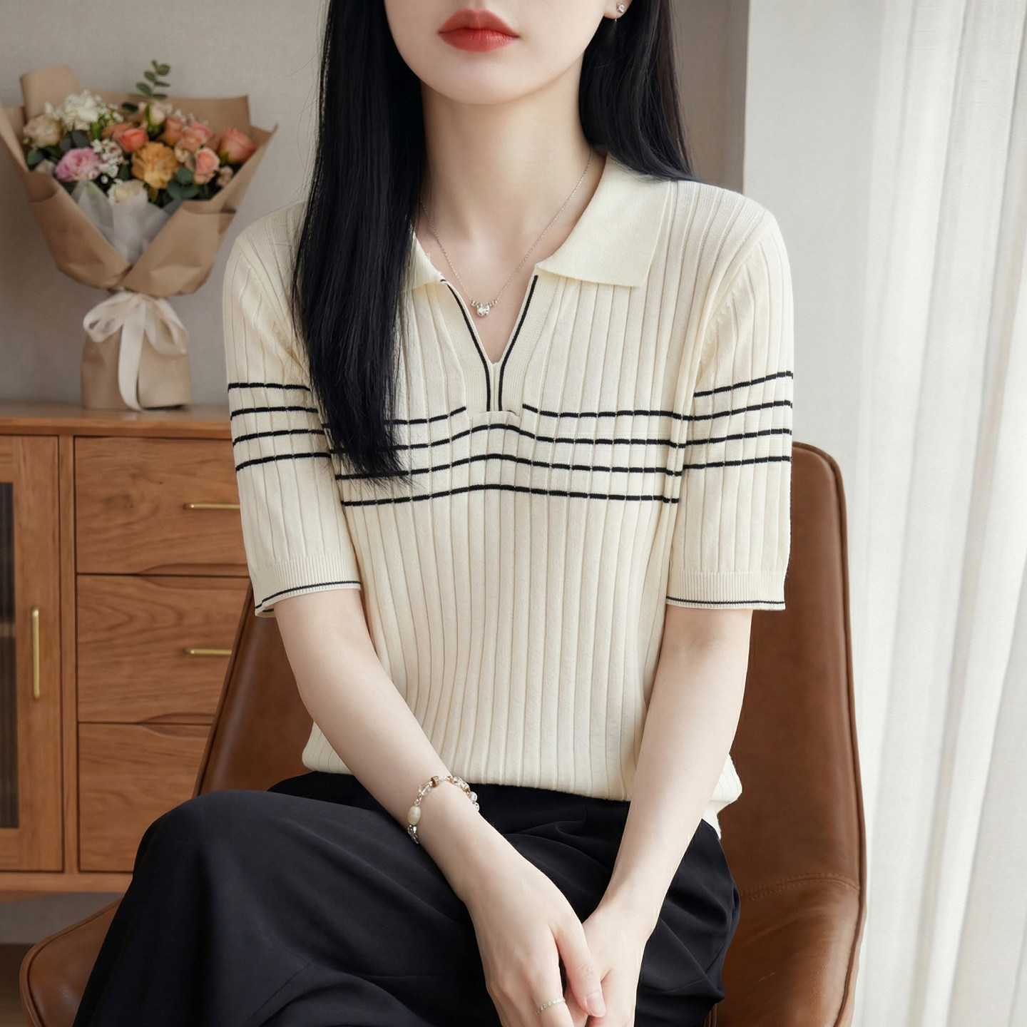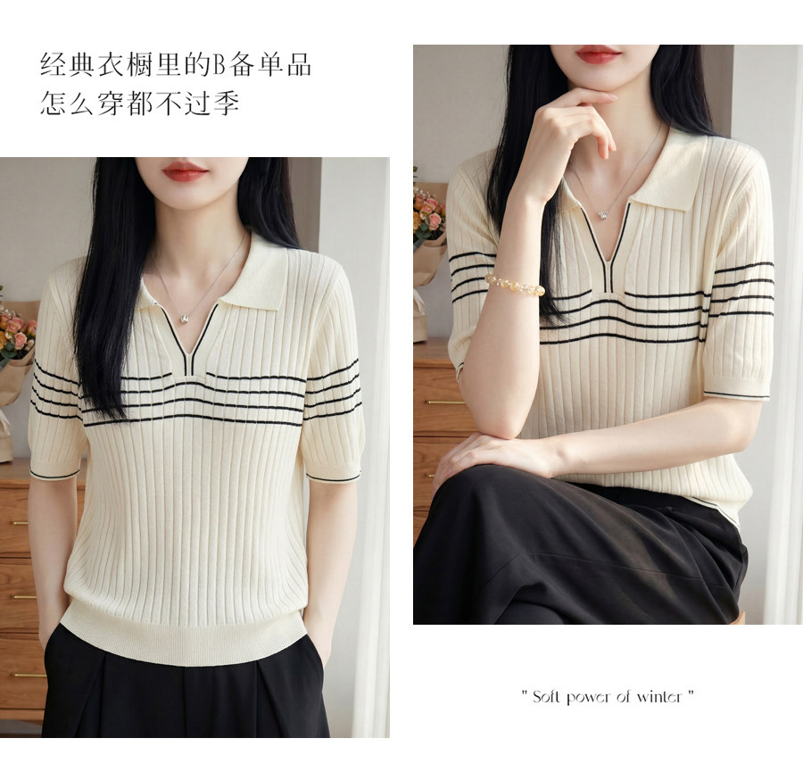여름 새로운 한 부서 연령 감소 여성 슈퍼 잘 생긴 슬림해 보이는 품격 폴로 칼라 스트라이프 반팔 니트 티셔츠 외국 가스 작은 셔츠