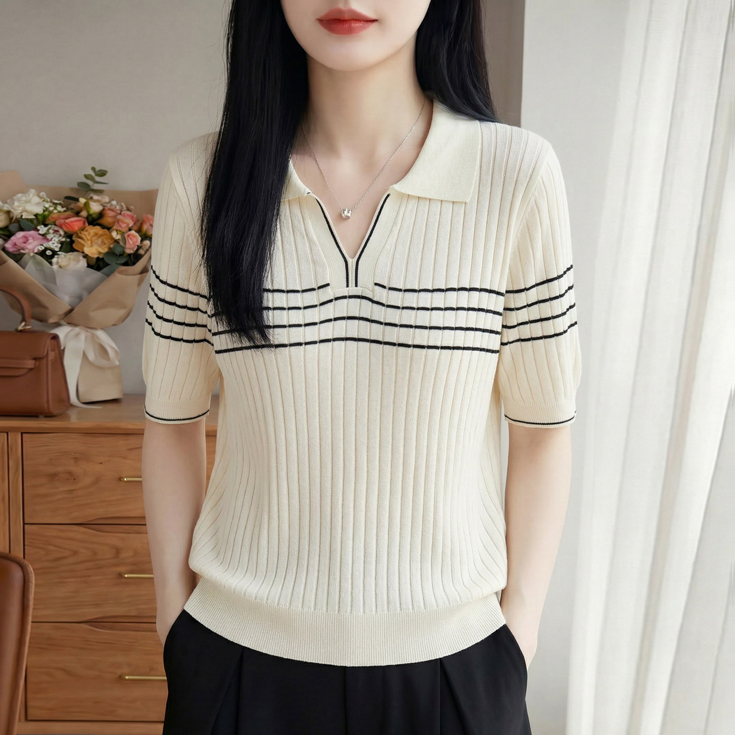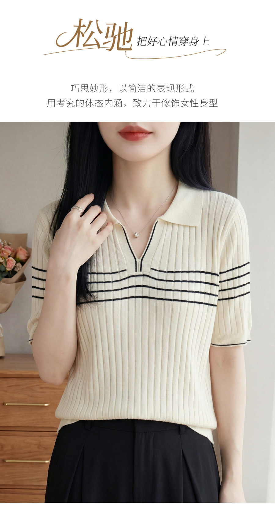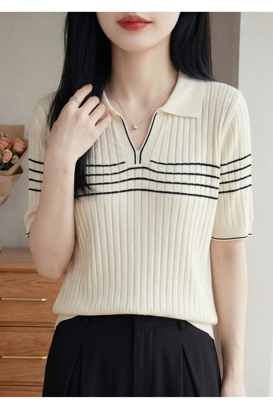 여름 새로운 한 부서 연령 감소 여성 슈퍼 잘 생긴 슬림해 보이는 품격 폴로 칼라 스트라이프 반팔 니트 티셔츠 외국 가스 작은 셔츠