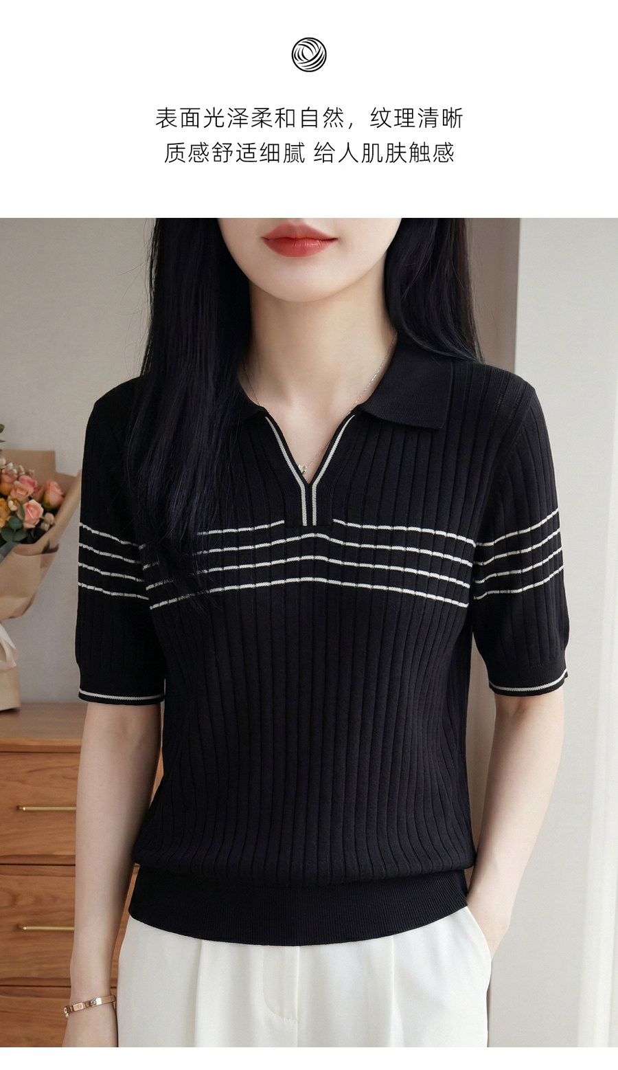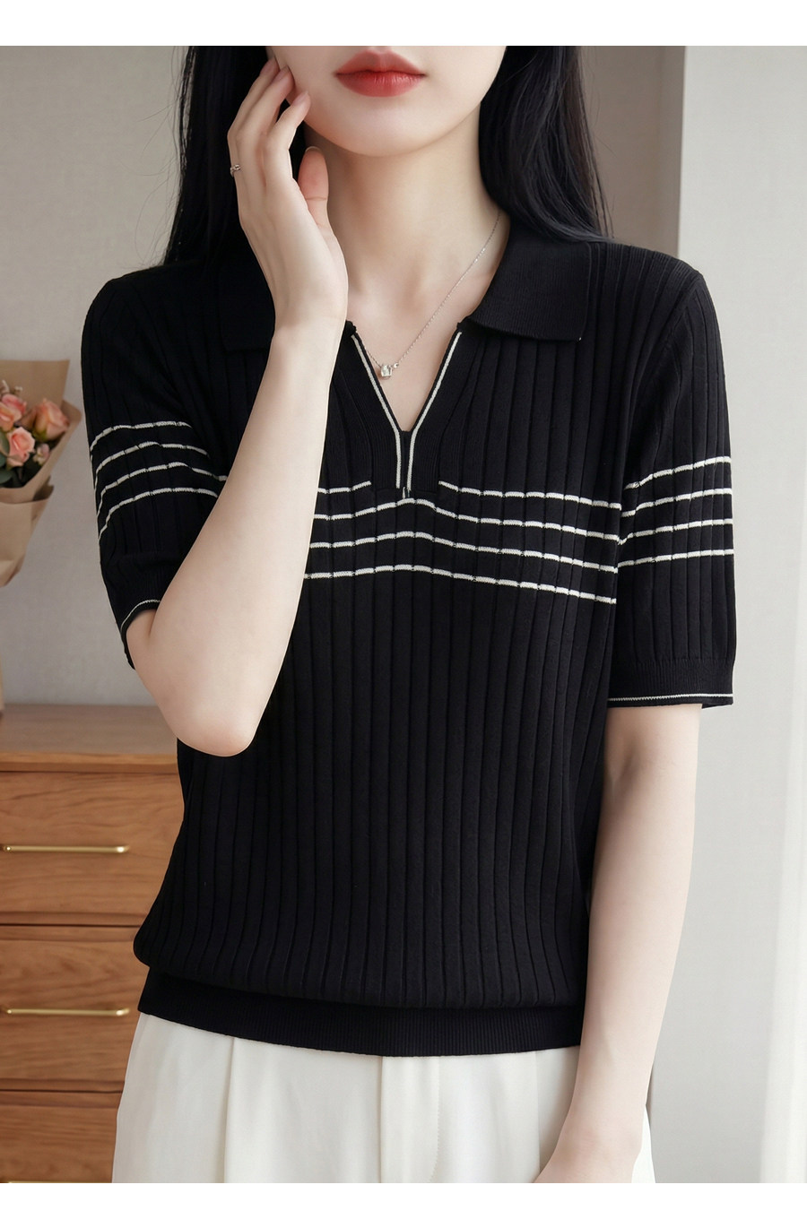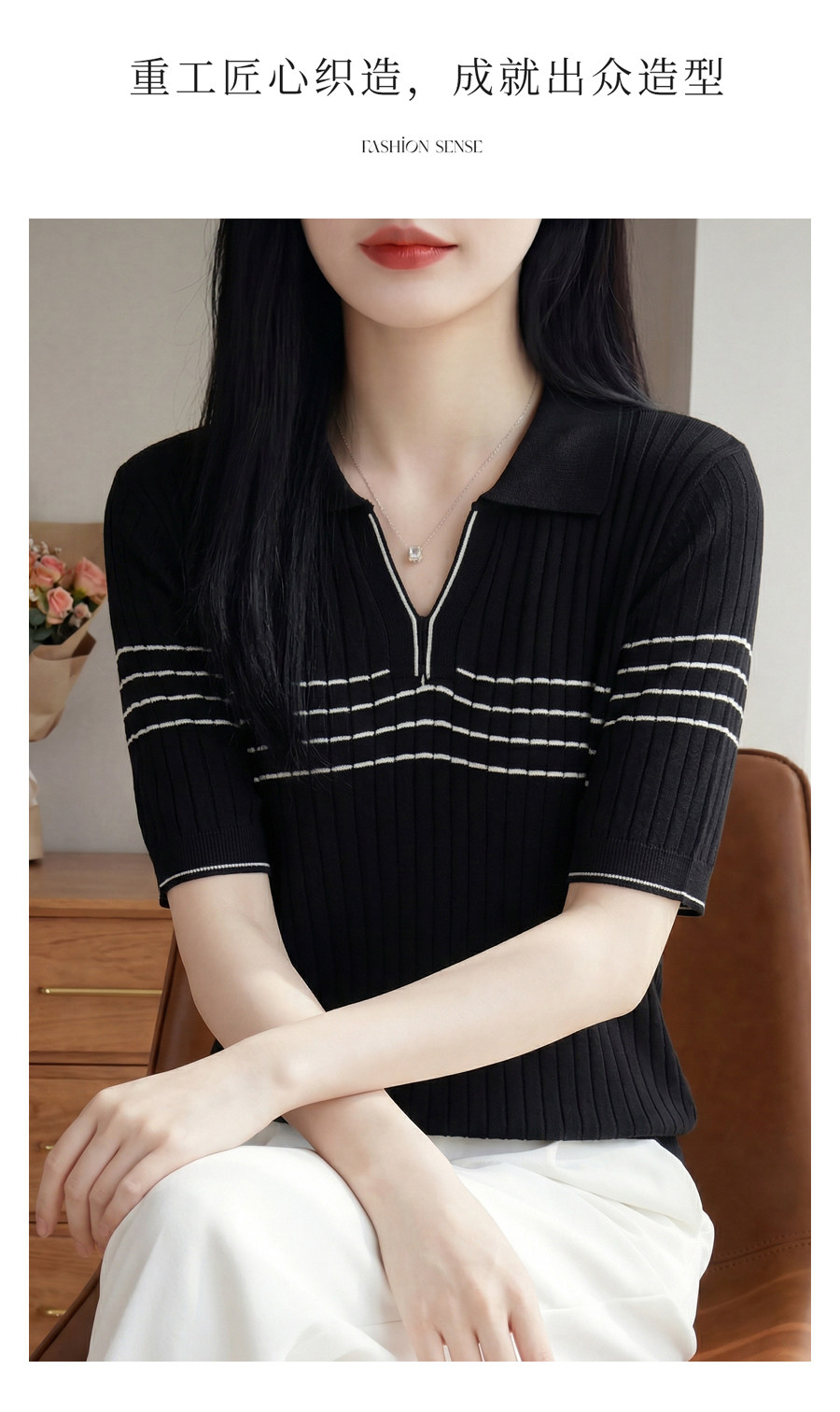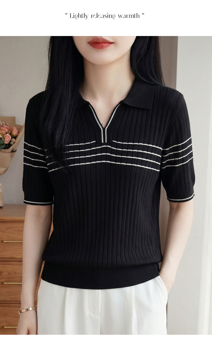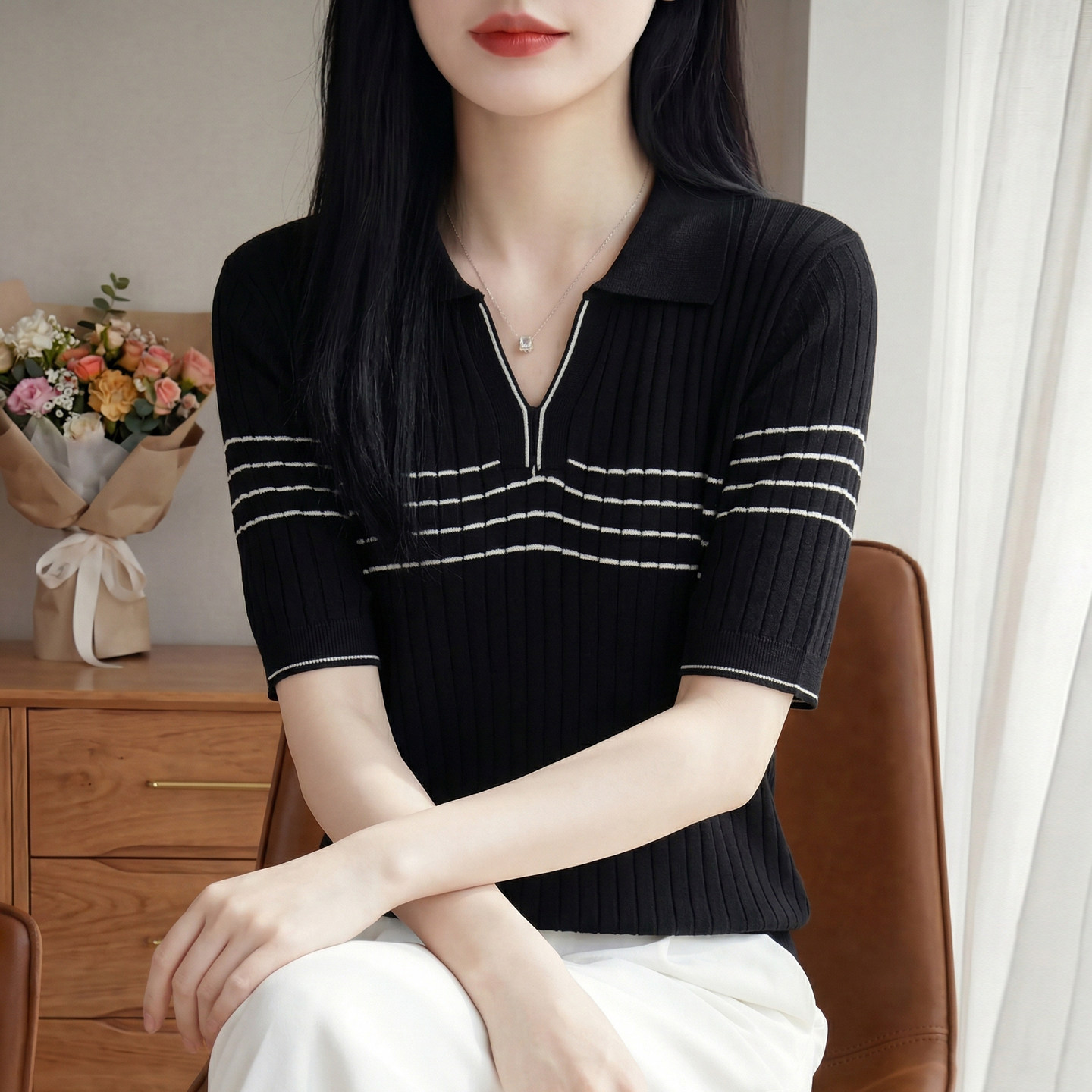 품격 긍정적 인 어깨 폴로 칼라 여름 얇은 스타일 스트라이프 니트 반팔 여성 검정색 슬림해 보이는 빅 사이즈 루즈핏 중간 소매 티셔츠 맨위