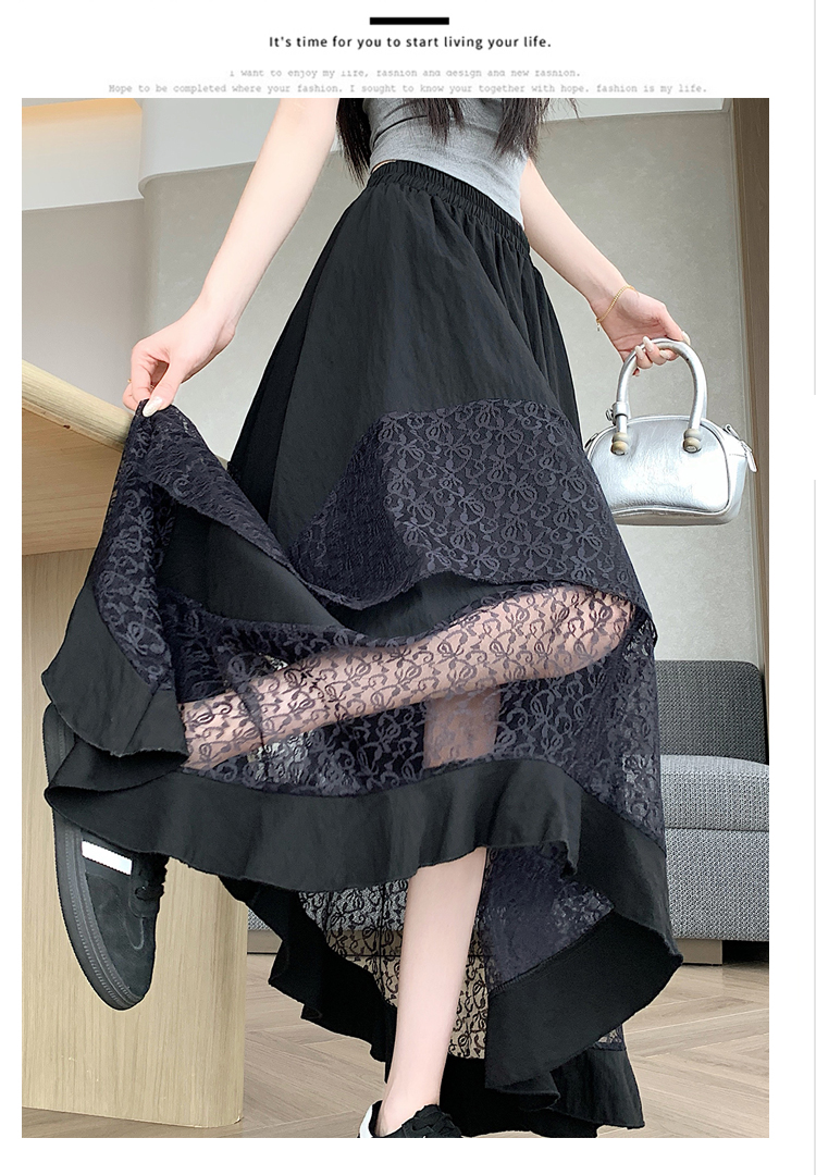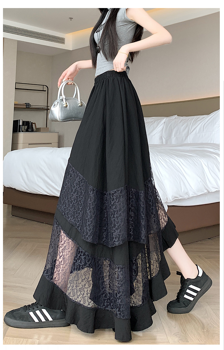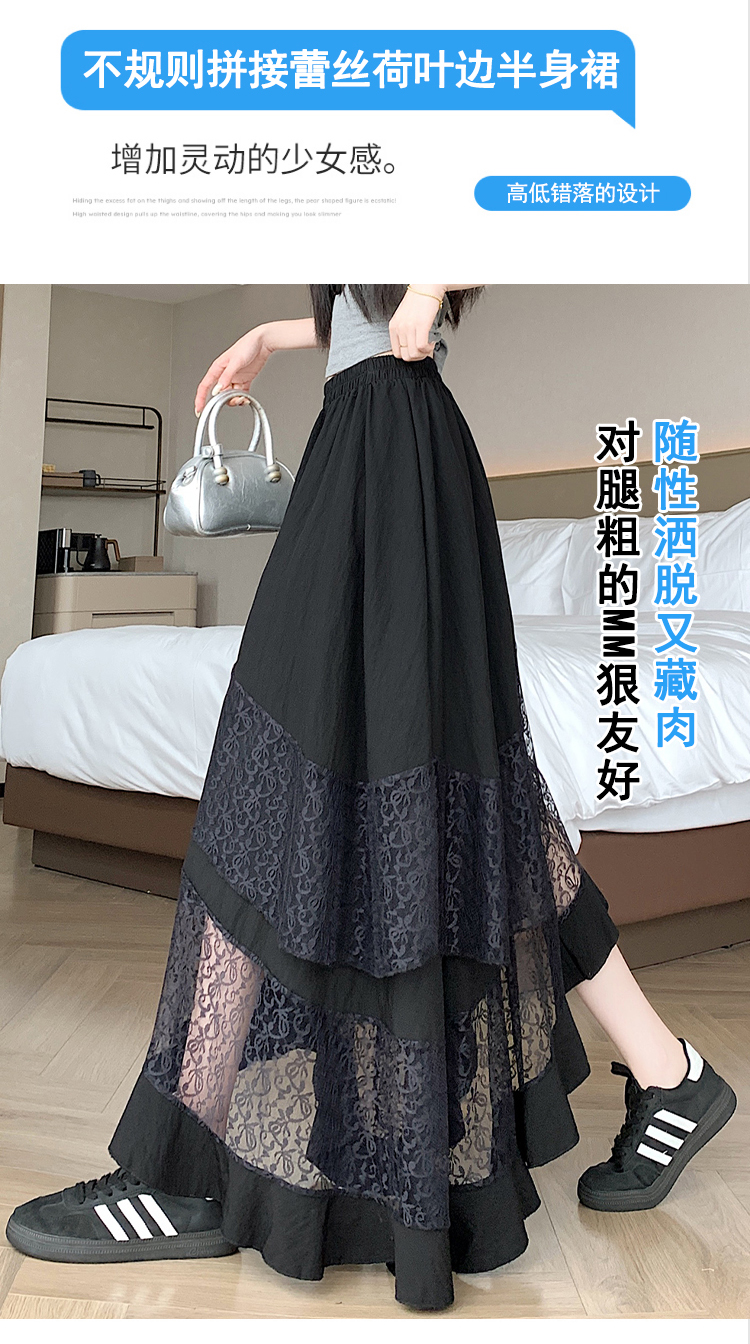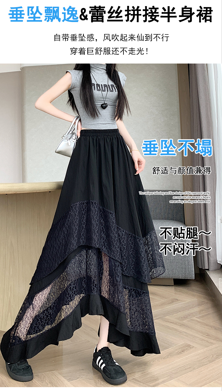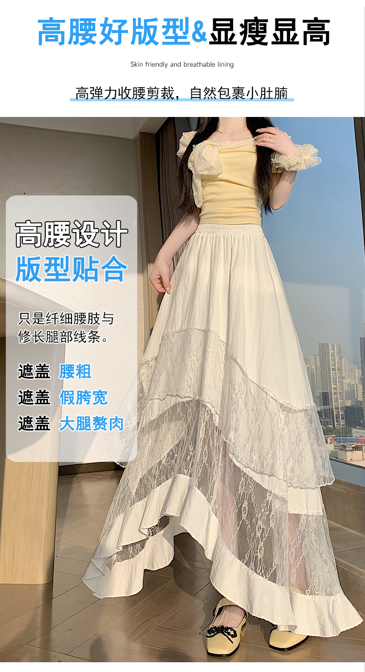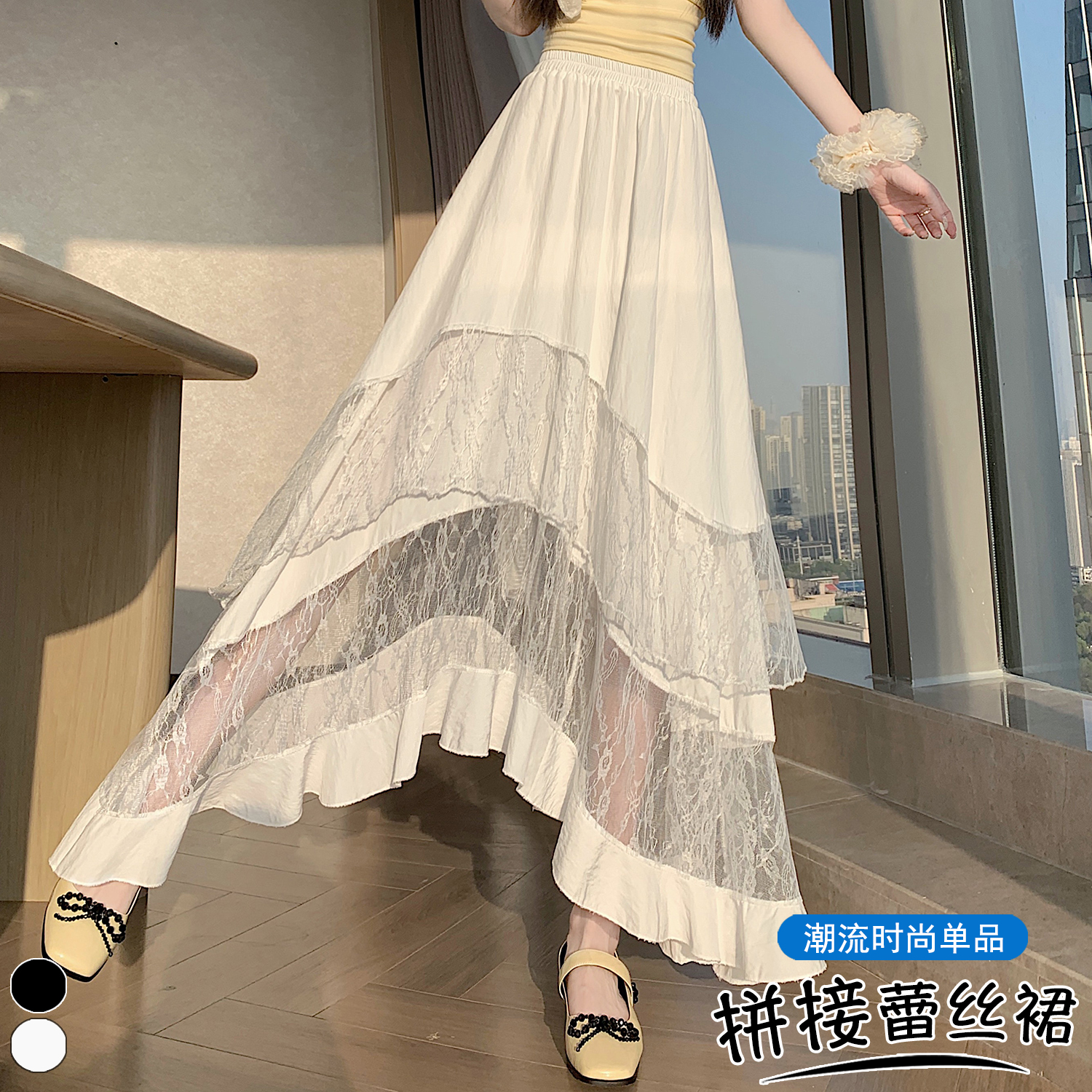 실사 2026 여름 새로운 한국 스타일 하이웨이스트 부드러운 바람 망사 패치워크 레이스 중간 스커트 패션 다용도 A라인 스커트