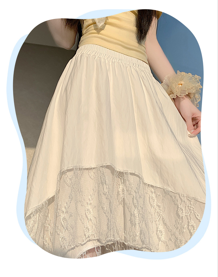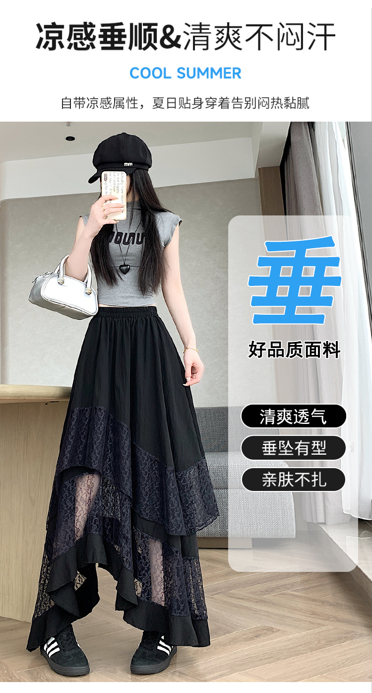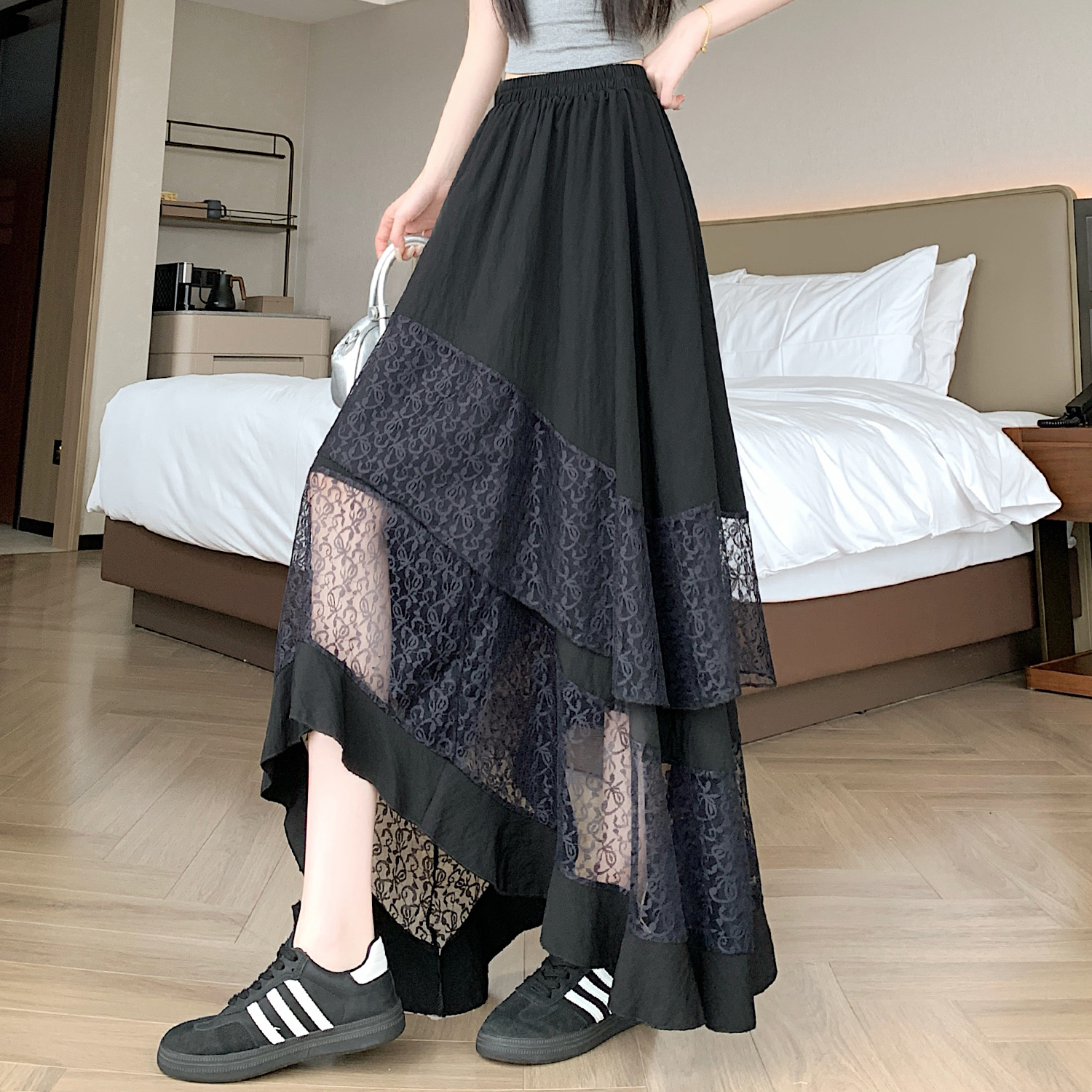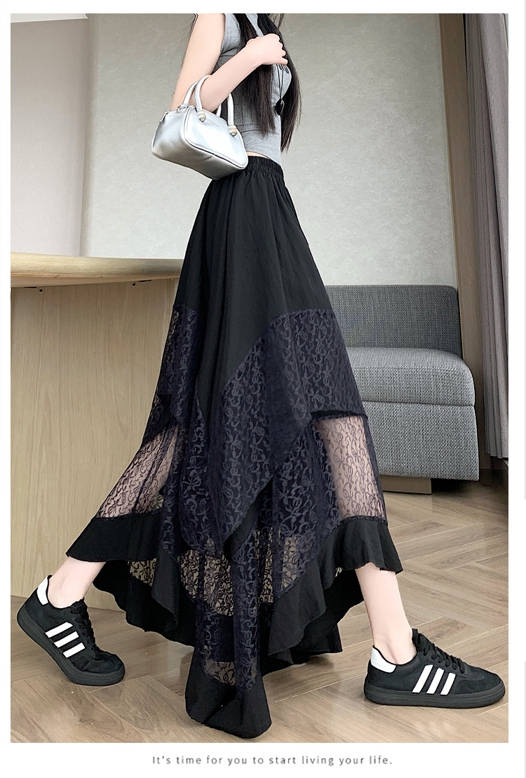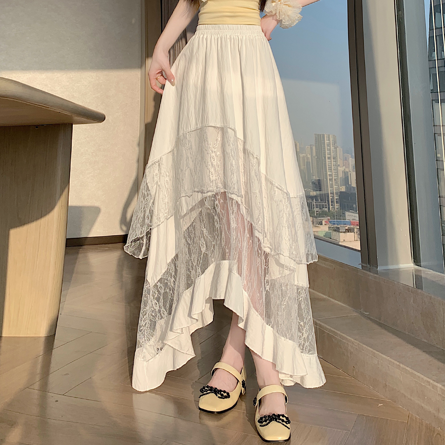 실사 2026 여름 새로운 한국 스타일 하이웨이스트 부드러운 바람 망사 패치워크 레이스 중간 스커트 패션 다용도 A라인 스커트
