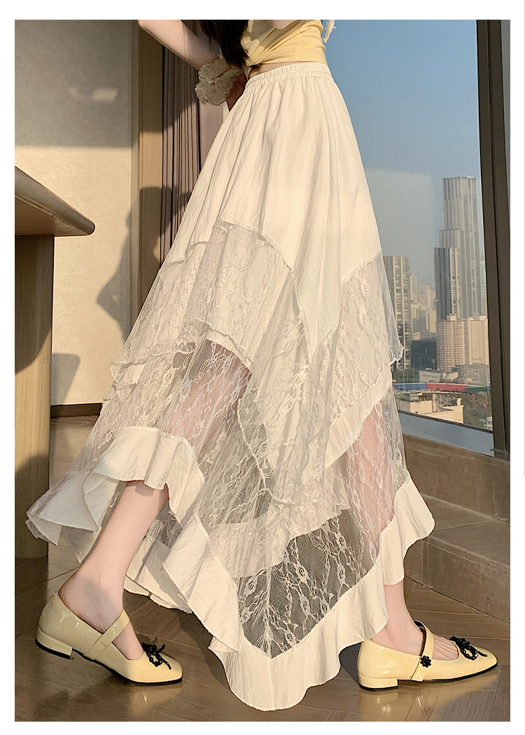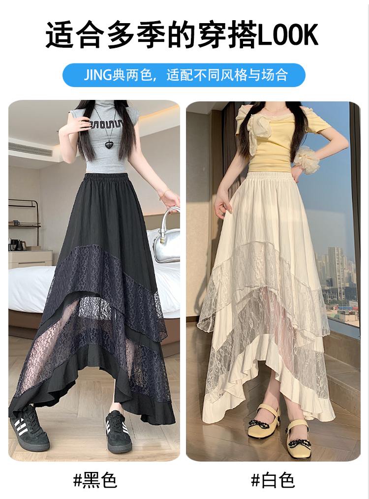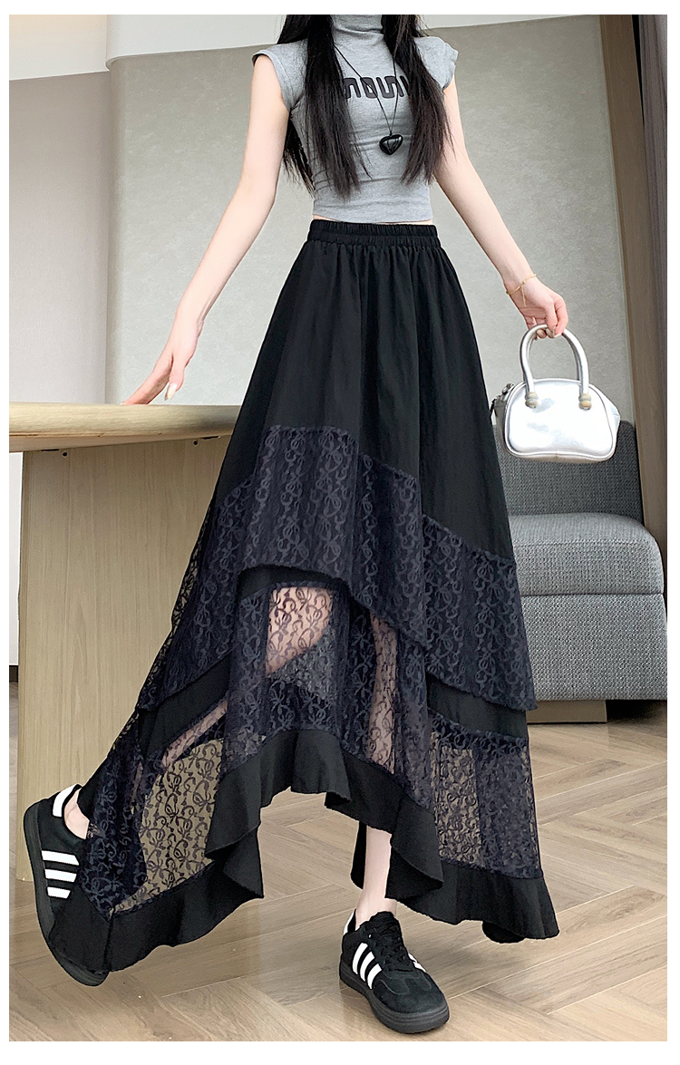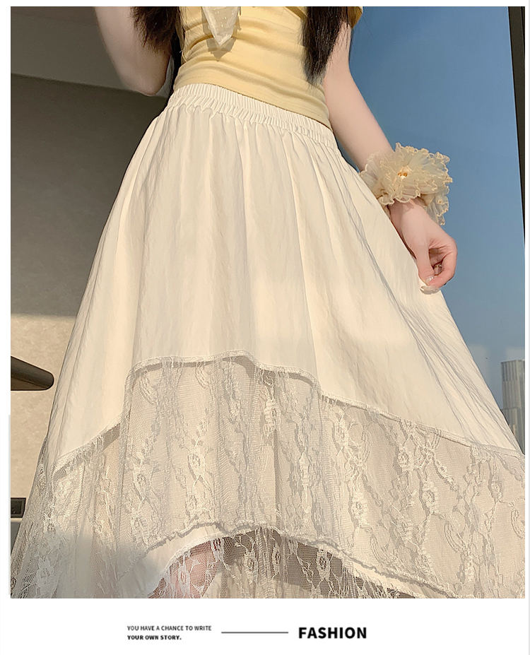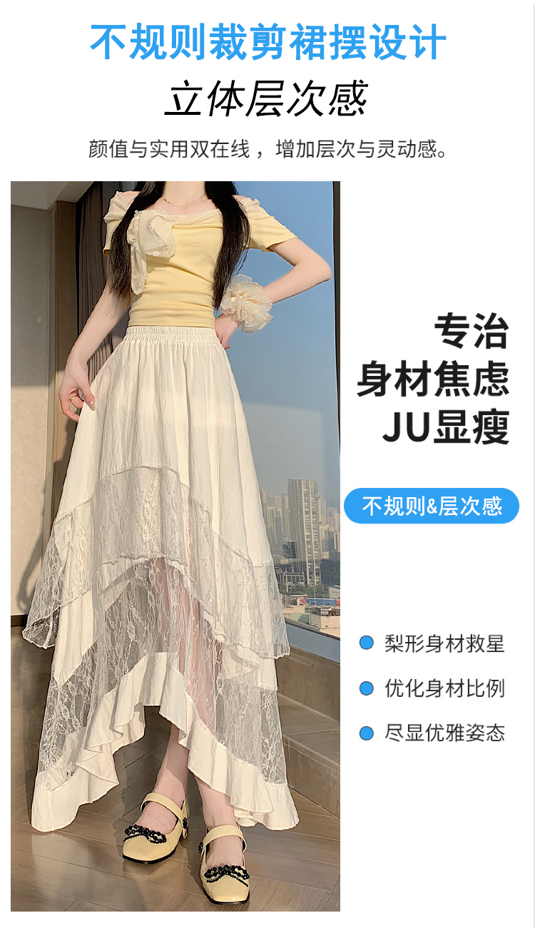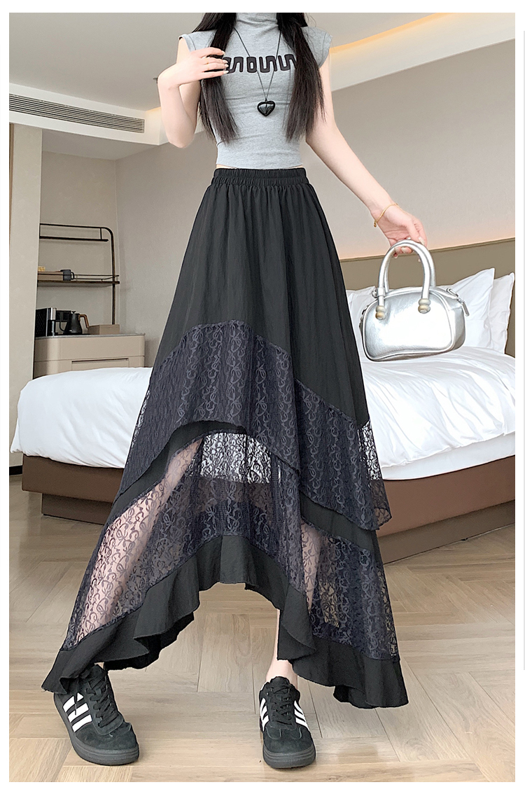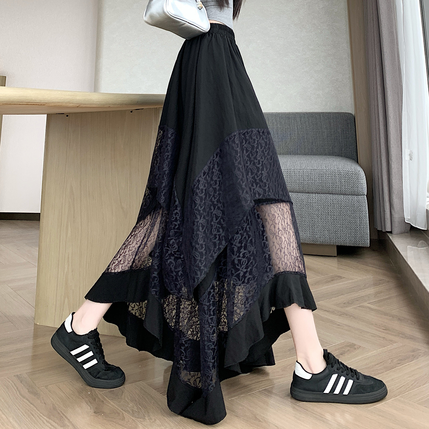실사 2026 여름 새로운 한국 스타일 하이웨이스트 부드러운 바람 망사 패치워크 레이스 중간 스커트 패션 다용도 A라인 스커트