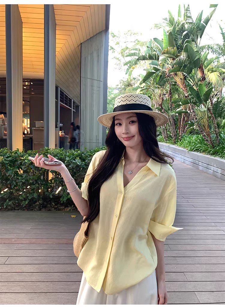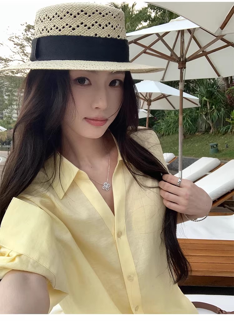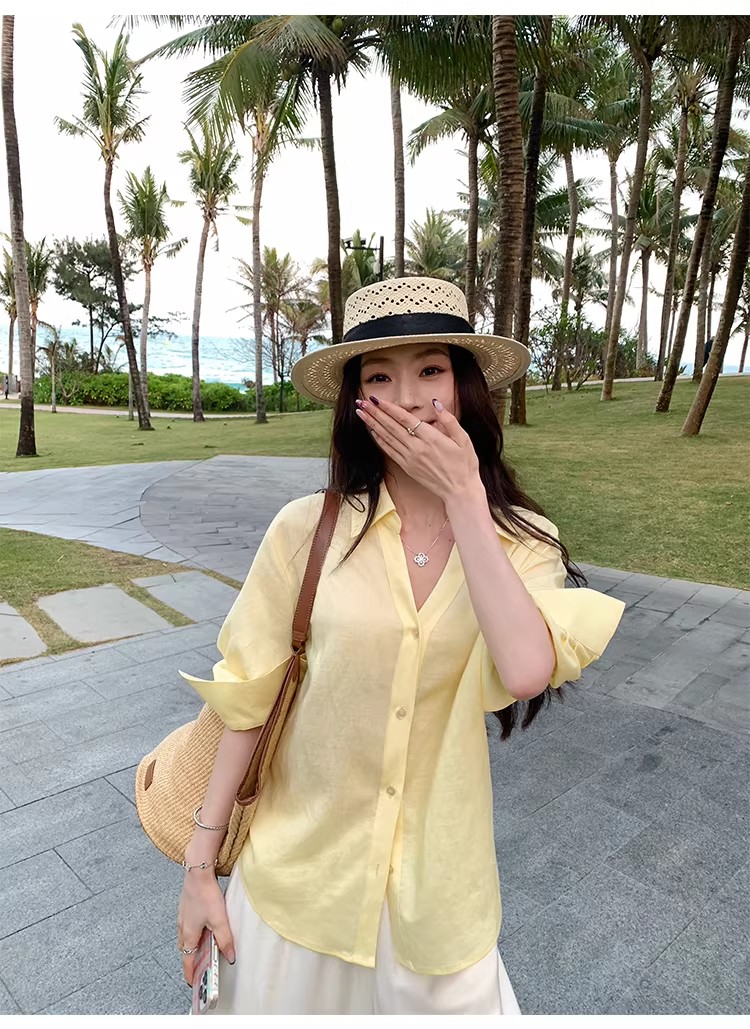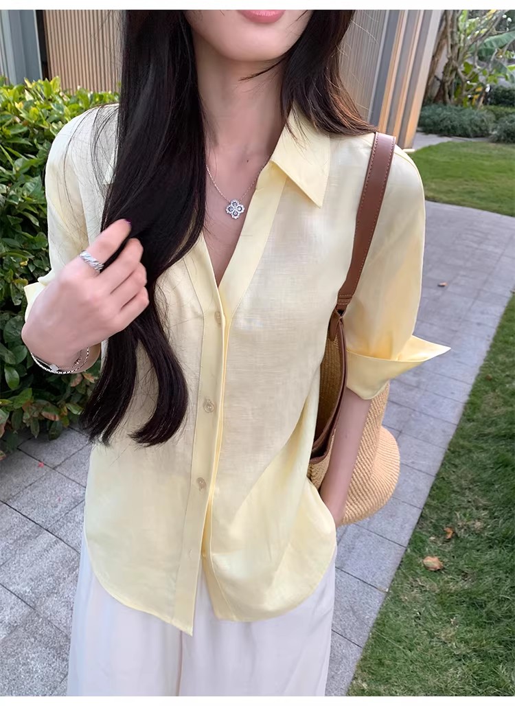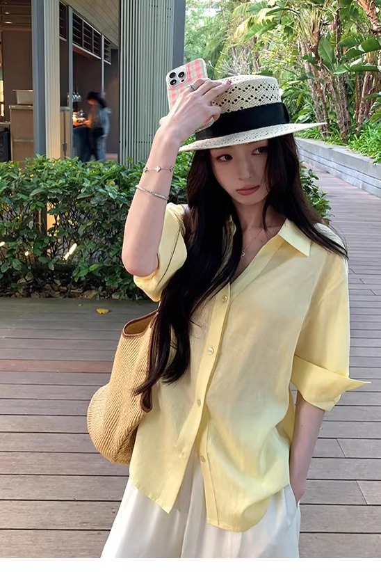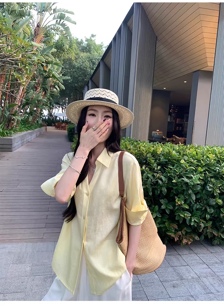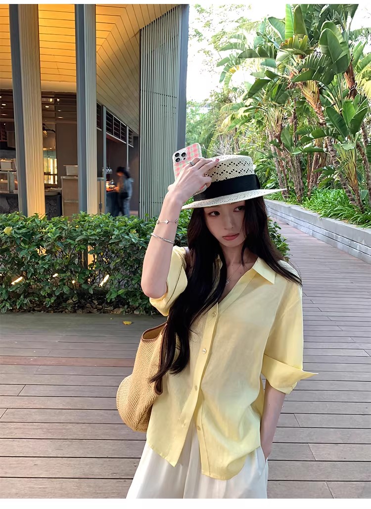 아니요 실사 윌 오목함 모델링 ~ 중 여성 셔츠 2026 여름 폴로 칼라 거품 소매 허리 수축 셔츠