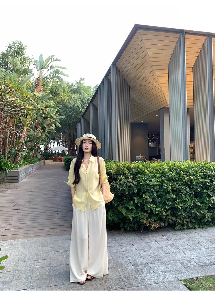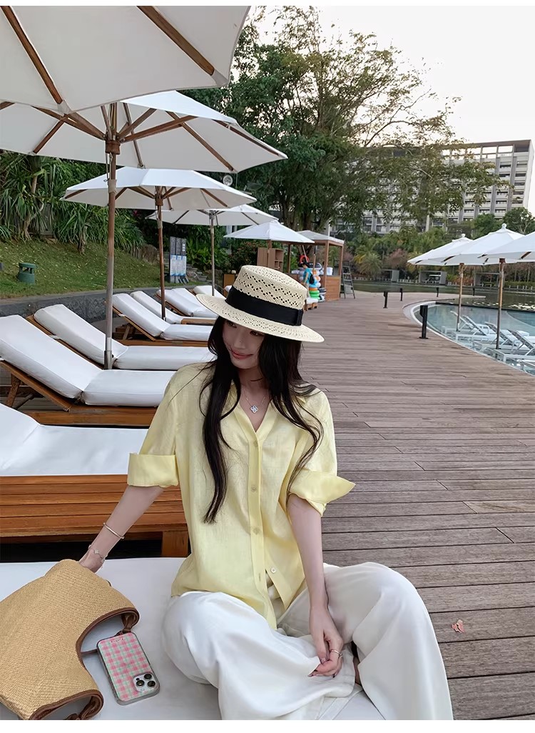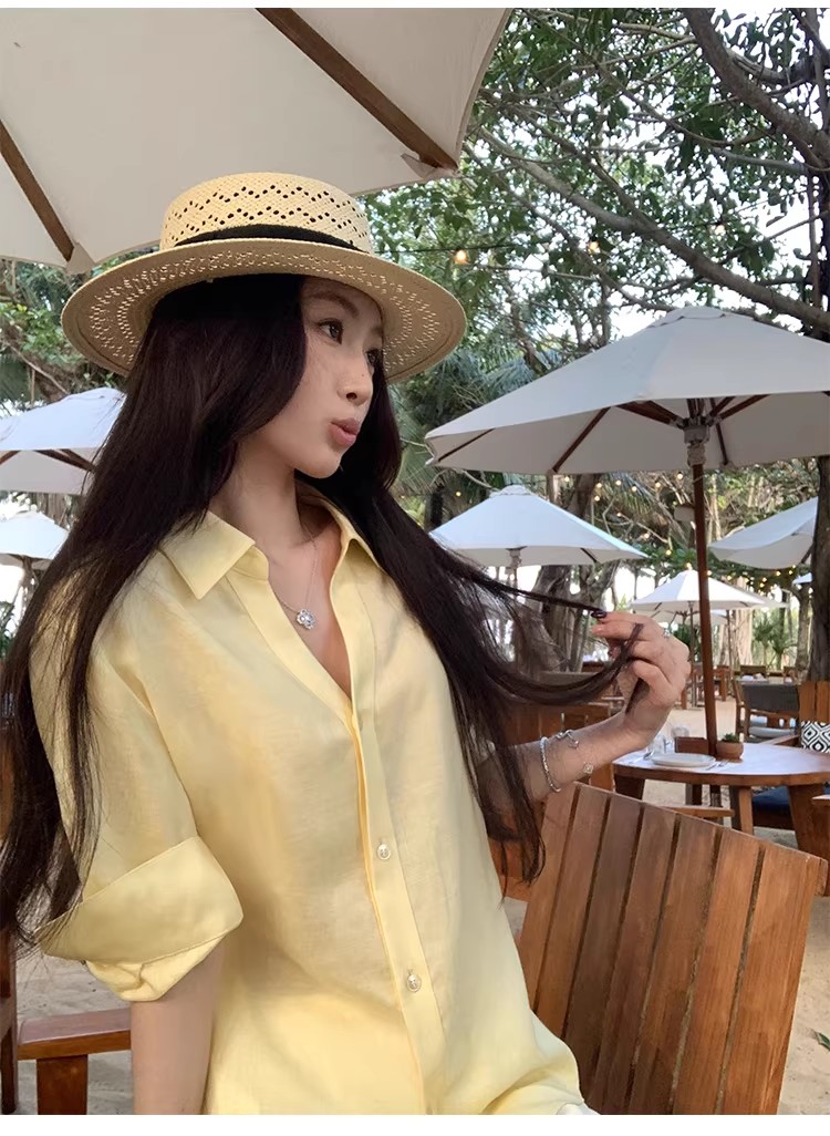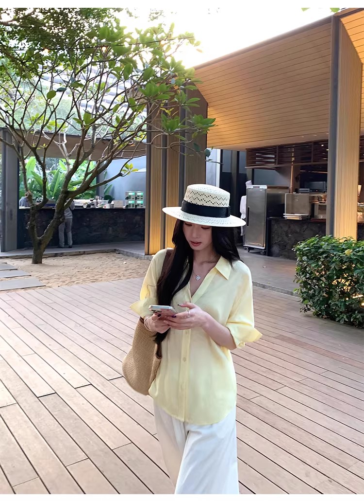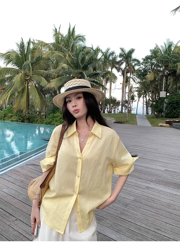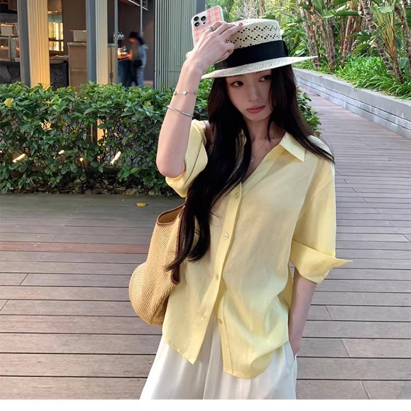 아니요 실사 윌 오목함 모델링 ~ 중 여성 셔츠 2026 여름 폴로 칼라 거품 소매 허리 수축 셔츠