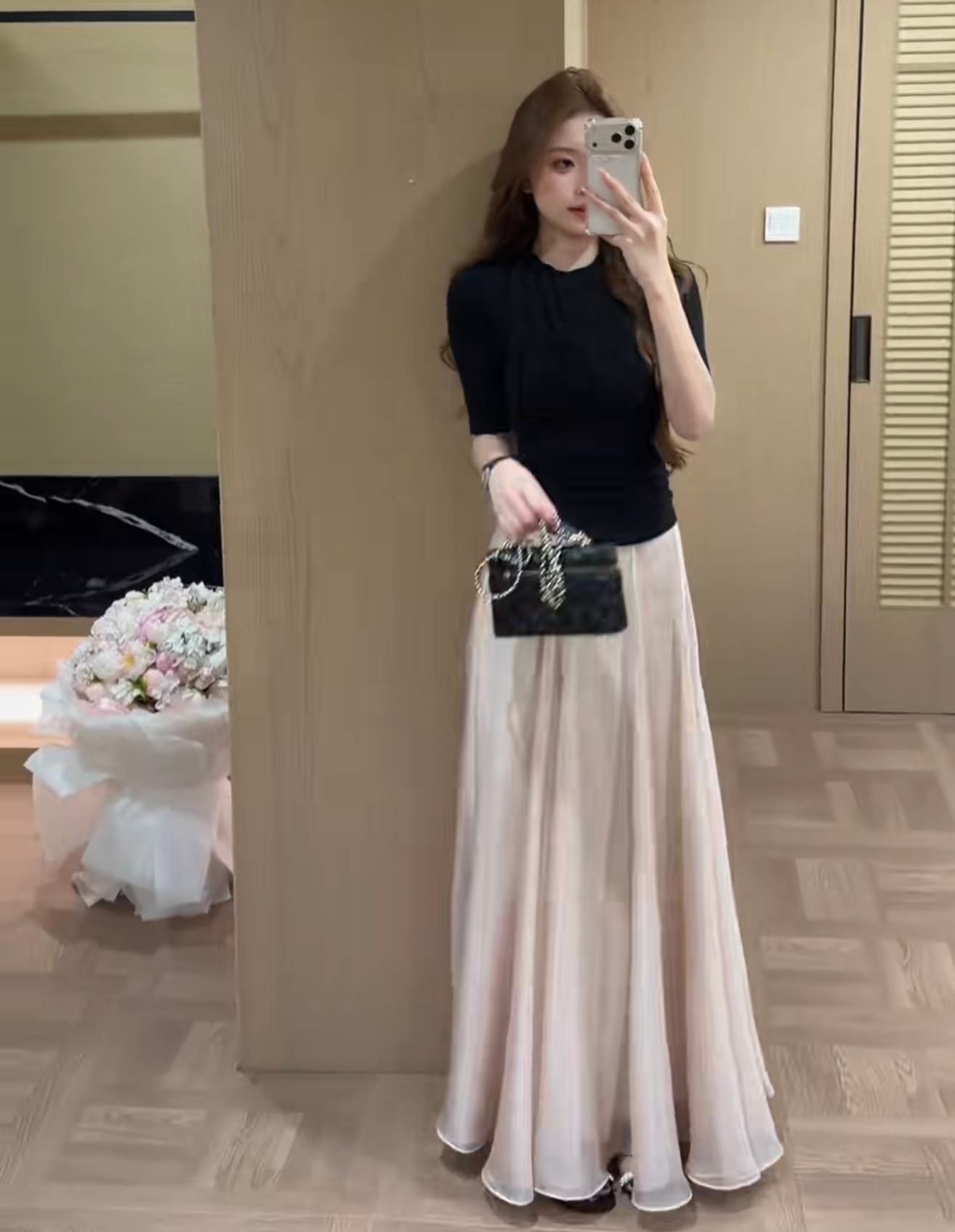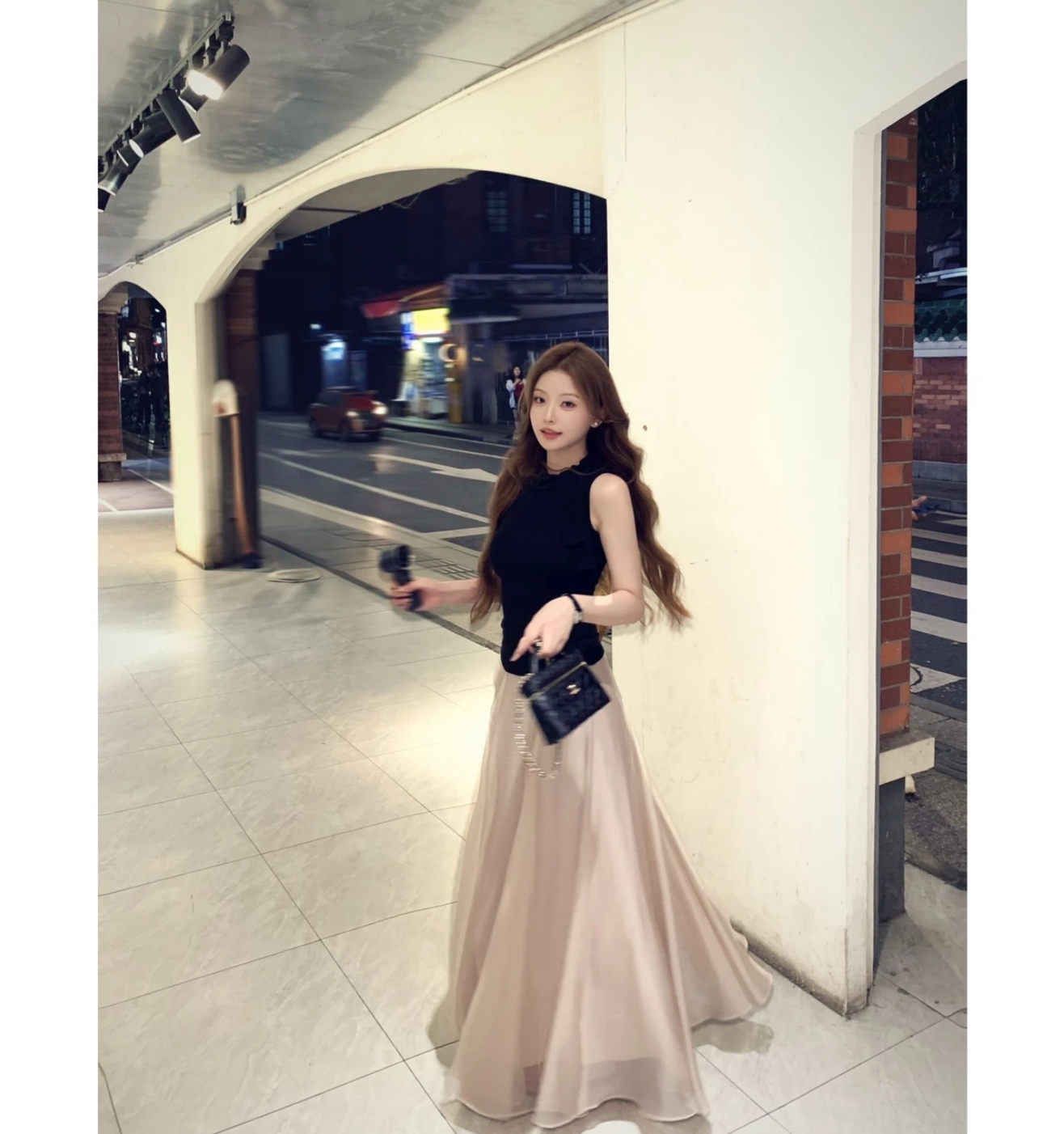 몸매 가꾸기 레이스업 민소매 맨위 중간 소매 맨위 디자인 센스 패션 다용도 슬림해 보이는 반신 스커트 거즈 스커트 세트