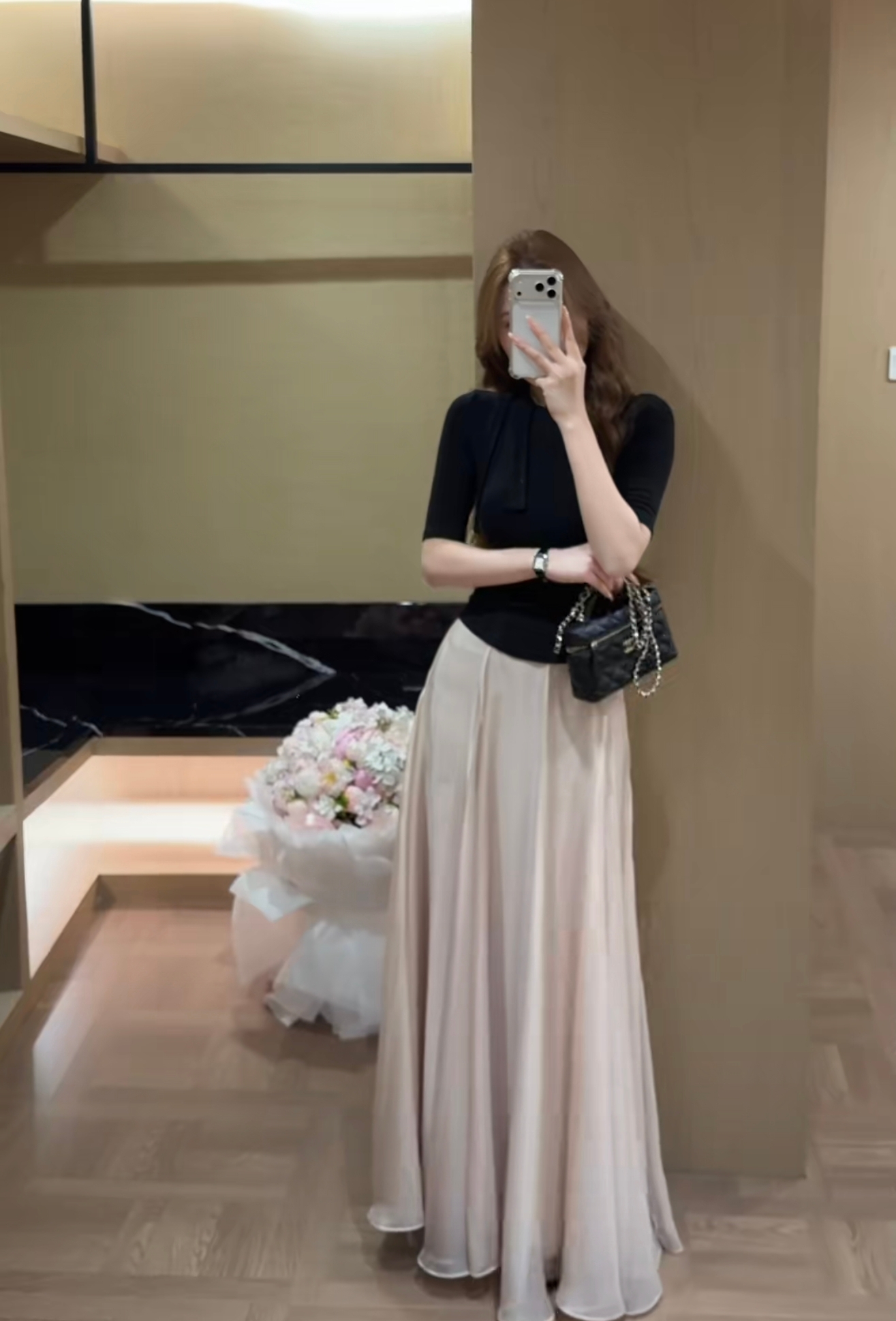 제인 제인 홈 오프숄더 비스듬한 어깨 반팔 품격 새틴 하이웨이스트 다용도 도루 센스 슬림해 보이는 플리츠 반신 치마 세트