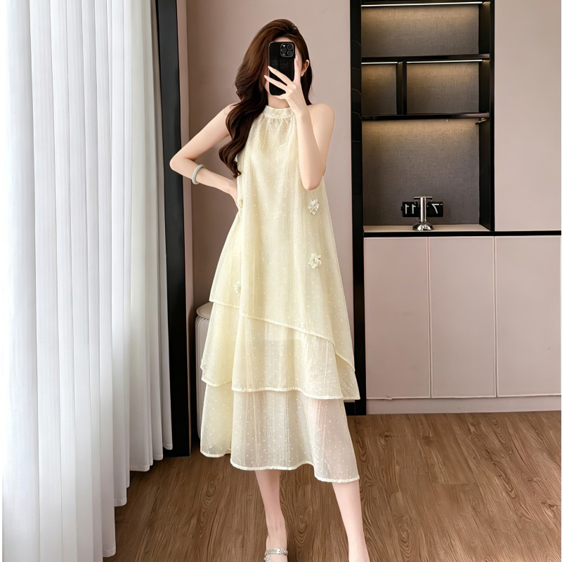 프랑스식 아름다운 고유 한 민소매 행침 목 여성 드레스 여름 아름다운 휴가 바람이 아닙니다. 규칙 길다 치마