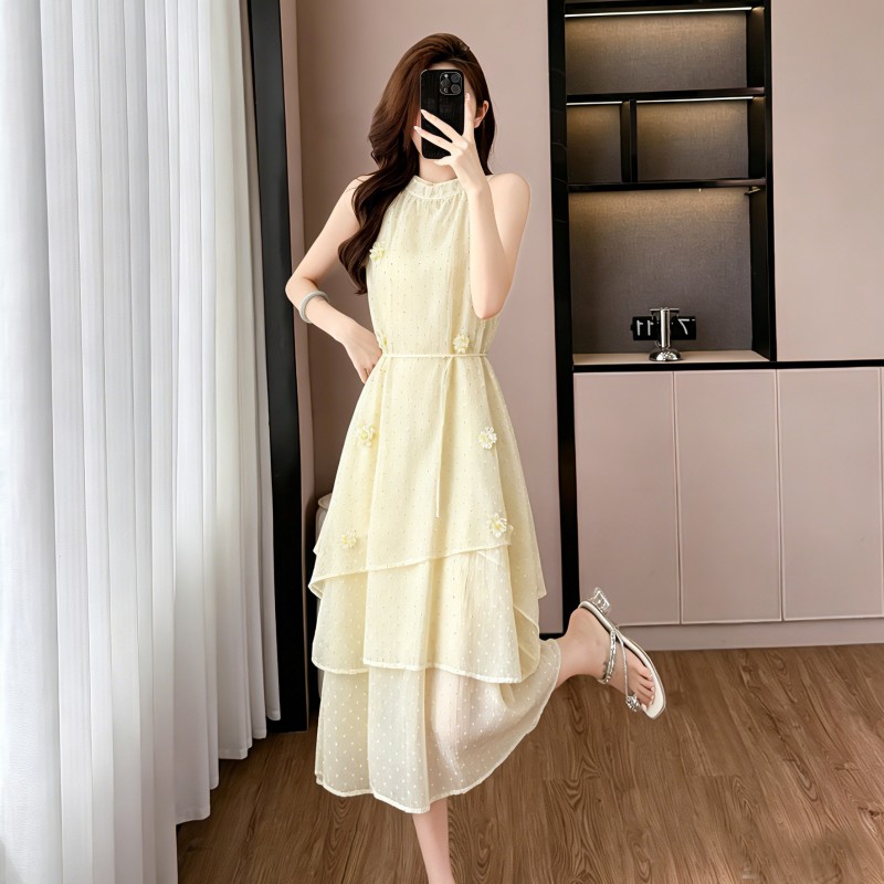 프랑스식 전원 바람 황색 슬립 길다 치마 3 차원 꽃 소녀 센스 해변가 휴가 바람 여성 드레스