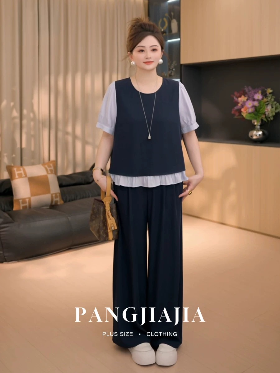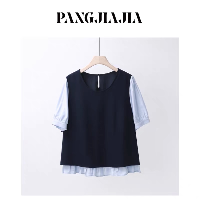 빅 사이즈 여성 의류 도파민 황색 자수 페이크 레이어드 반팔 셔츠 맨위 여름 새로운 루즈핏 품격 셔츠