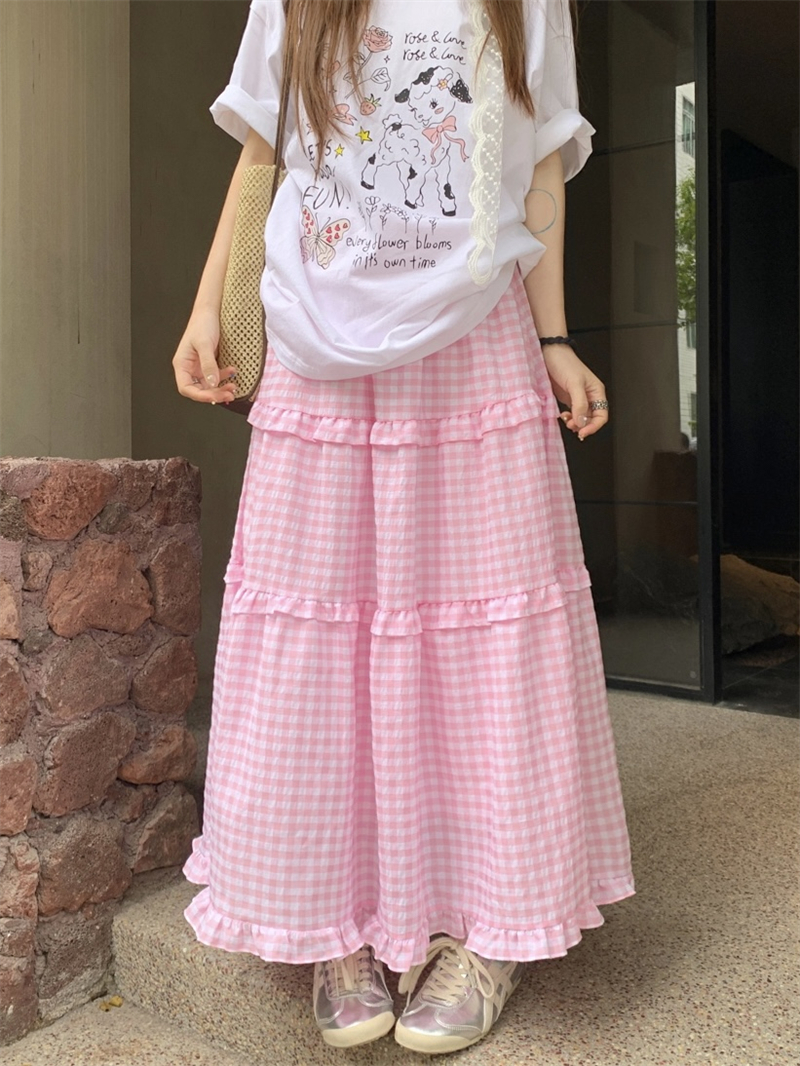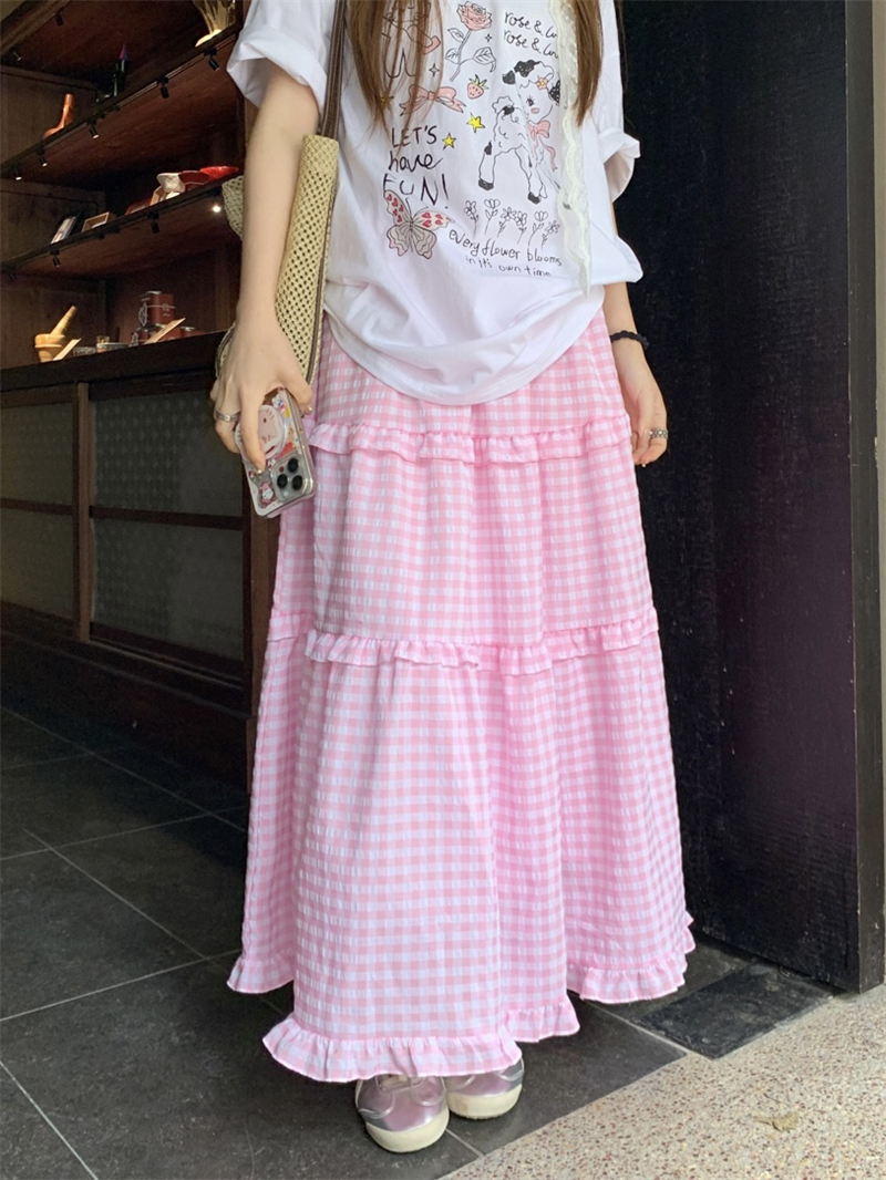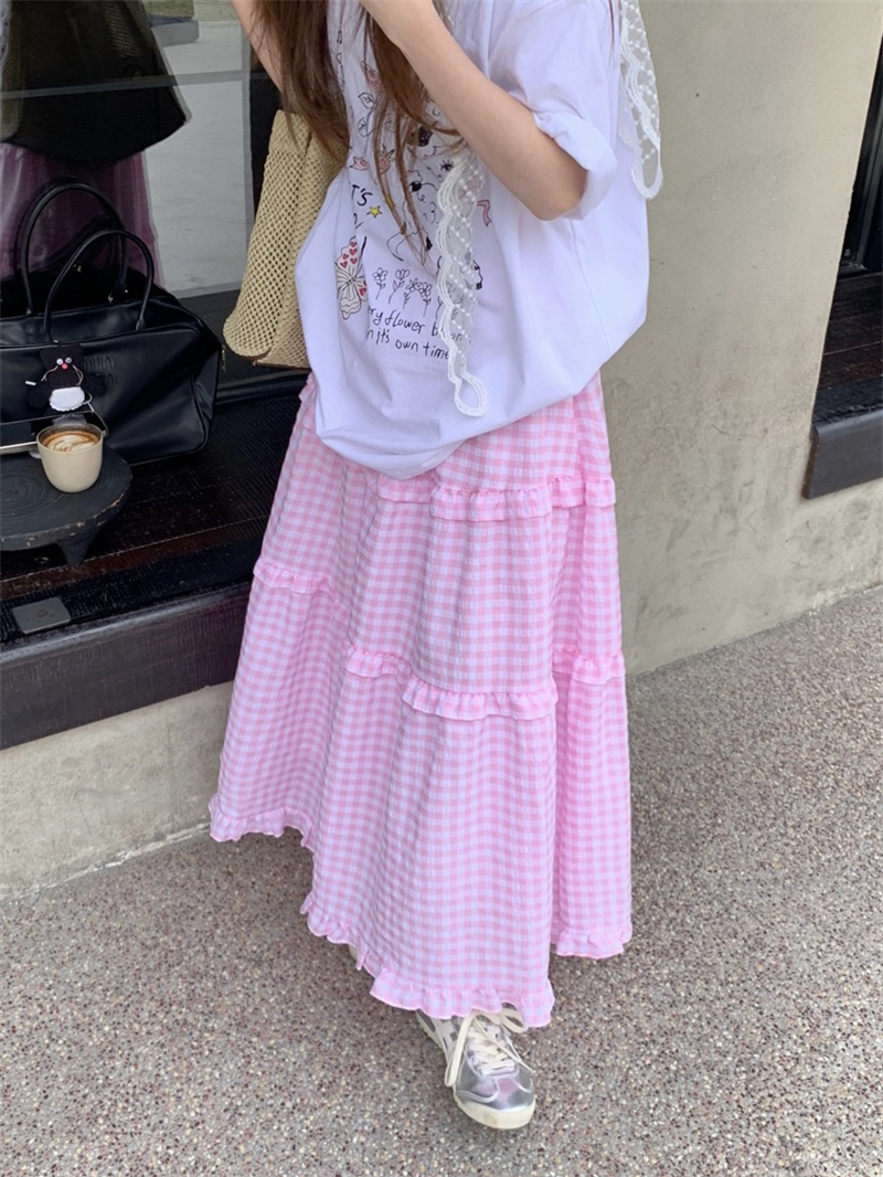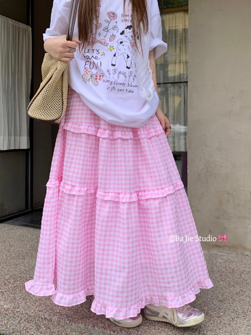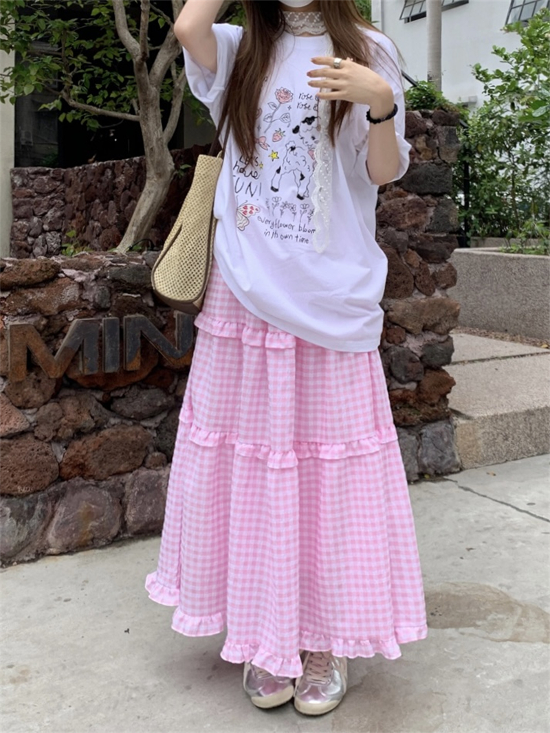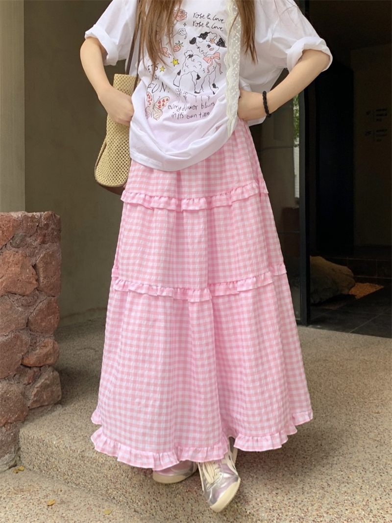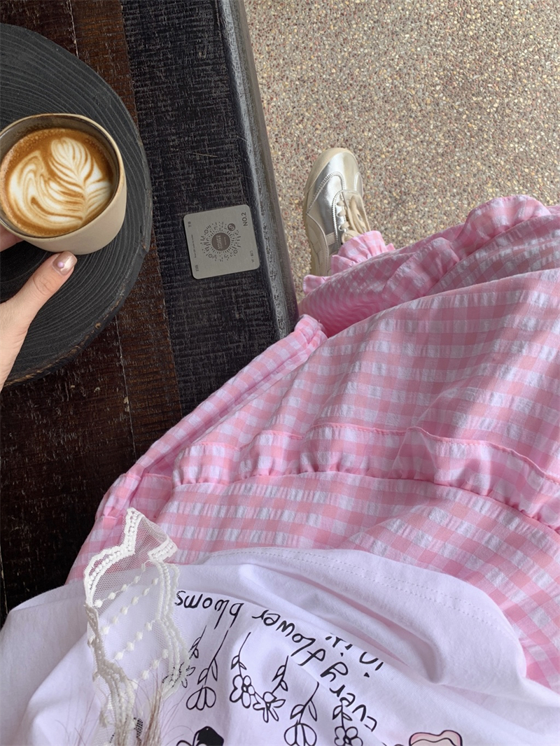 실사 정가 새로운 한국 스타일 여름 분말 분말 부드러운 체크무늬 하이웨이스트 패치워크 레이스 무거운 작업 케이크 반신 스커트