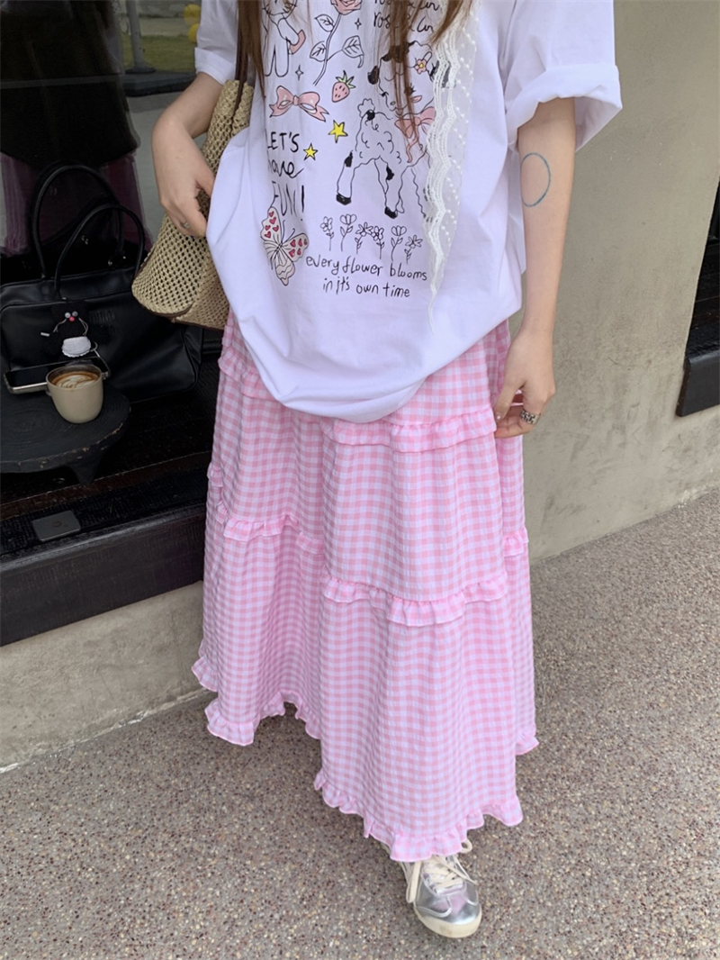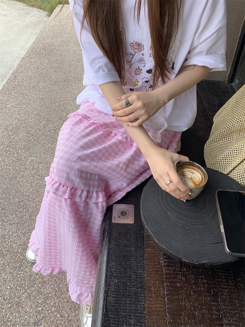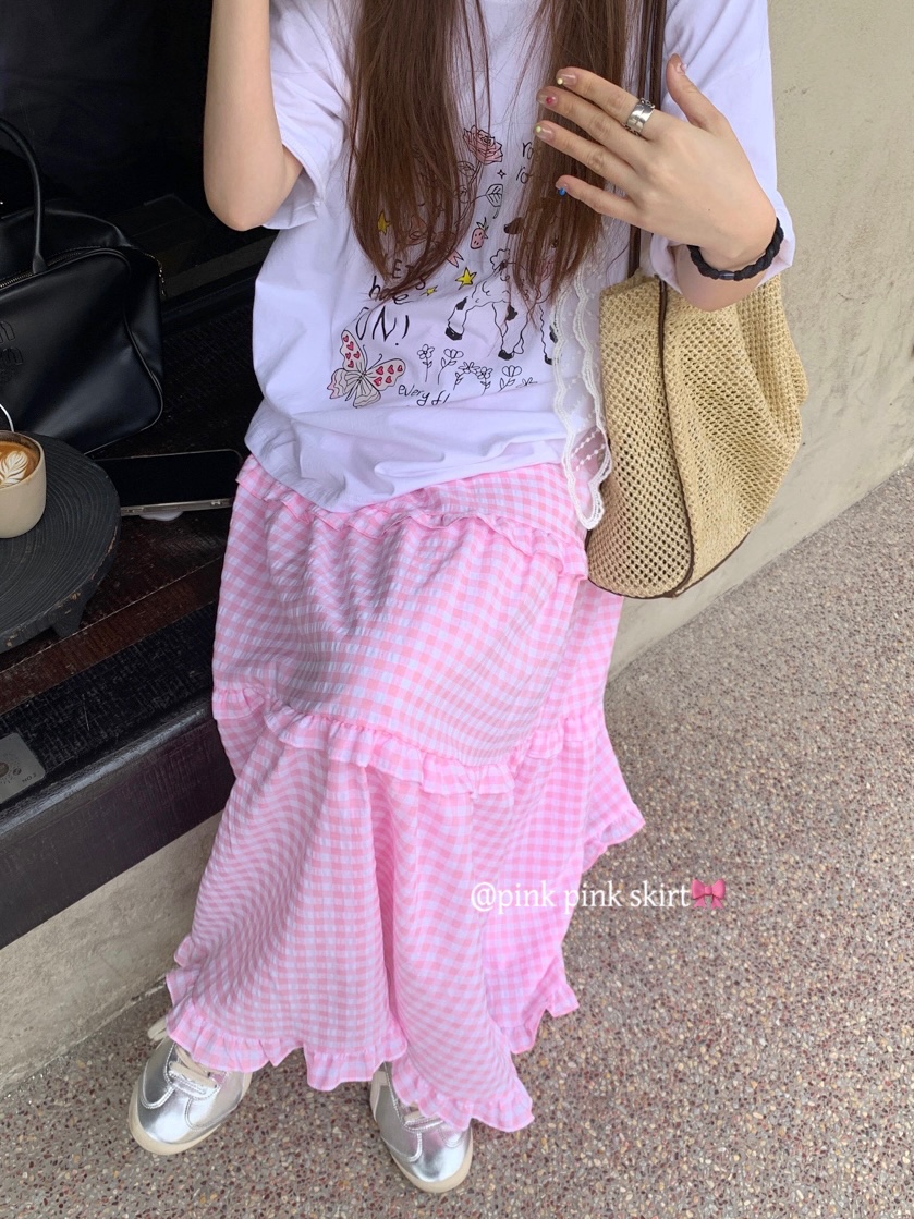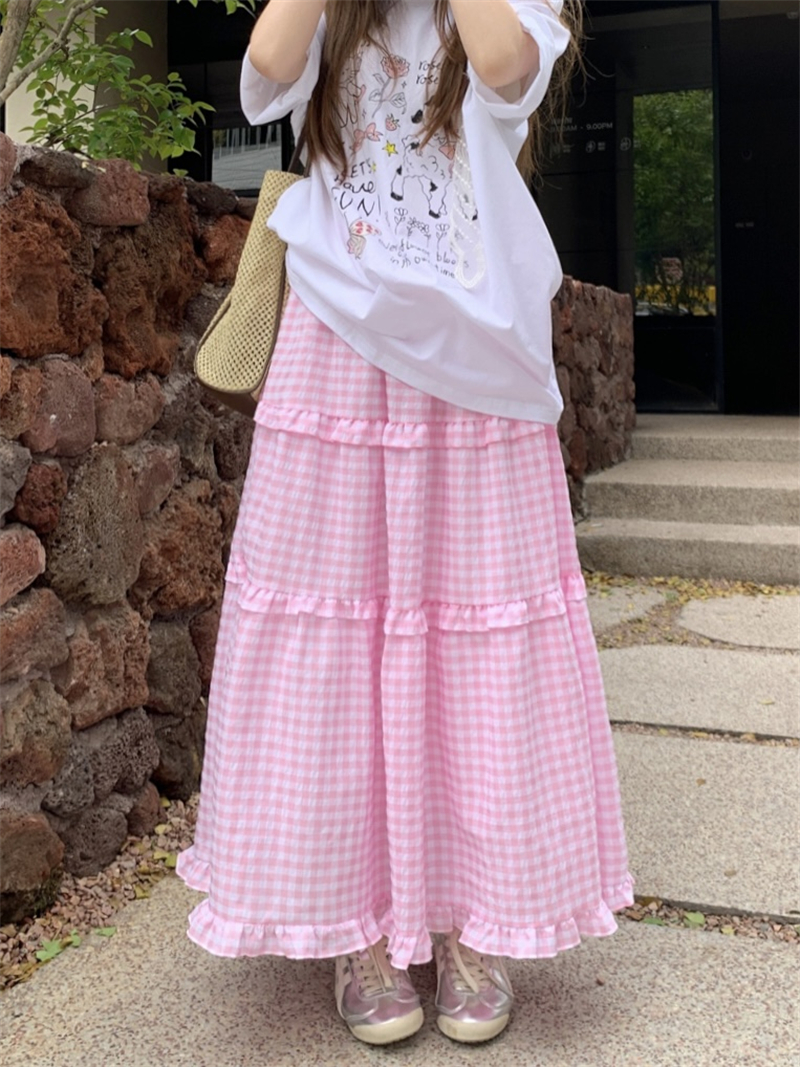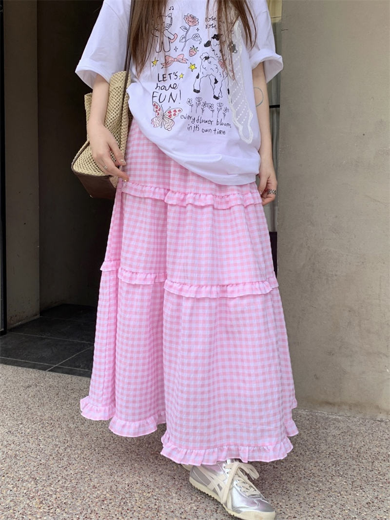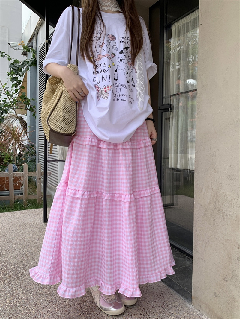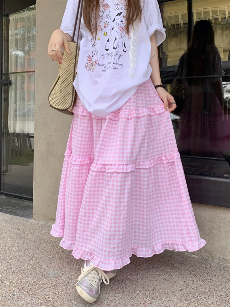 실사 정가 새로운 한국 스타일 여름 분말 분말 부드러운 체크무늬 하이웨이스트 패치워크 레이스 무거운 작업 케이크 반신 스커트