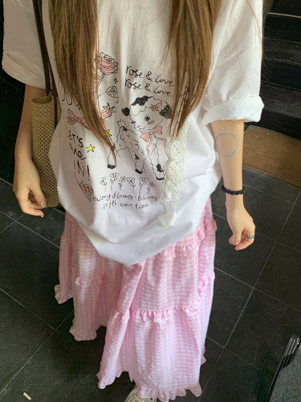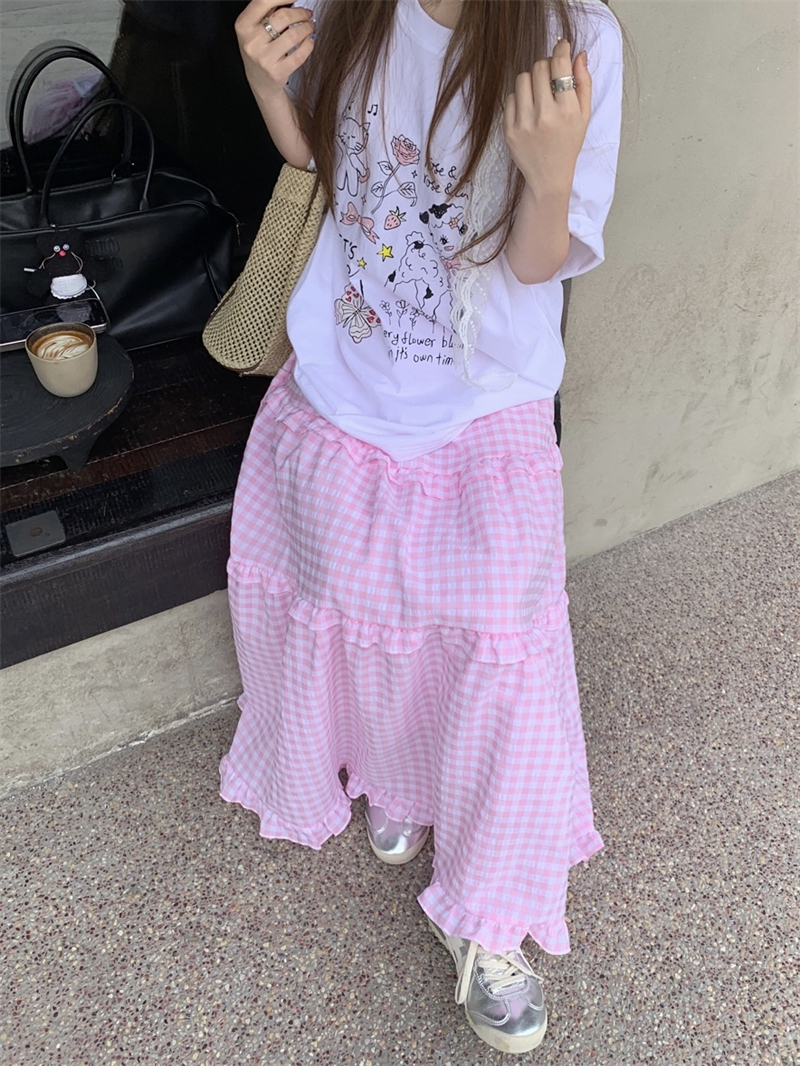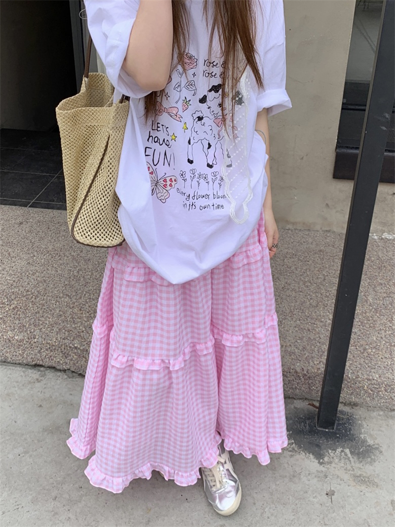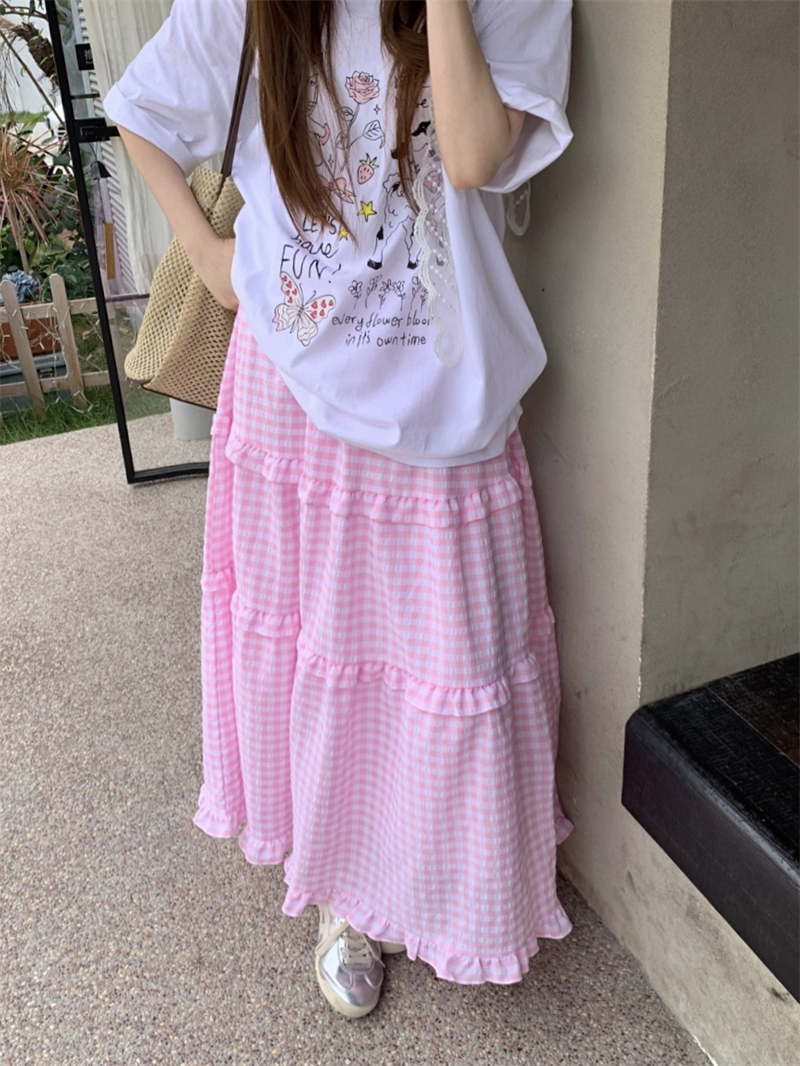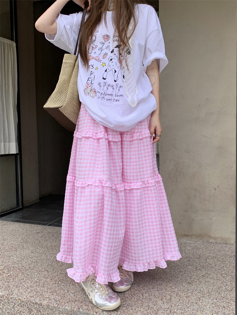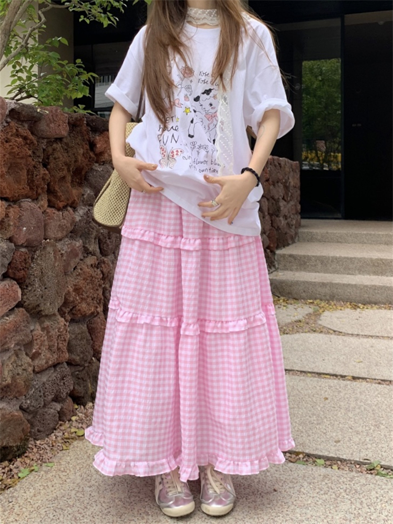 실사 정가 새로운 한국 스타일 여름 분말 분말 부드러운 체크무늬 하이웨이스트 패치워크 레이스 무거운 작업 케이크 반신 스커트