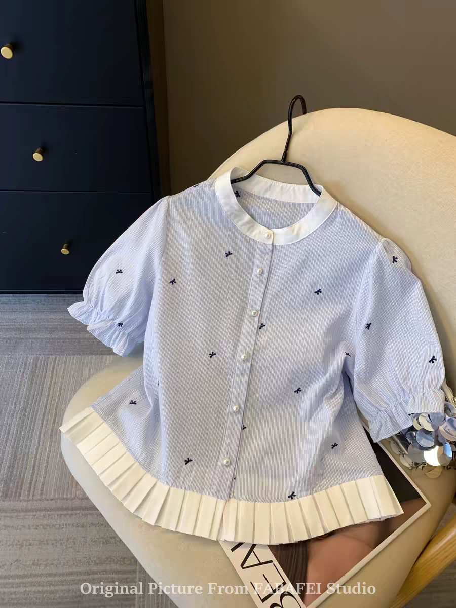 프랑스식 아름다운 프린트 패치워크 주름 행침 목 맨위 여성 2026 슈퍼 잘 생긴 작은 대중 Chic 슬림해 보이는 얇고 가벼운 작은 셔츠