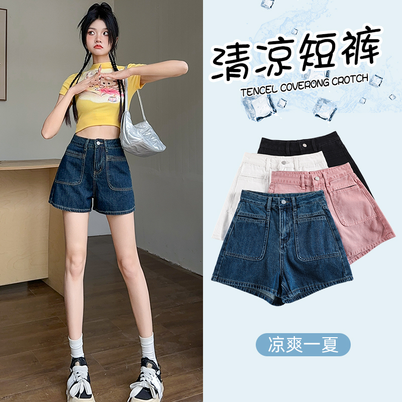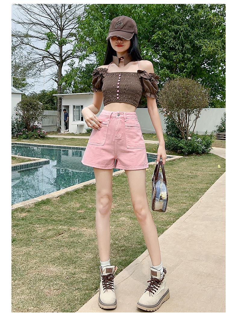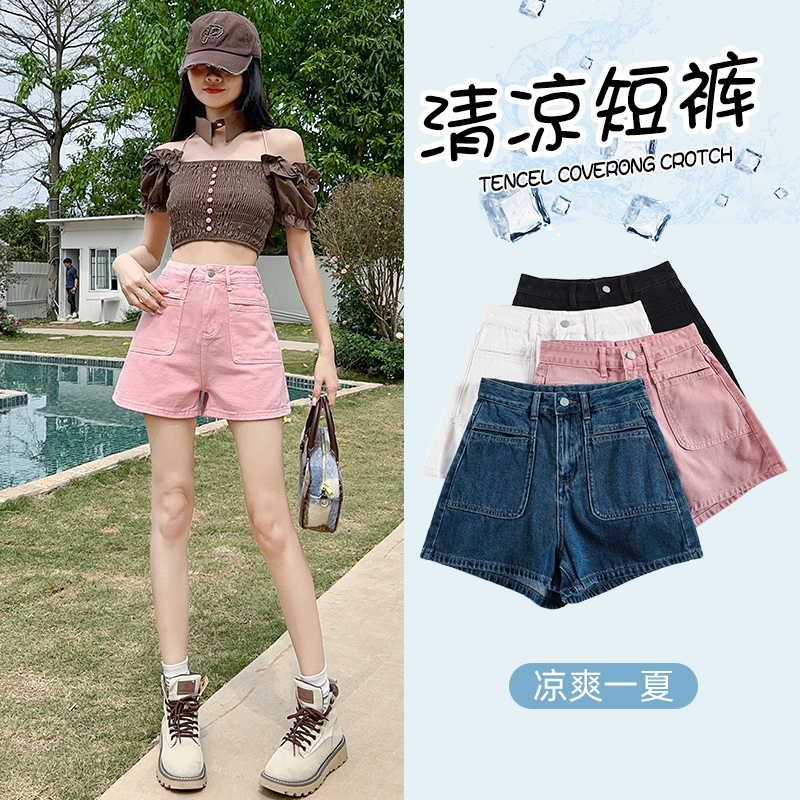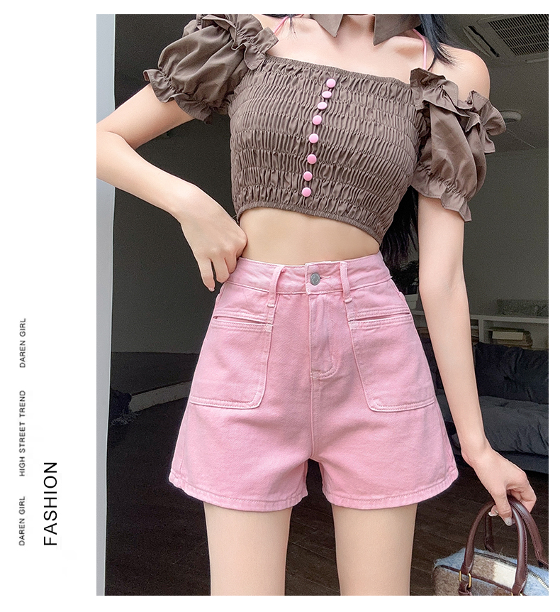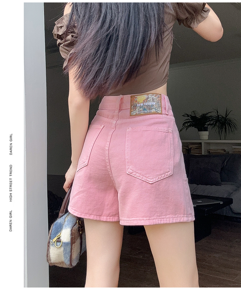 실사 핑크색 데님 짧은 치마바지 여성 여름 얇은 스타일 하이웨이스트 슬림해 보이는 반바지 디자인 센스 인터넷 유명인 핫걸 뜨거운 바지