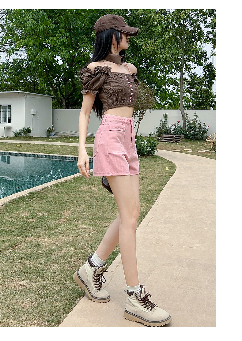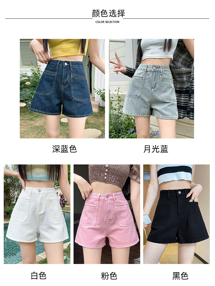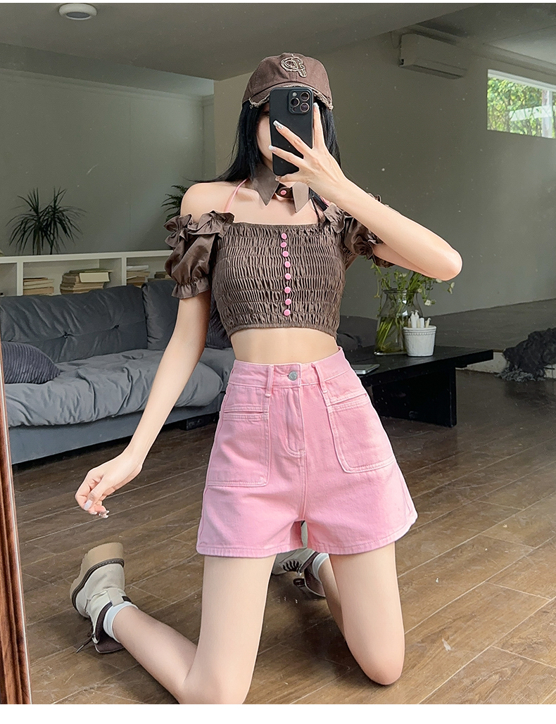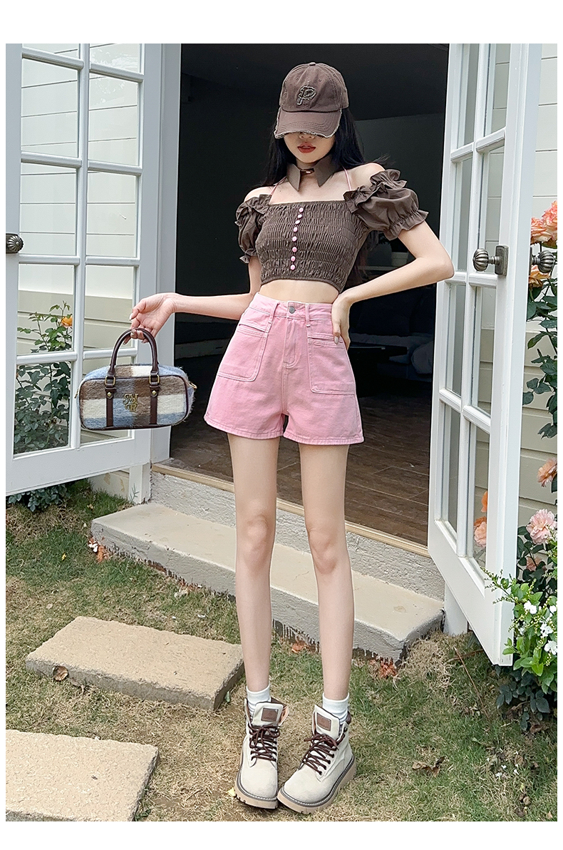 실사 핑크색 데님 짧은 치마바지 여성 여름 얇은 스타일 하이웨이스트 슬림해 보이는 반바지 디자인 센스 인터넷 유명인 핫걸 뜨거운 바지