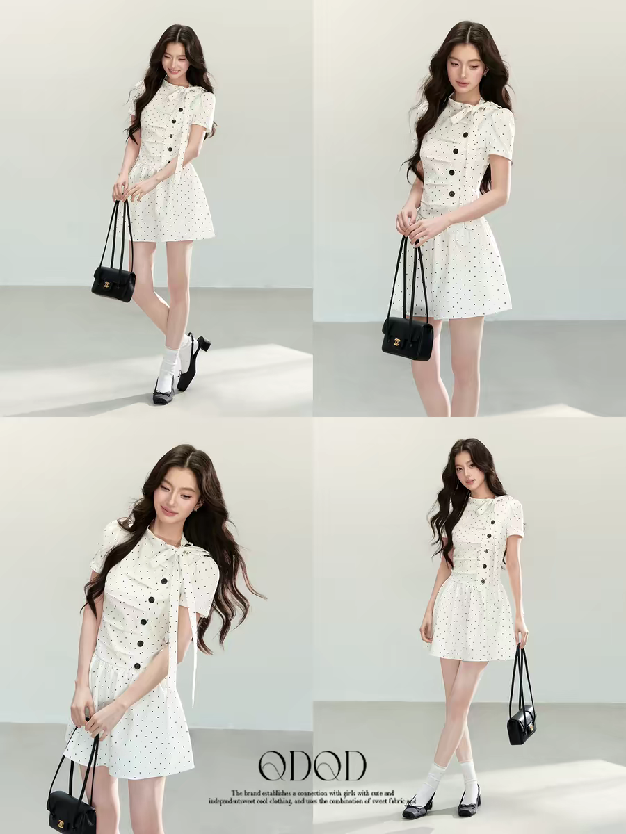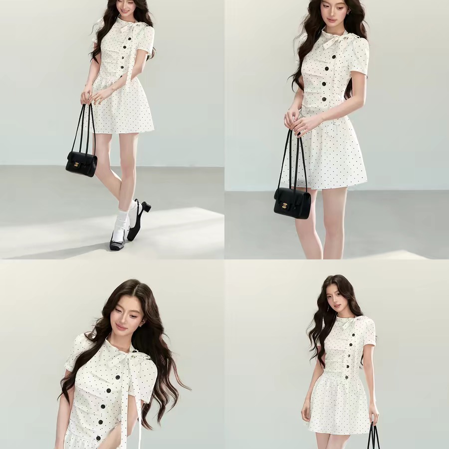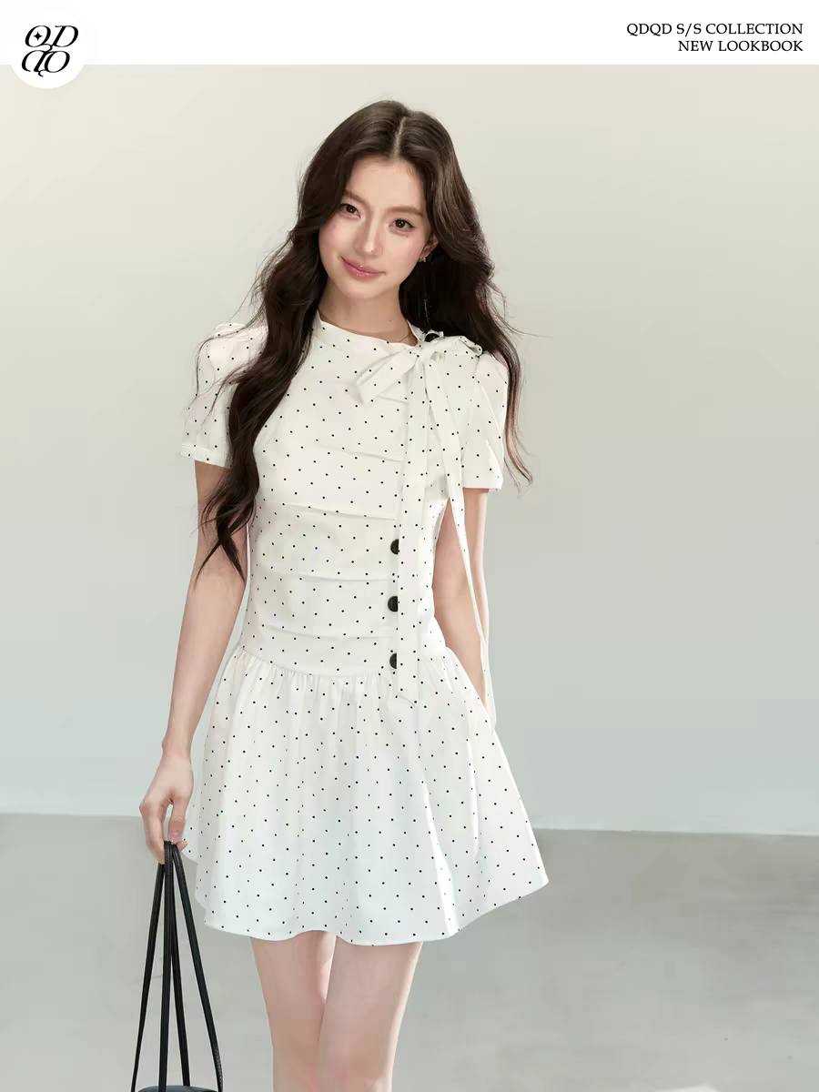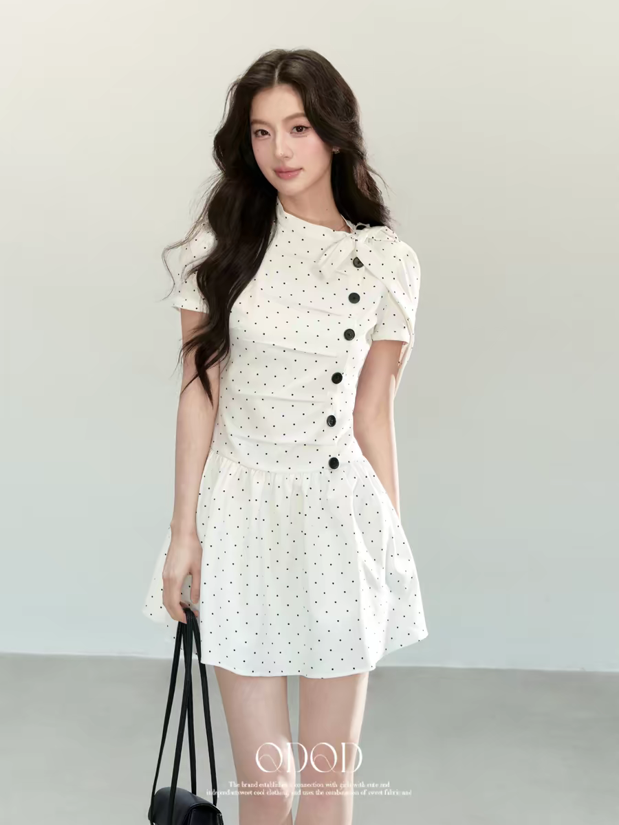 한 부서 디자인 센스 화이트 도트 무늬 드레스 여름 새로운 주름 디자인 센스 학원 스타일 소녀 치마