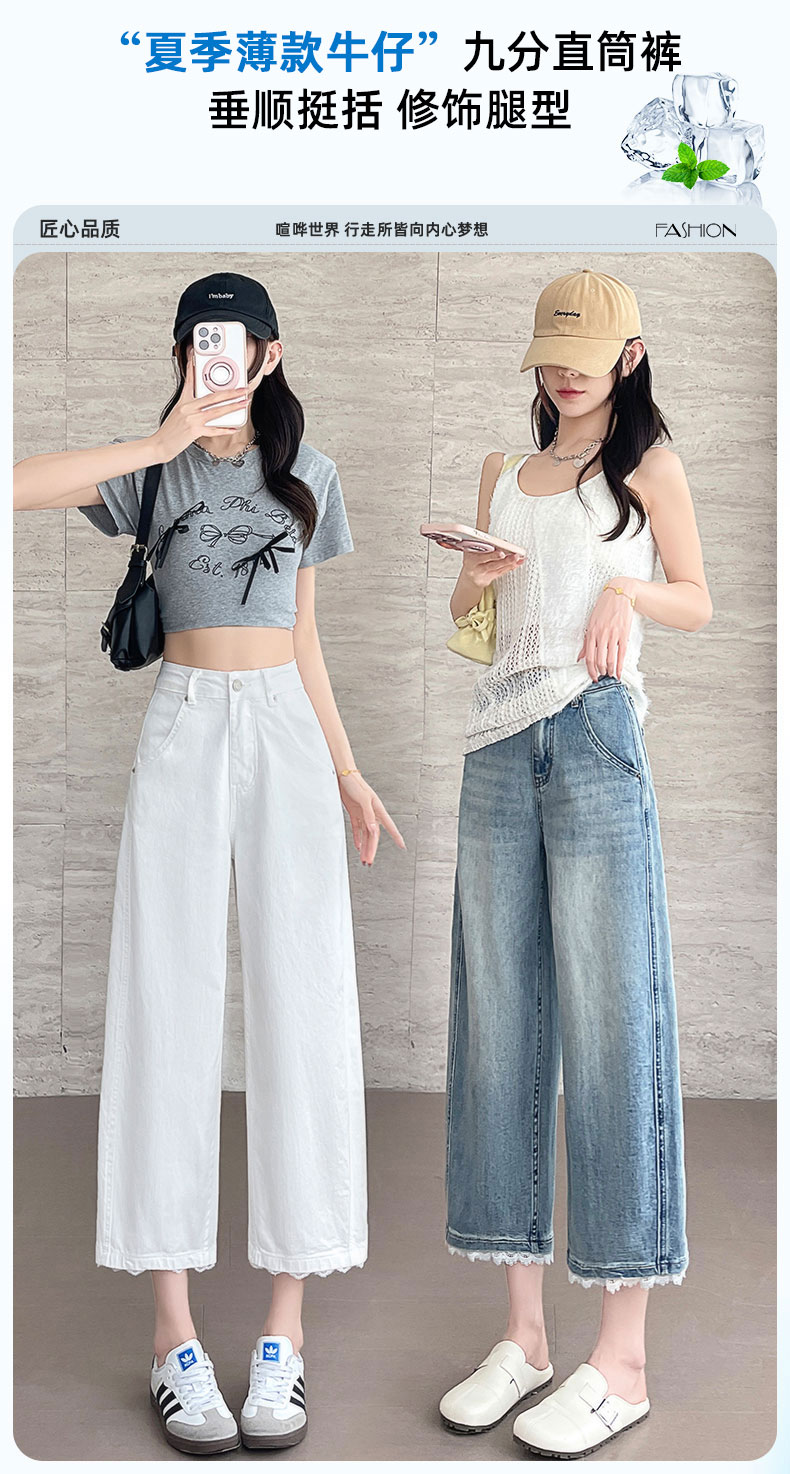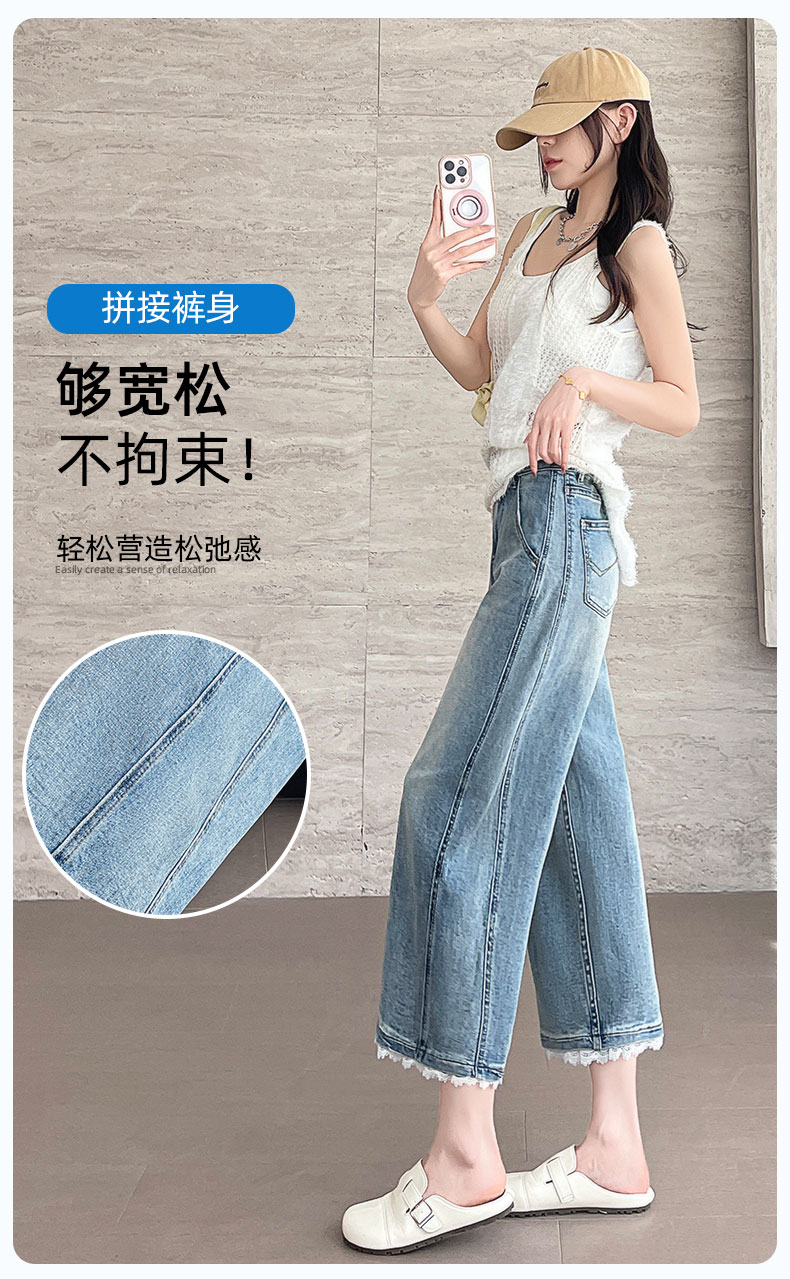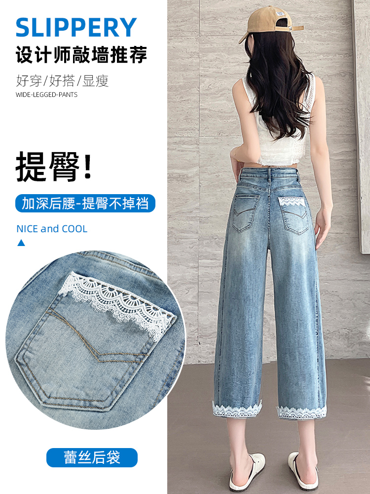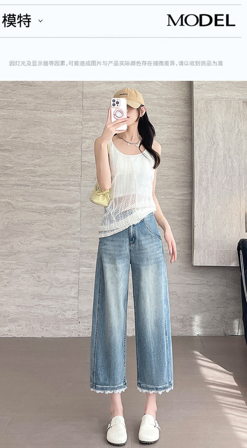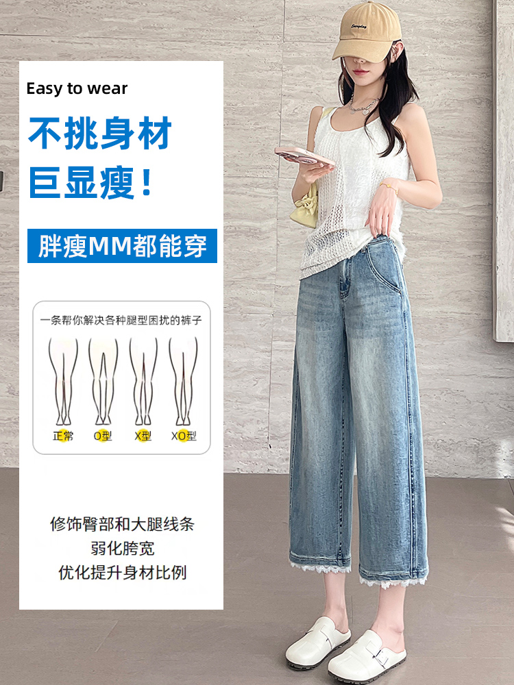 실사 작은 키 8 점 밝은색 넓은 다리 청바지 여성 여름 얇은 스타일 하이웨이스트 루즈핏 디자인 센스 할머니 바지 여성