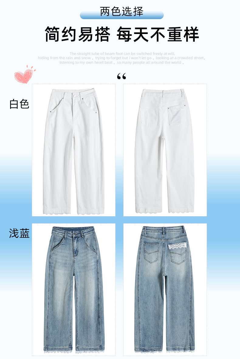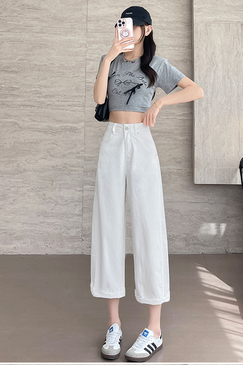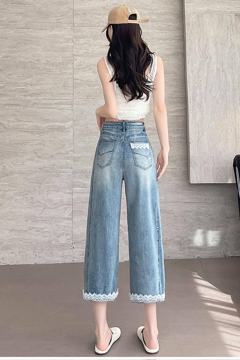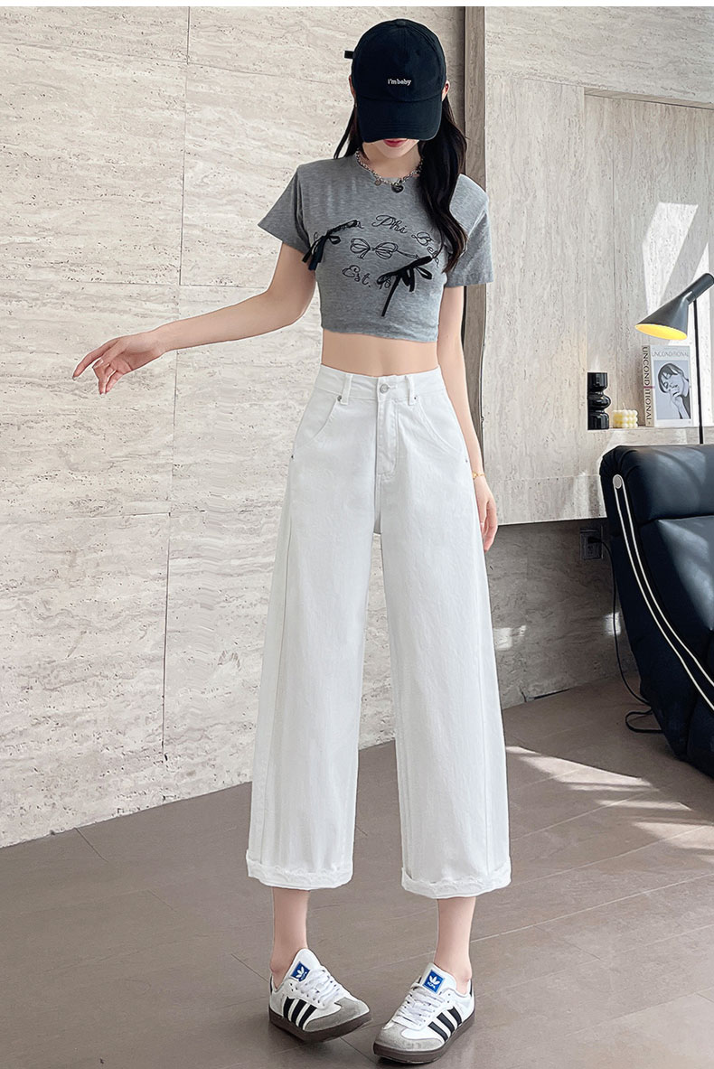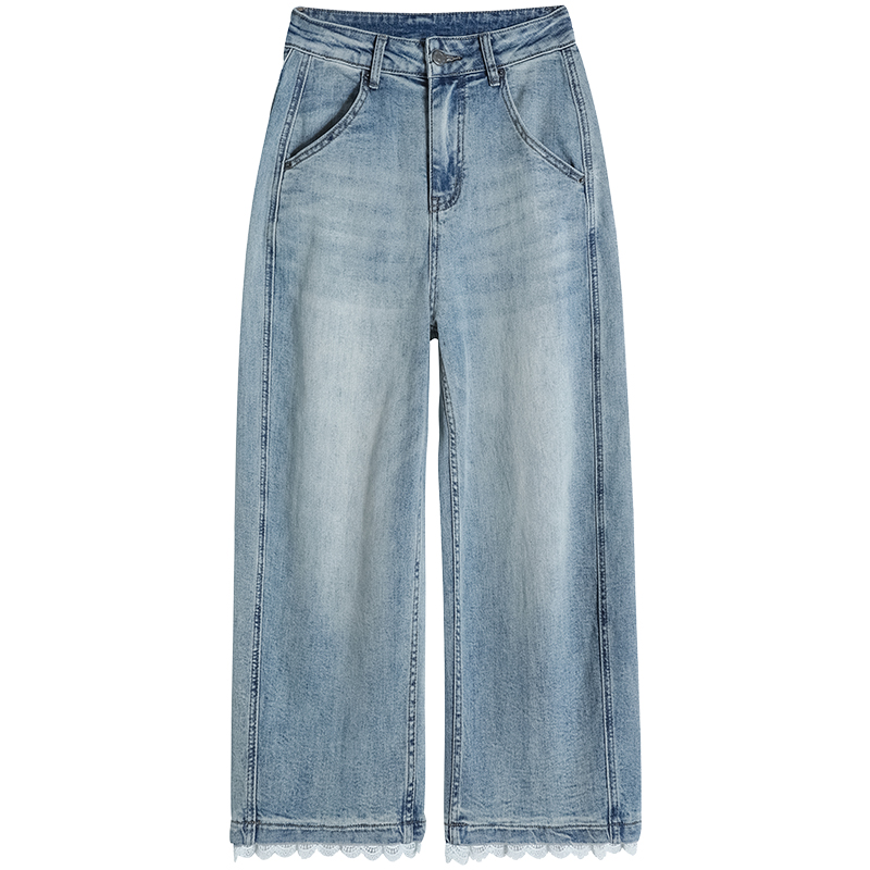 실사 작은 키 8 점 밝은색 넓은 다리 청바지 여성 여름 얇은 스타일 하이웨이스트 루즈핏 디자인 센스 할머니 바지 여성