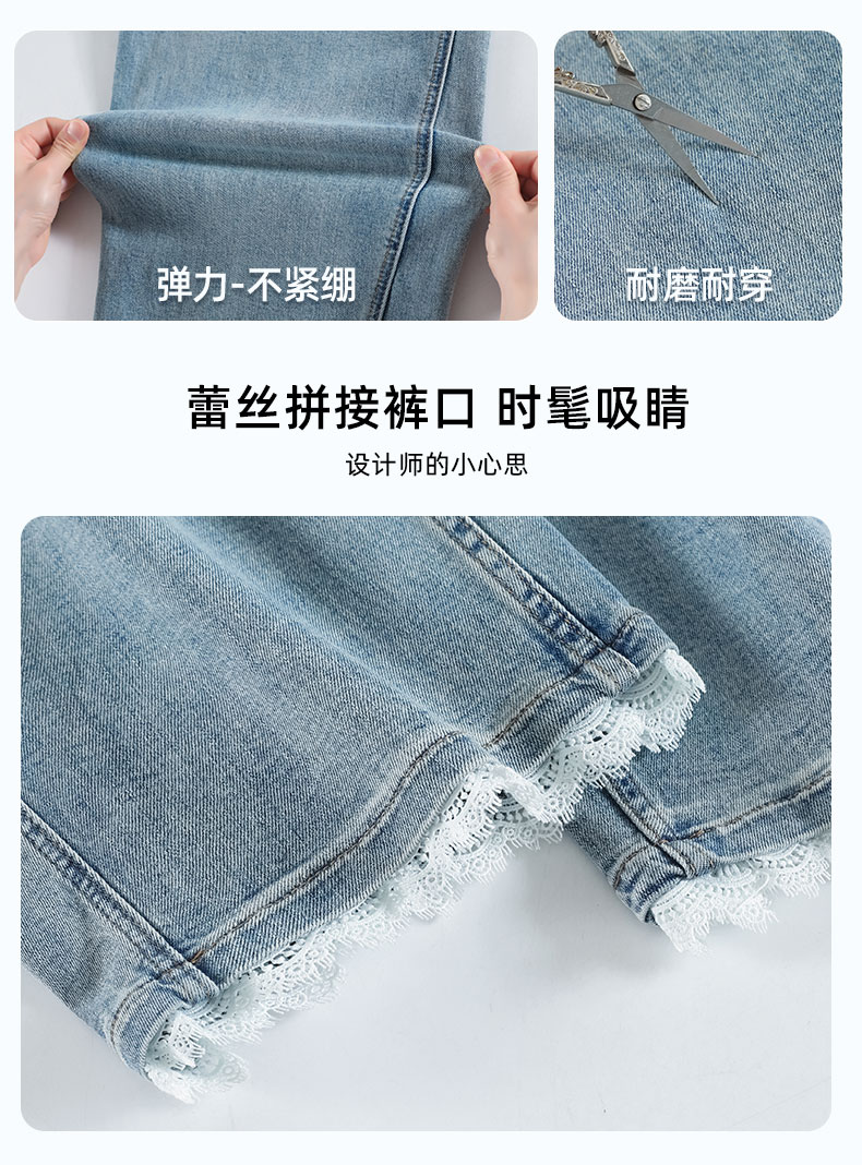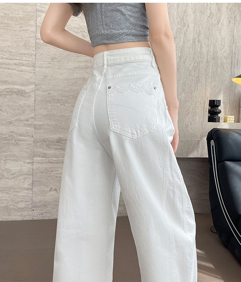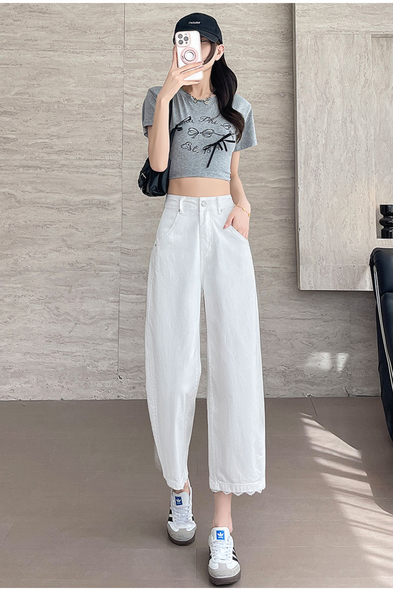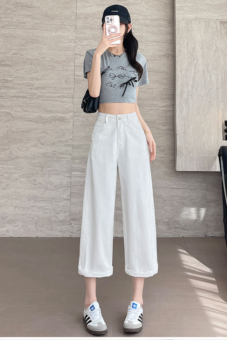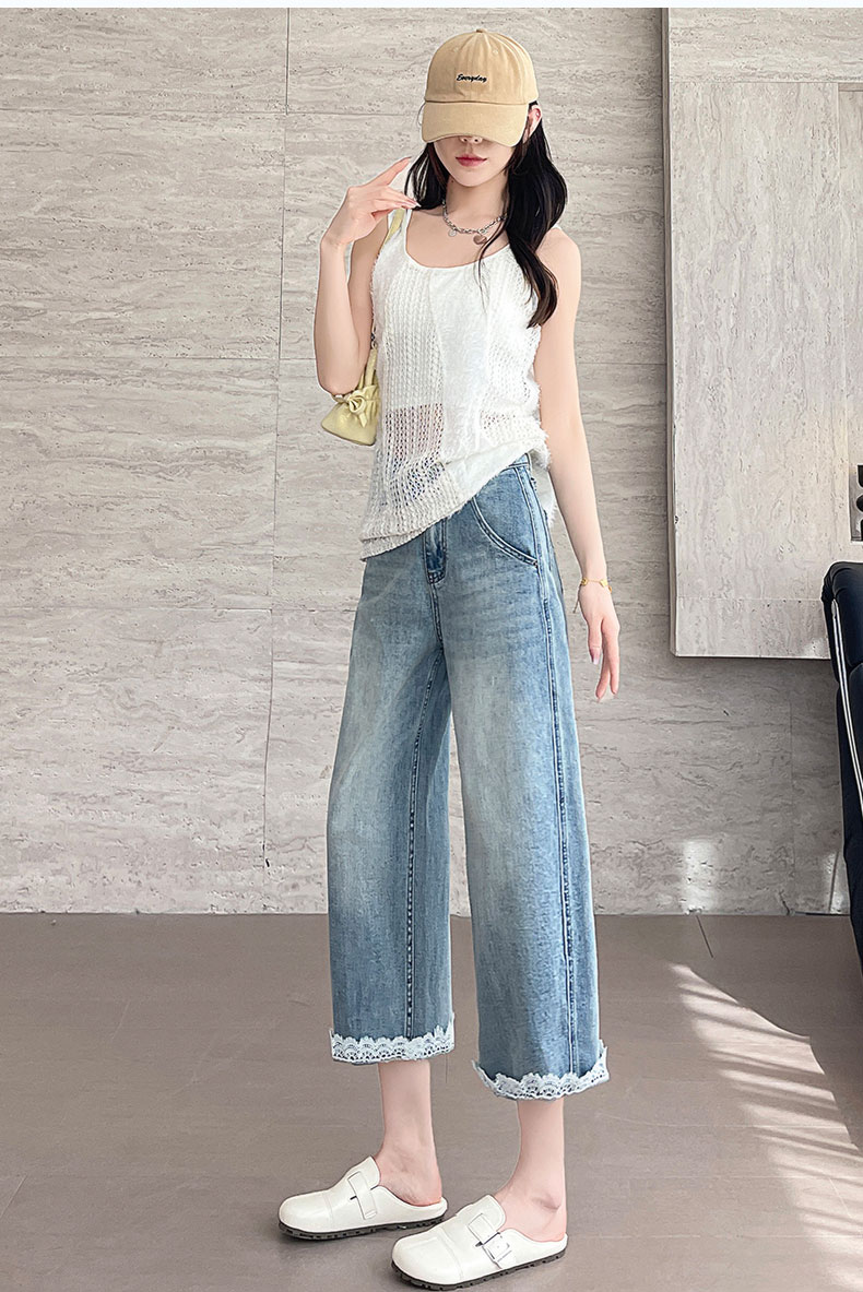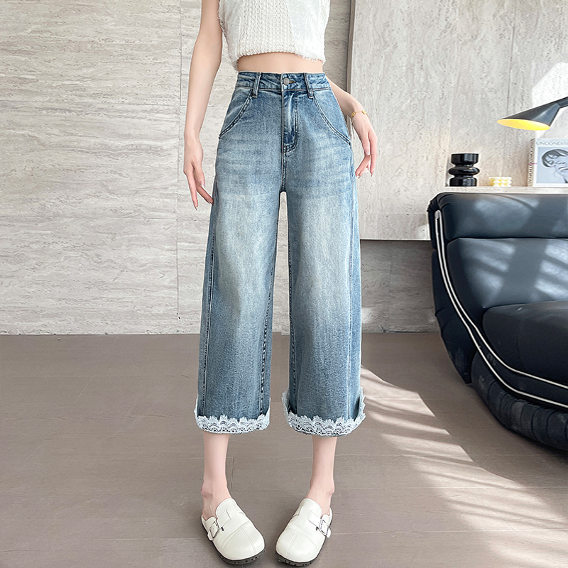 실사 작은 키 8 점 밝은색 넓은 다리 청바지 여성 여름 얇은 스타일 하이웨이스트 루즈핏 디자인 센스 할머니 바지 여성