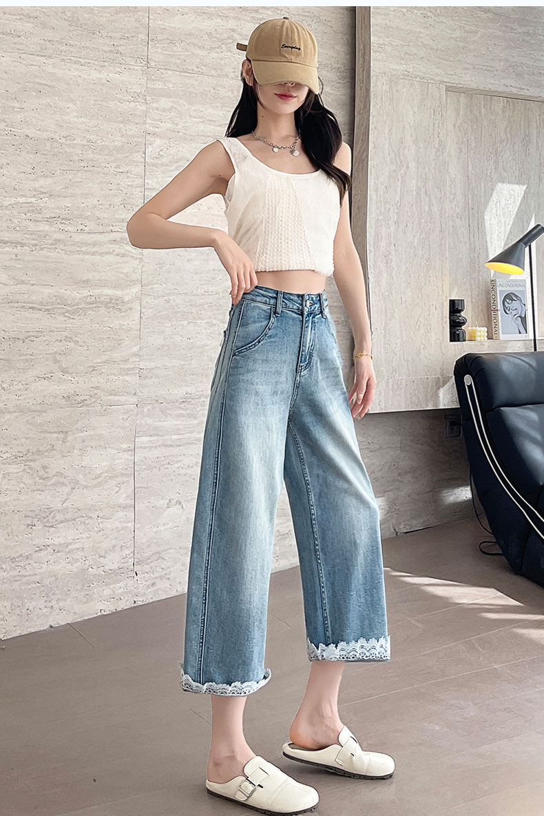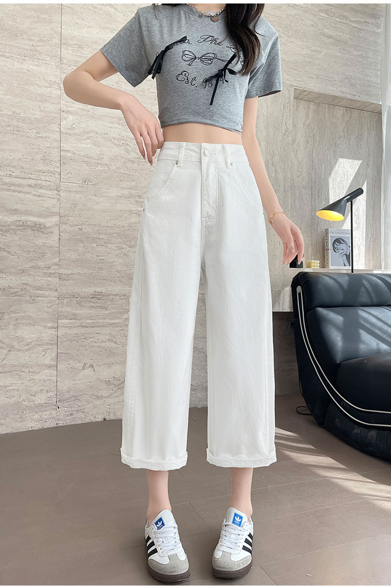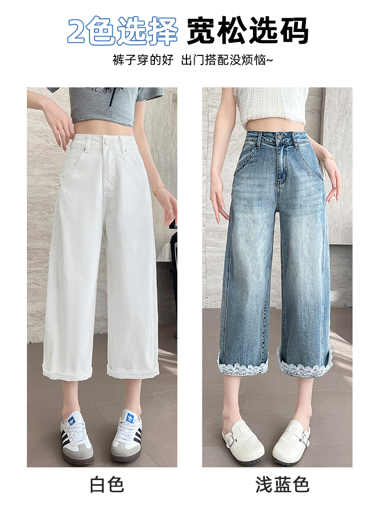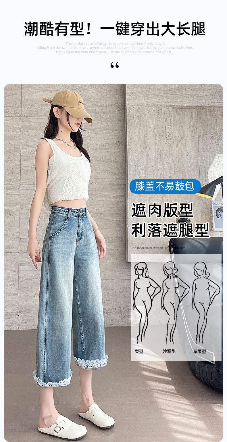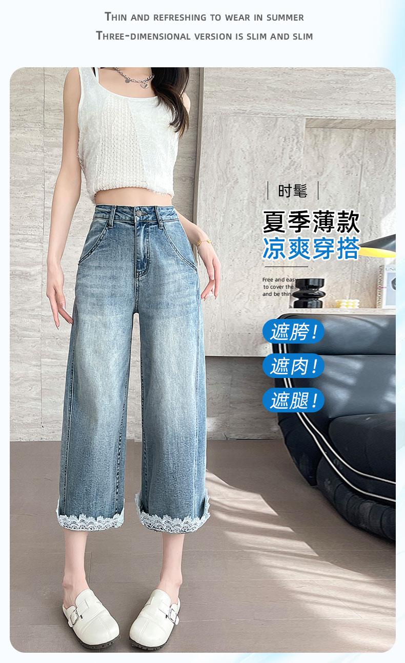 실사 무릎 아래 데님 반바지 여성 오부 바지 여름 얇은 하이웨이스트 루즈핏 넓은 다리 배 종류 몸 한 마디 스트레이트 팬츠
