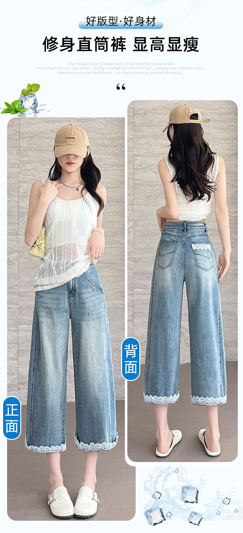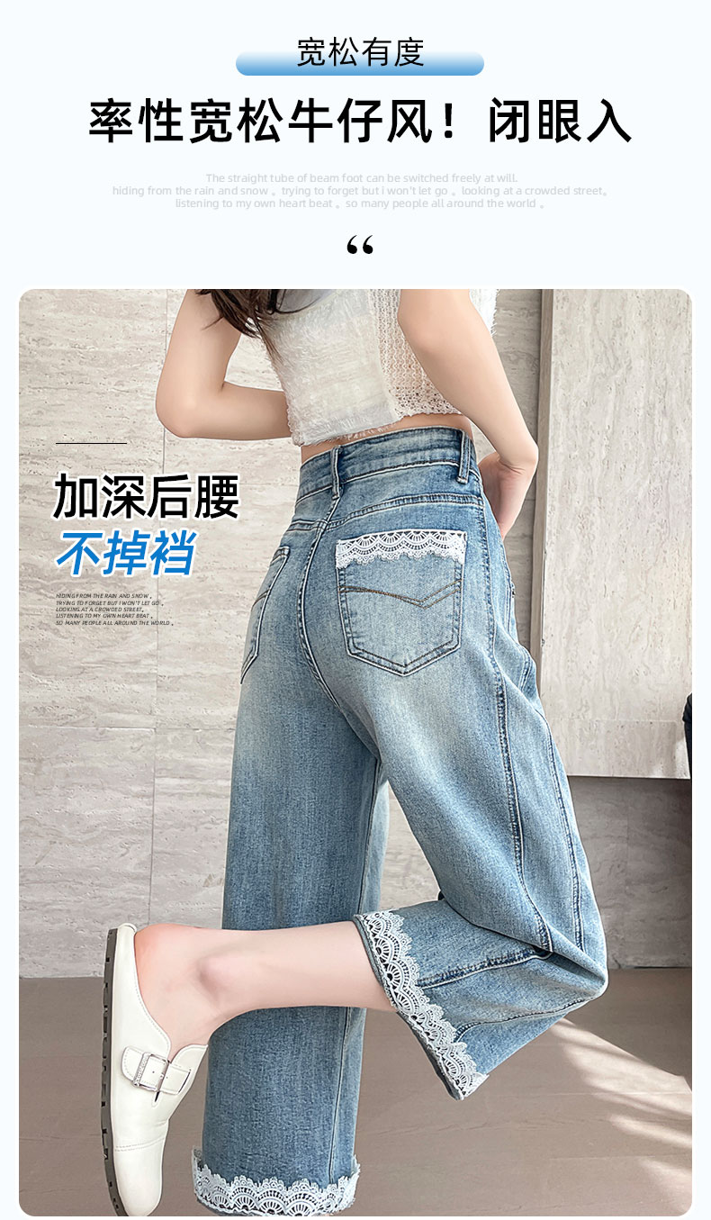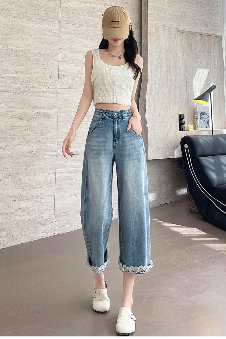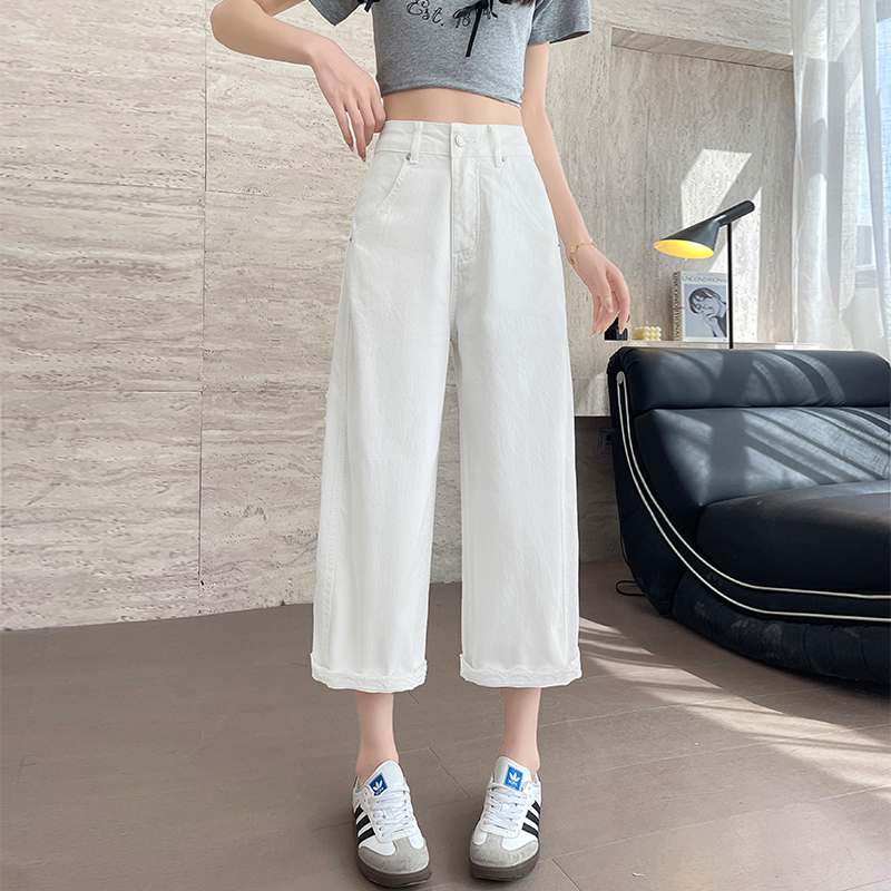 실사 무릎 아래 데님 반바지 여성 오부 바지 여름 얇은 하이웨이스트 루즈핏 넓은 다리 배 종류 몸 한 마디 스트레이트 팬츠