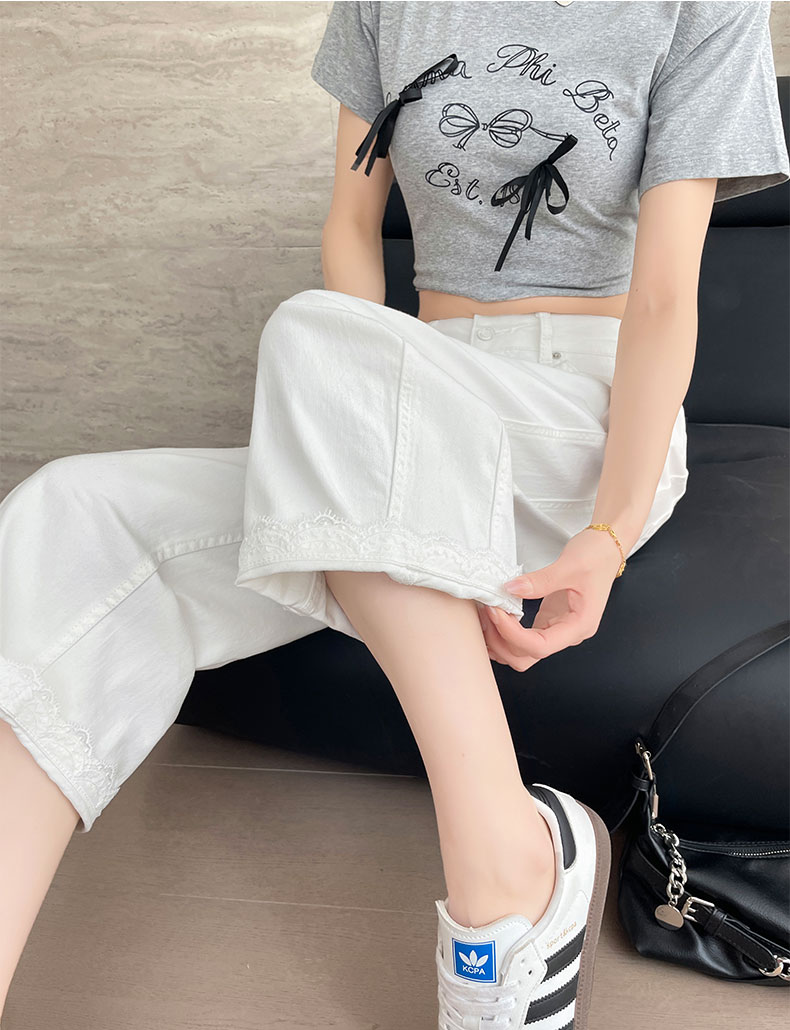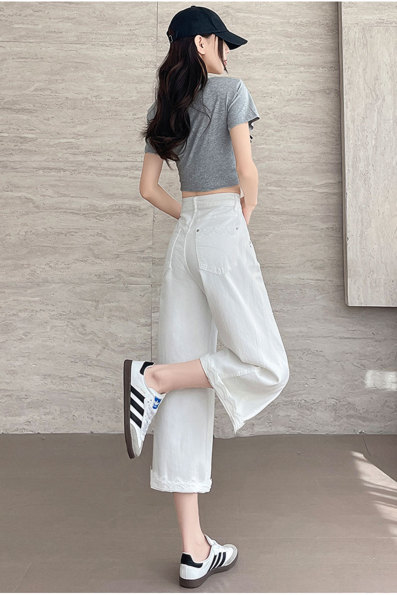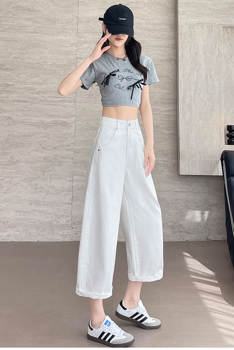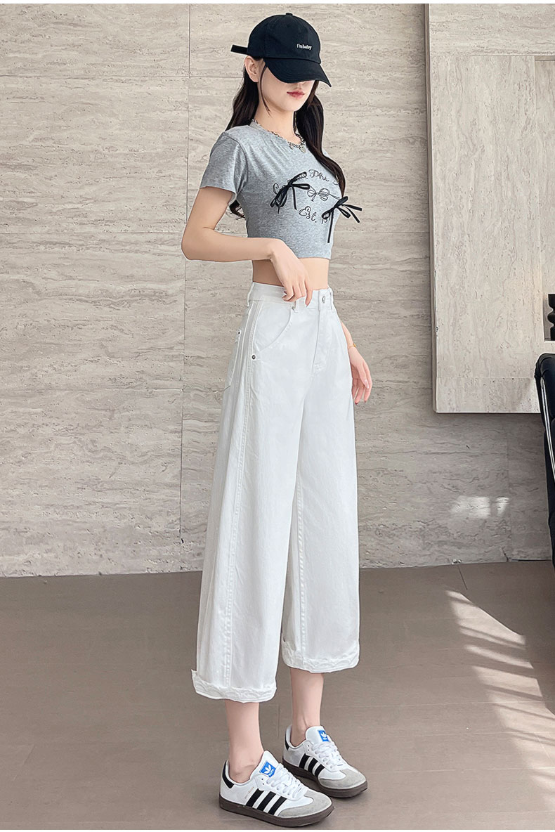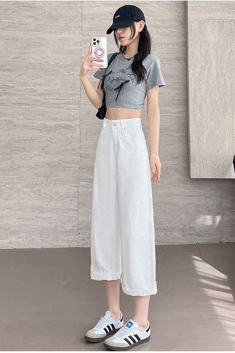 실사 무릎 아래 데님 반바지 여성 오부 바지 여름 얇은 하이웨이스트 루즈핏 넓은 다리 배 종류 몸 한 마디 스트레이트 팬츠
