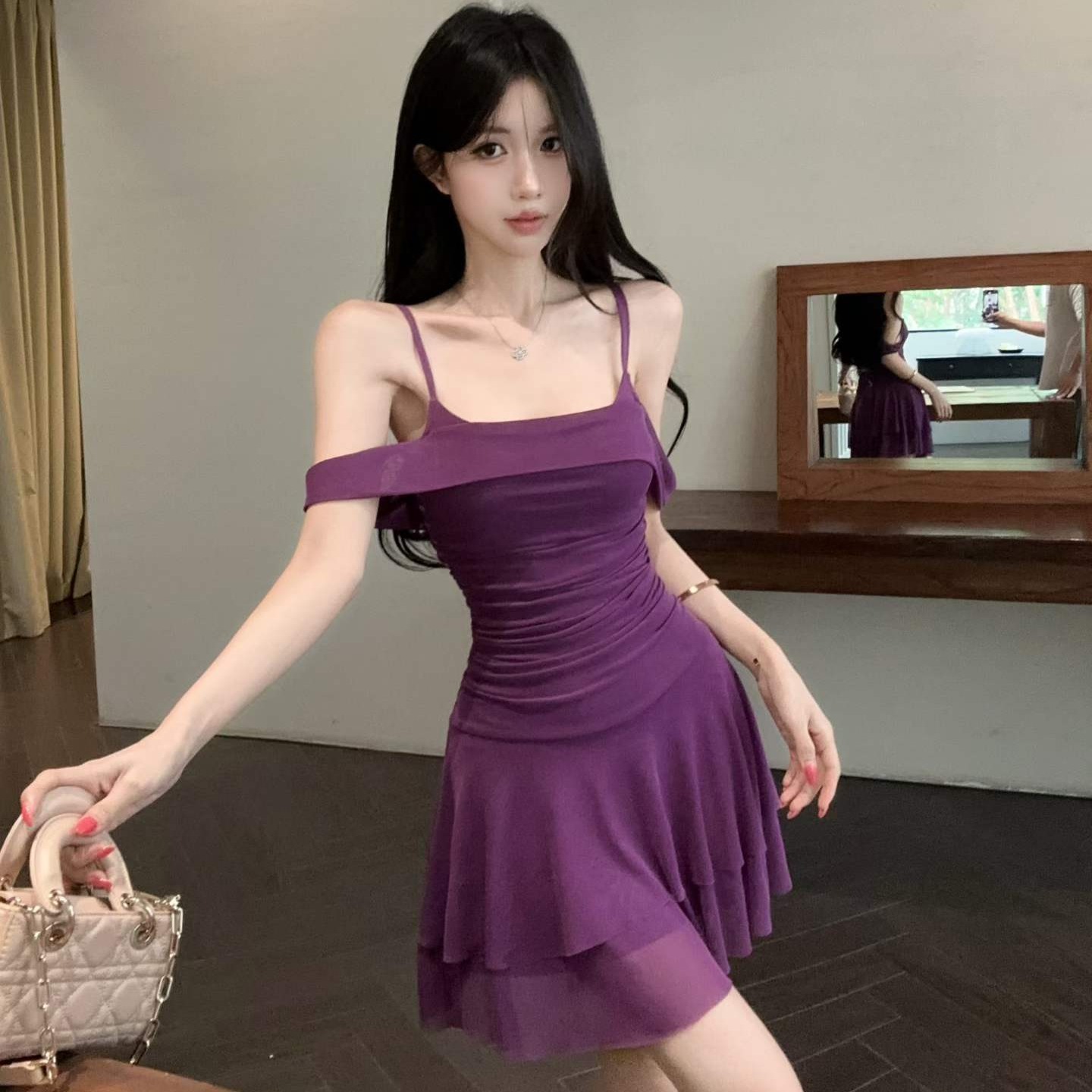실사 프랑스식 소녀 데이트 드레스 부적 디자인 센스 보트넥 새는 어깨 사진 찍기 미니 스커트