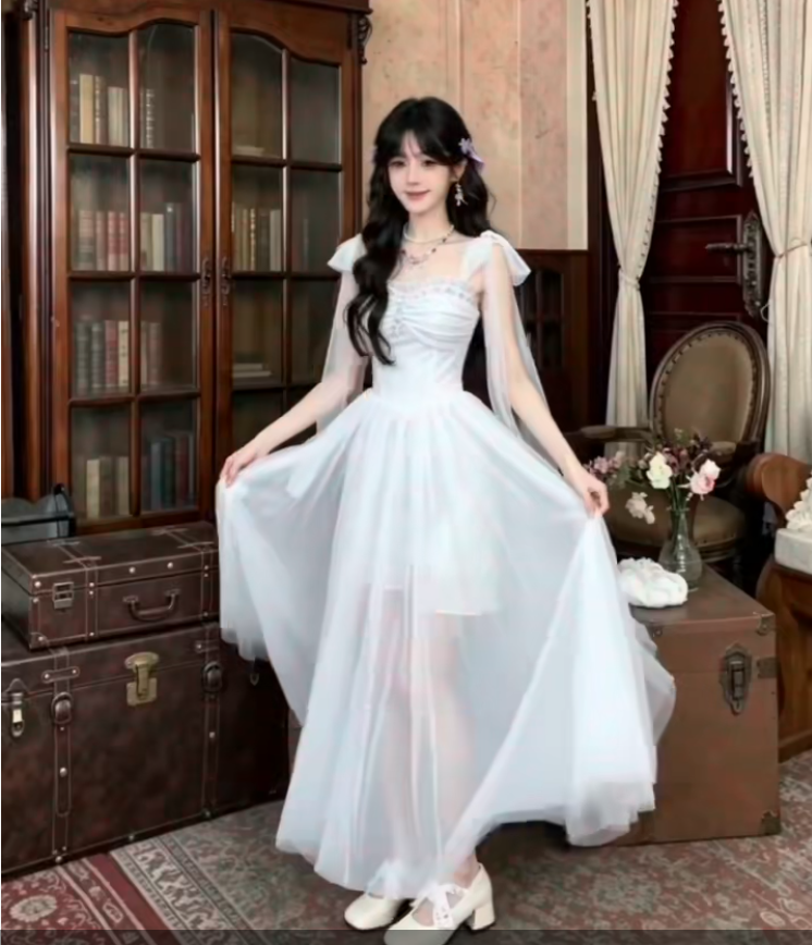 실사 순수한 욕망 프랑스식 로얄 자매 행침 목 허리 수축 드레스 여름 몸매 가꾸기 백리스 중간 길이 스커트