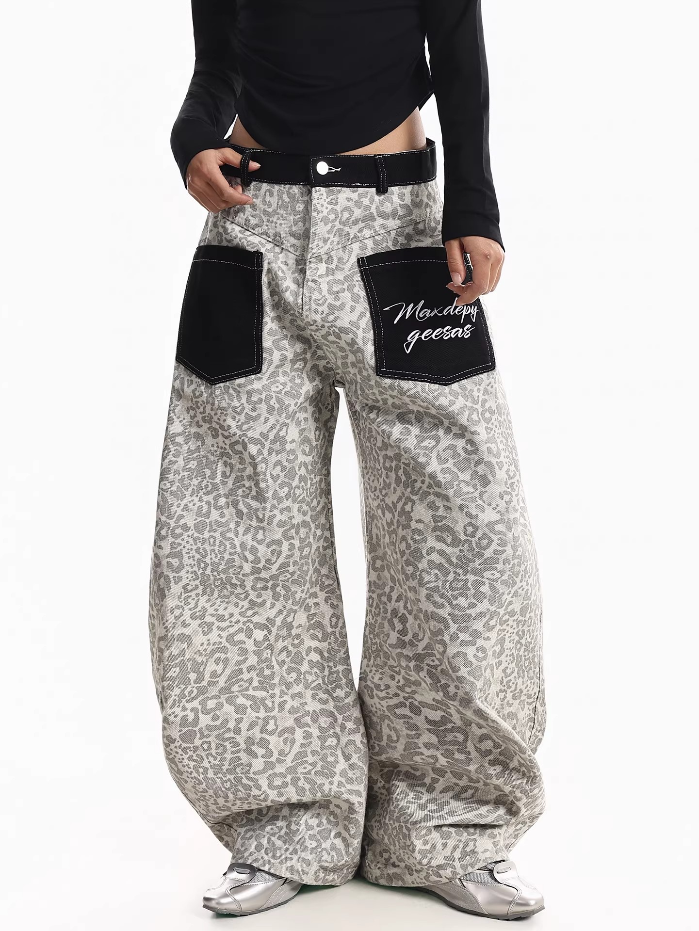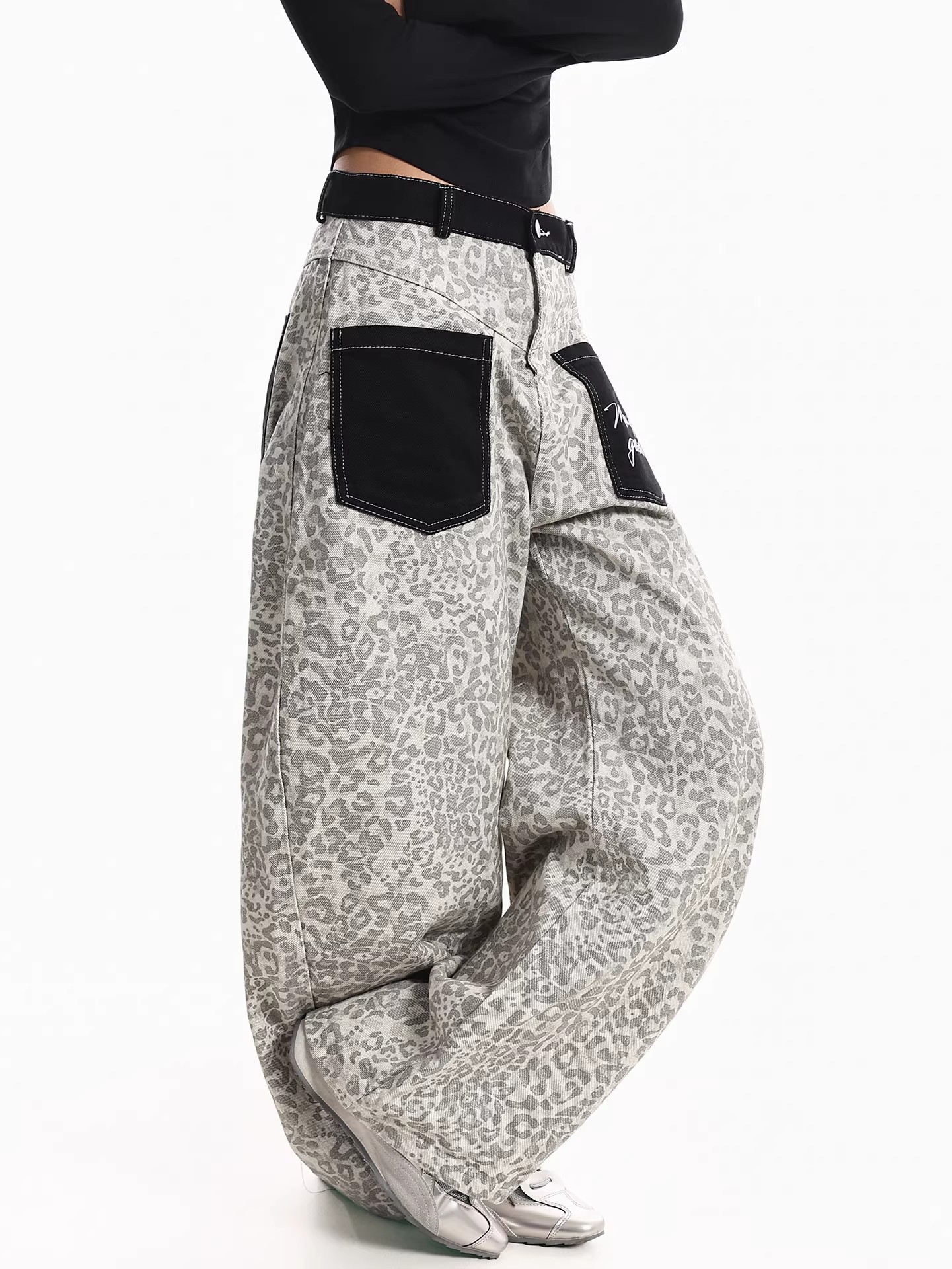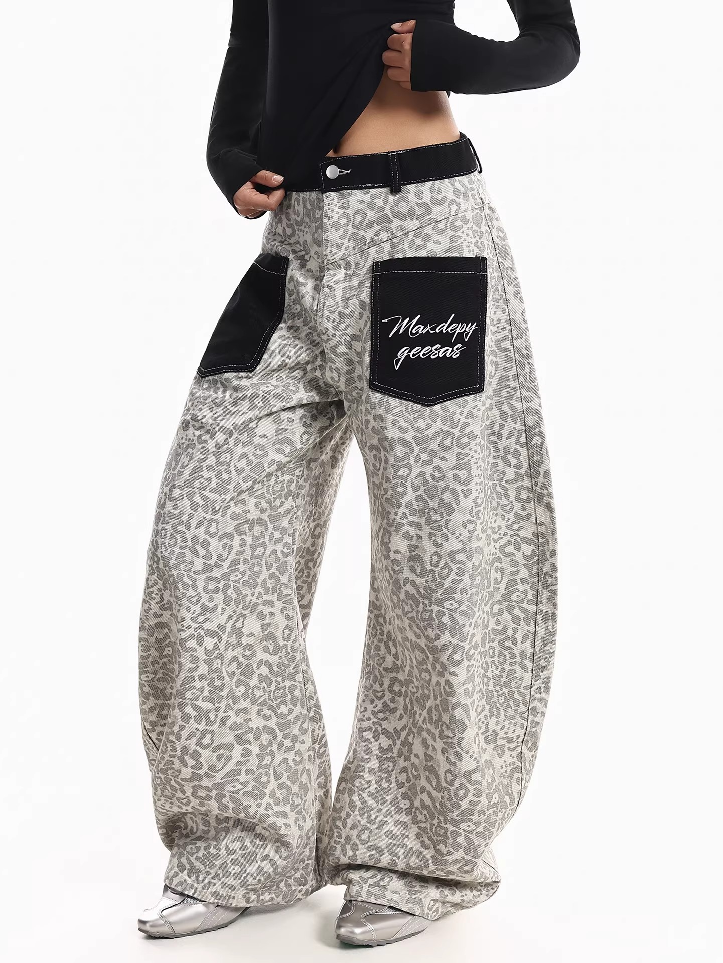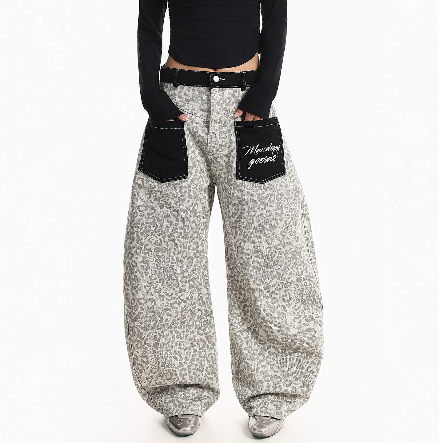 아메리칸 레트로 레오파드 무늬 패치워크 청바지 여성 봄 새로운 디자인 센스 루즈핏 스트레이트 와이드 레그 팬츠 모통이 칼 바지