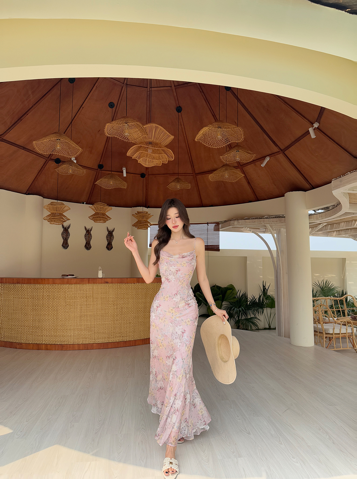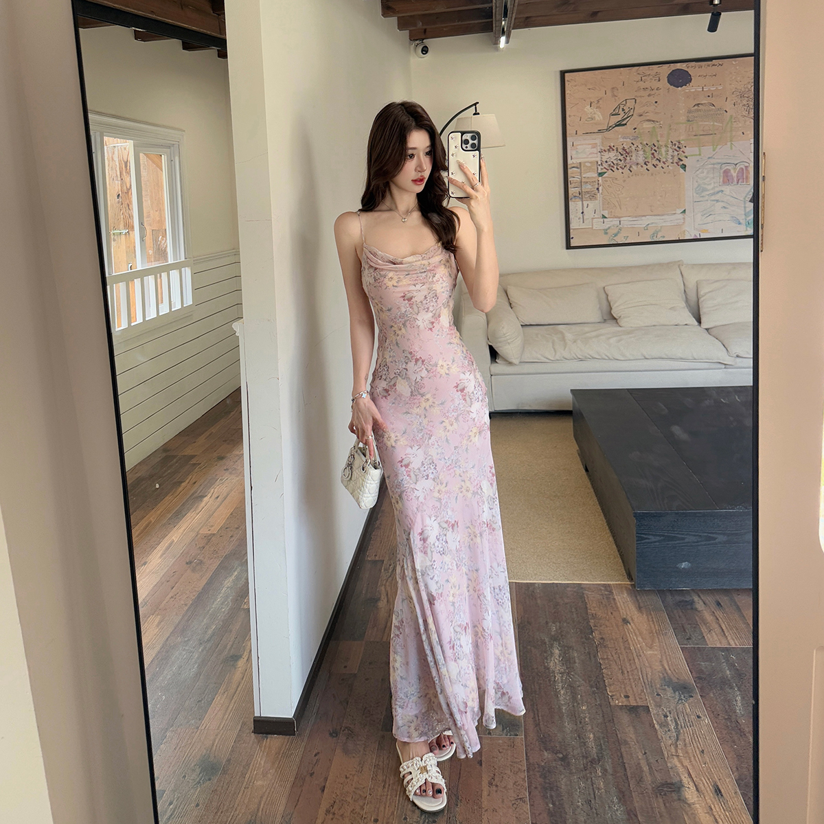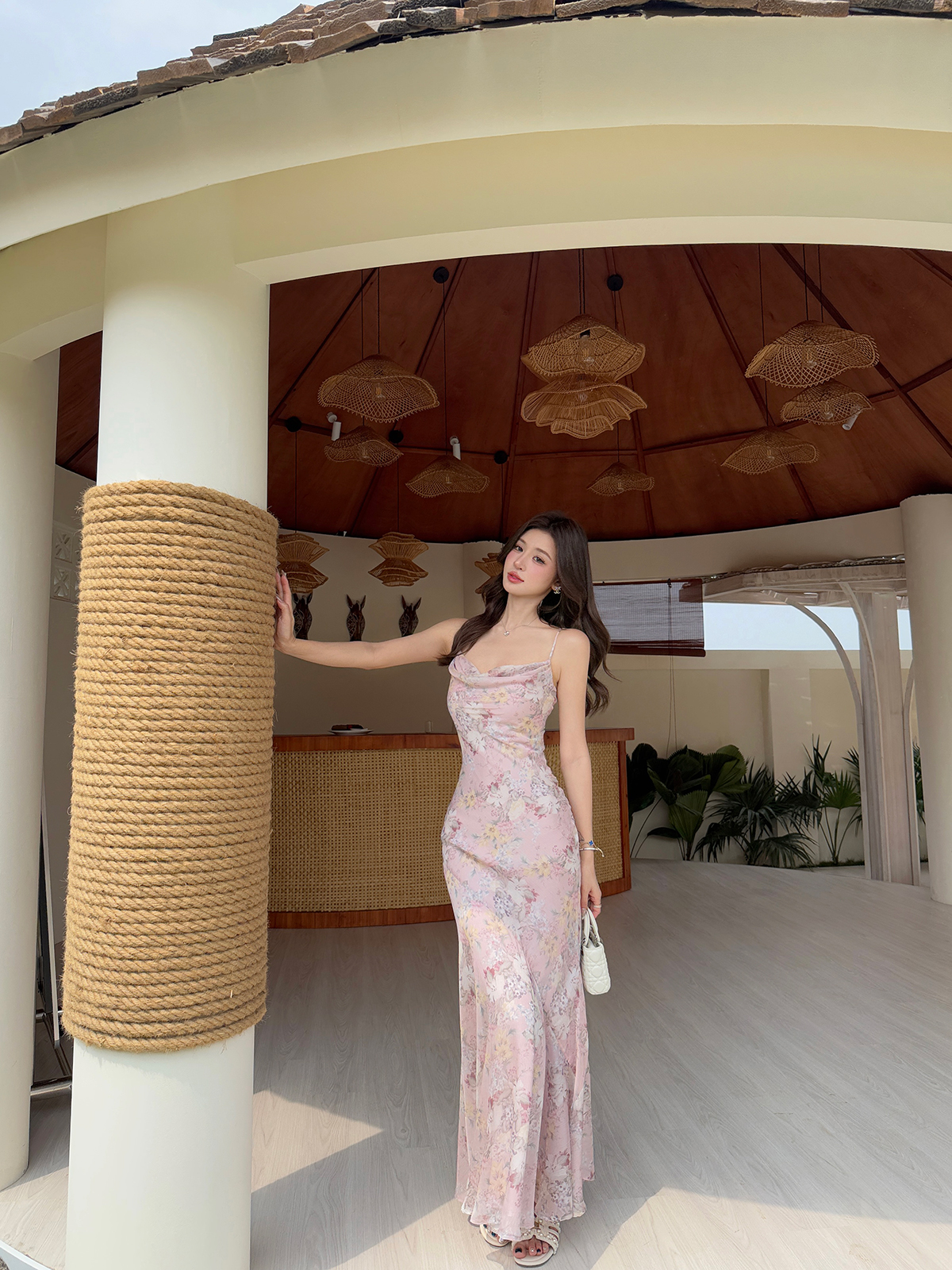 새로운 중식 쉬폰 프린트 드레스 도루 센스 슬립 흔들다 칼라 허리 수축 타이트 스커트 인어 꼬리 롱 스커트 여름