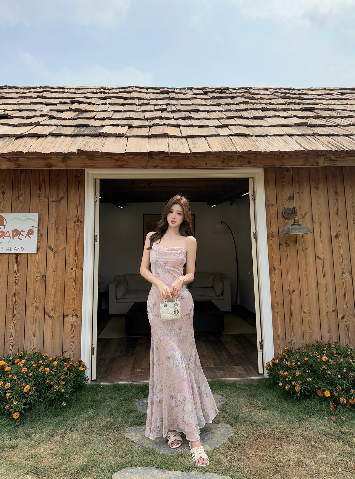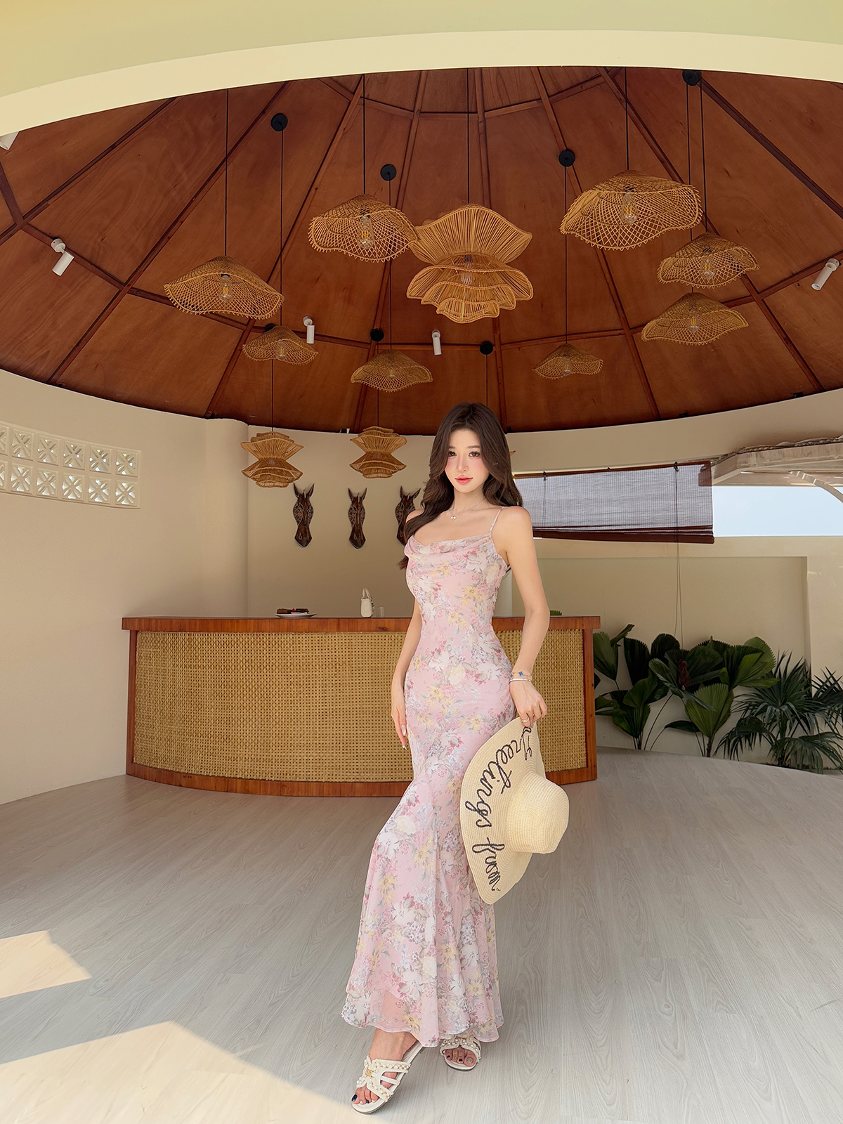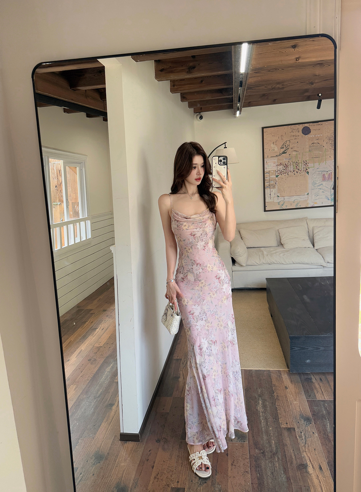 새로운 중식 쉬폰 프린트 드레스 도루 센스 슬립 흔들다 칼라 허리 수축 타이트 스커트 인어 꼬리 롱 스커트 여름