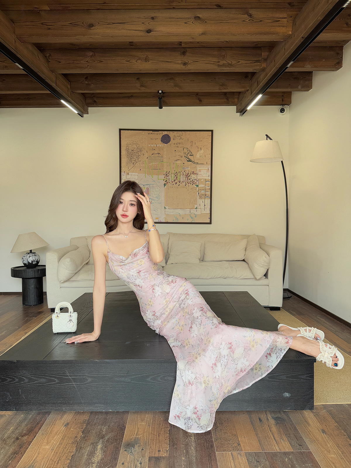 꽃 리 천 골드 여름 새로운 프랑스식 고급 센스 무거운 작업 네클라인 디자인 베이지 색 드레스