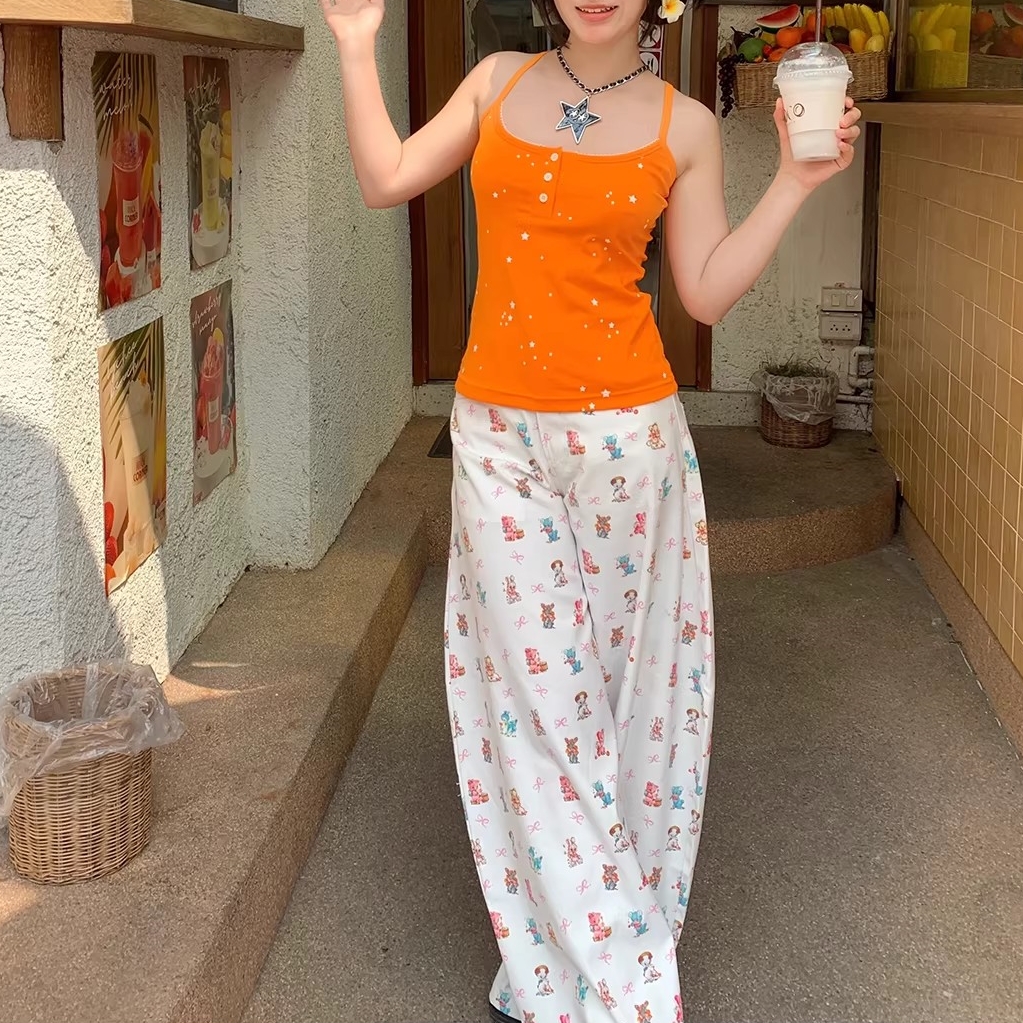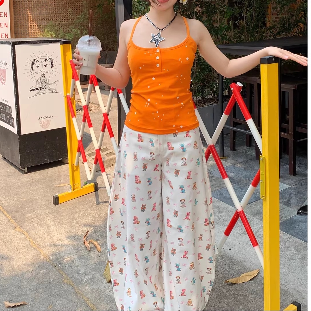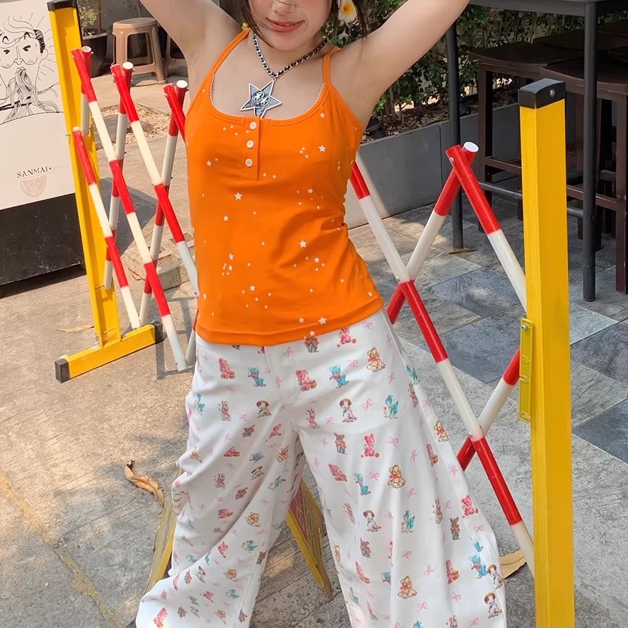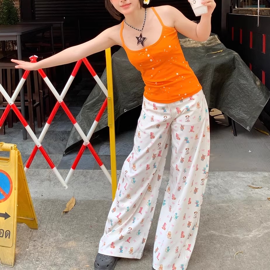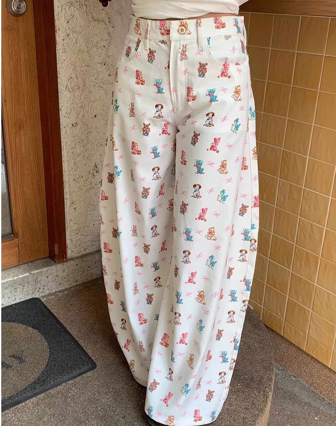 아메리칸 귀여운 작은 곰 펜던트 자수 청바지 여성 봄 가을 새로운 작은 대중 단추 디자인 센스 넓은 다리 길이 바지