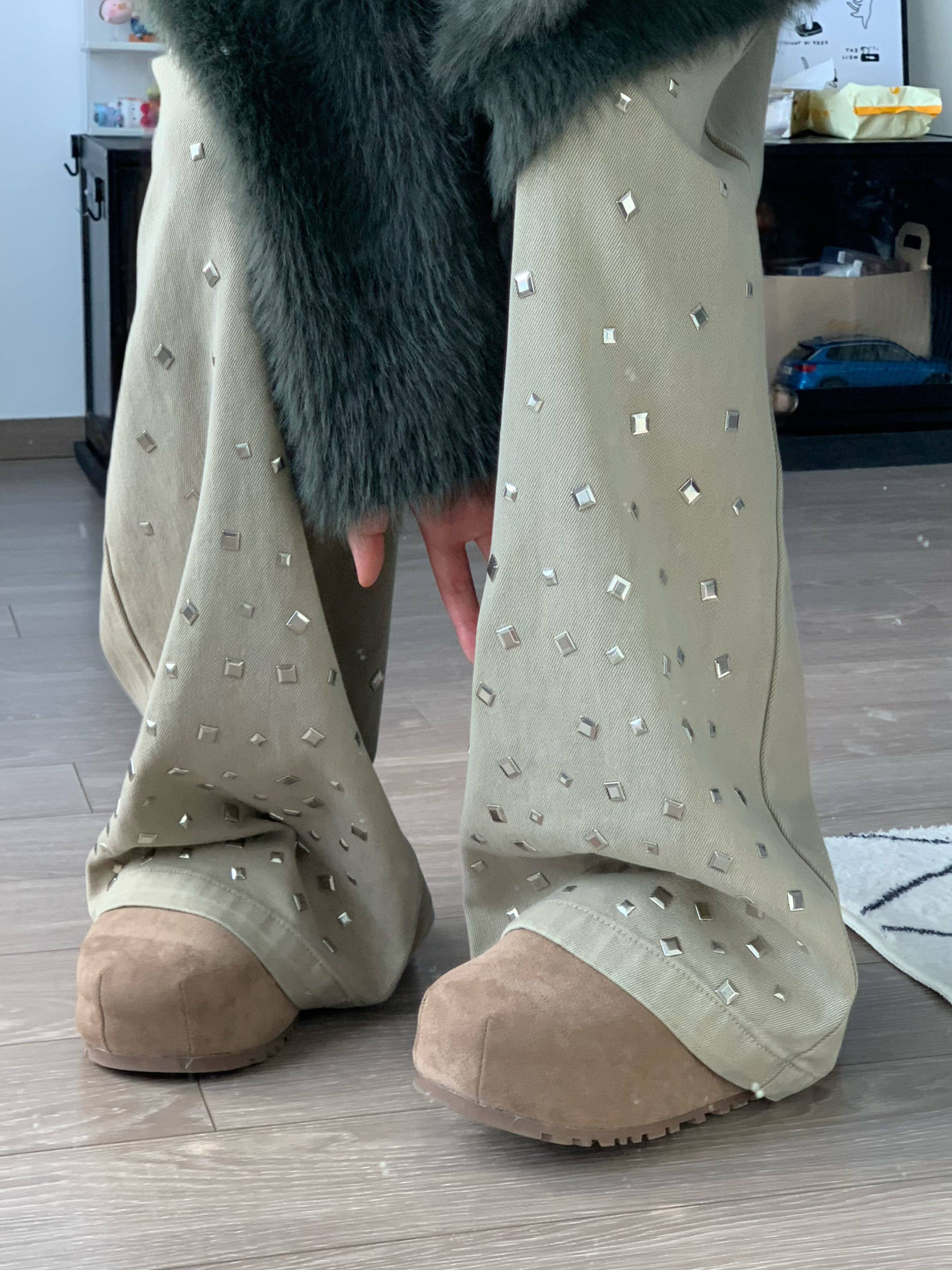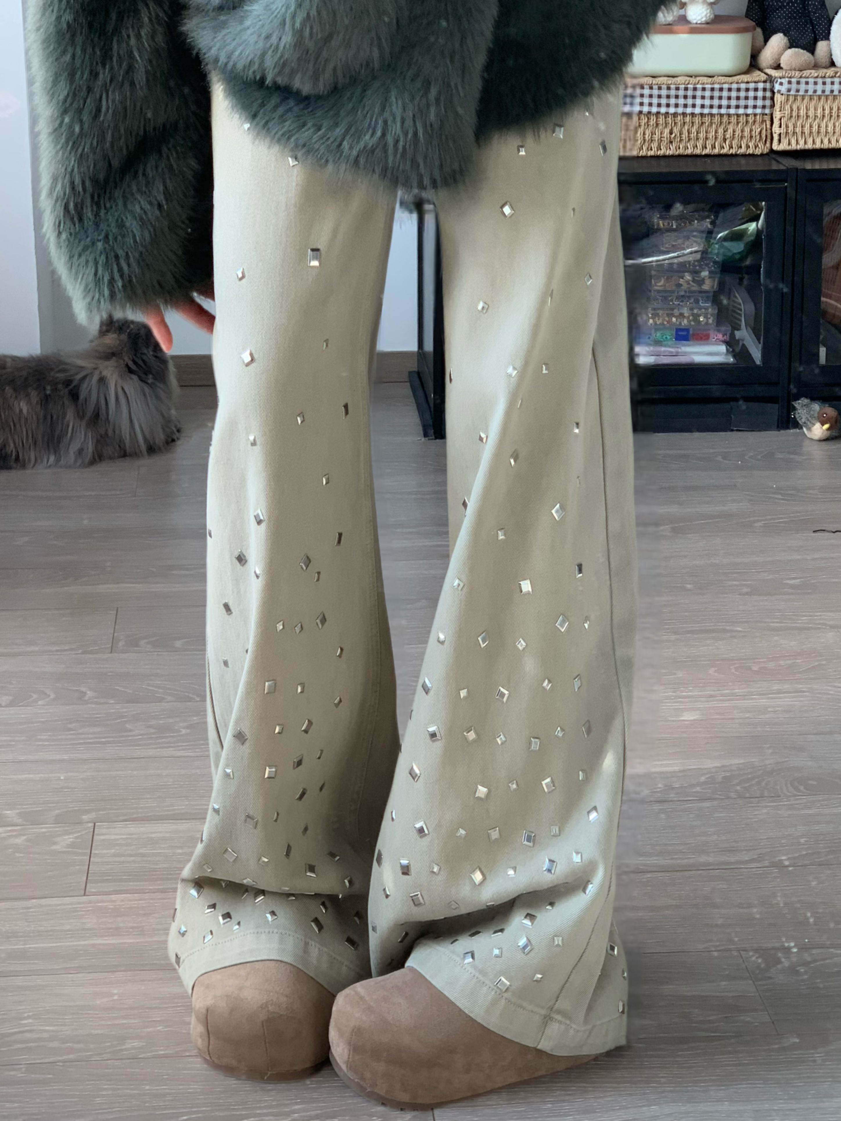 파란색 작은 말 자수 무거운 작업 핫픽스 청바지 여성 봄 디자인 센스 하이웨이스트 다용도 페이크 레이어드 넓은 다리 길이 바지