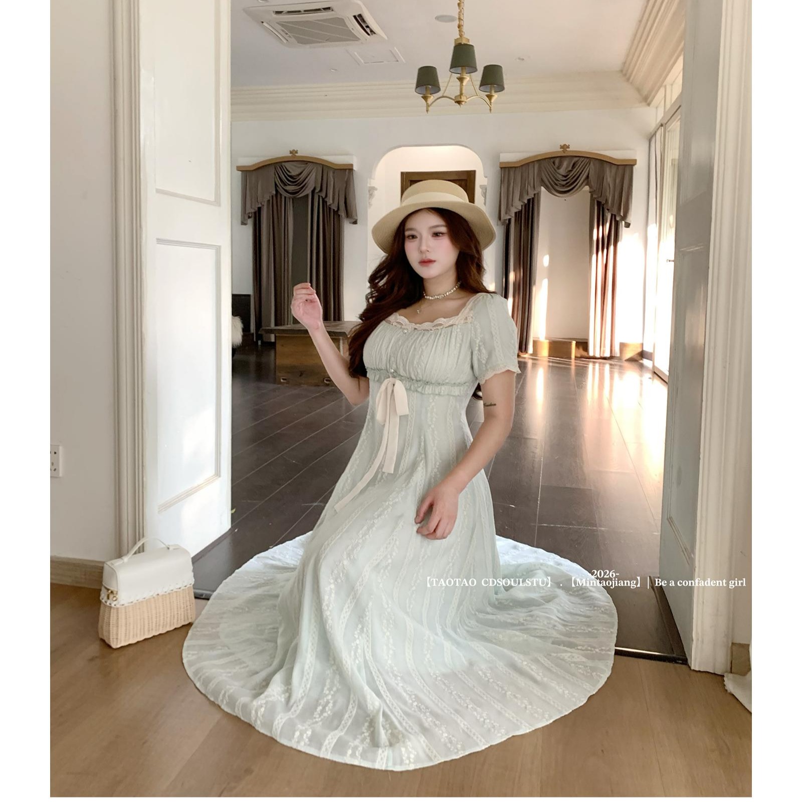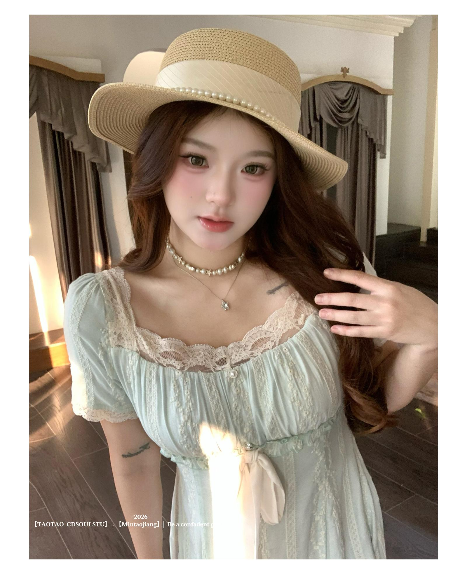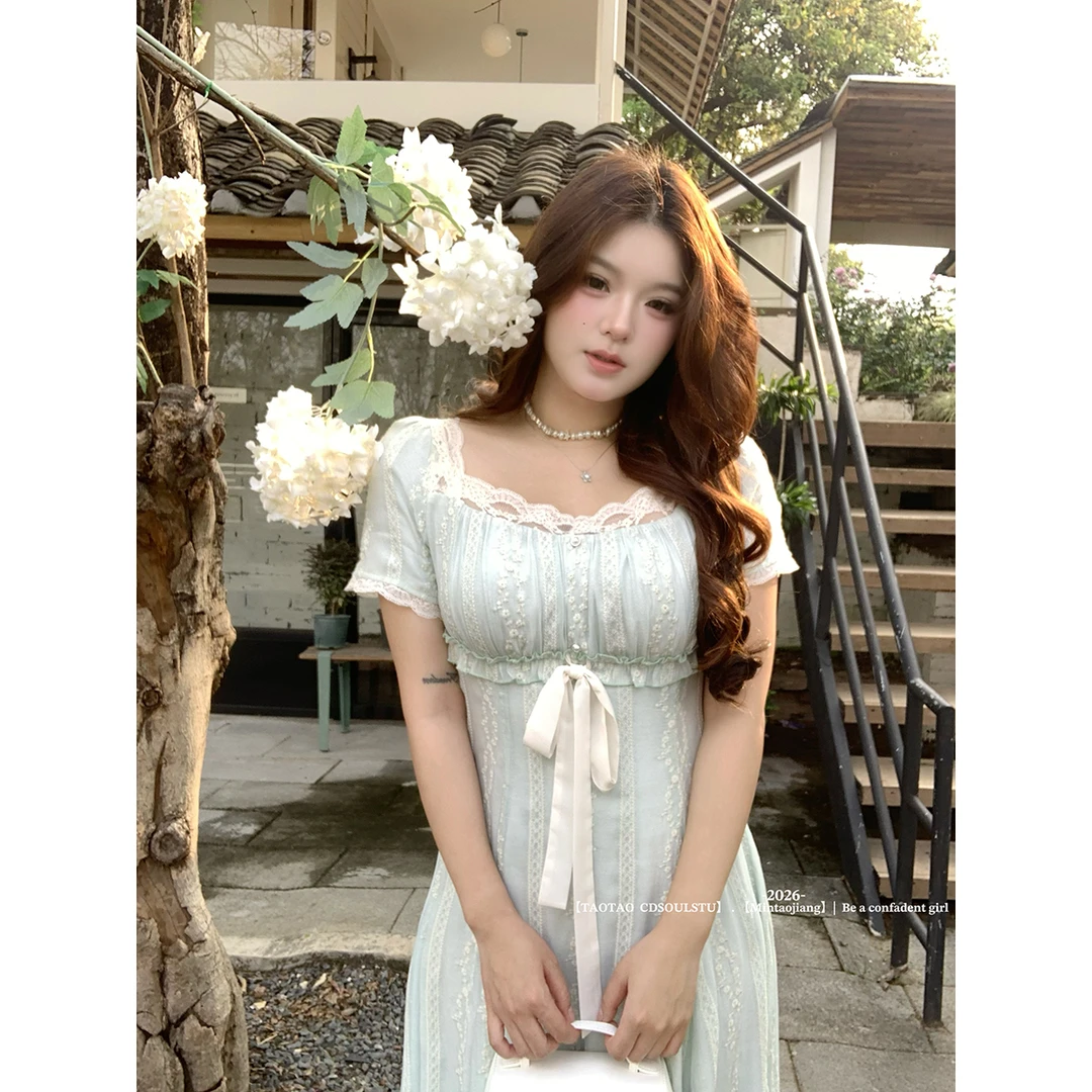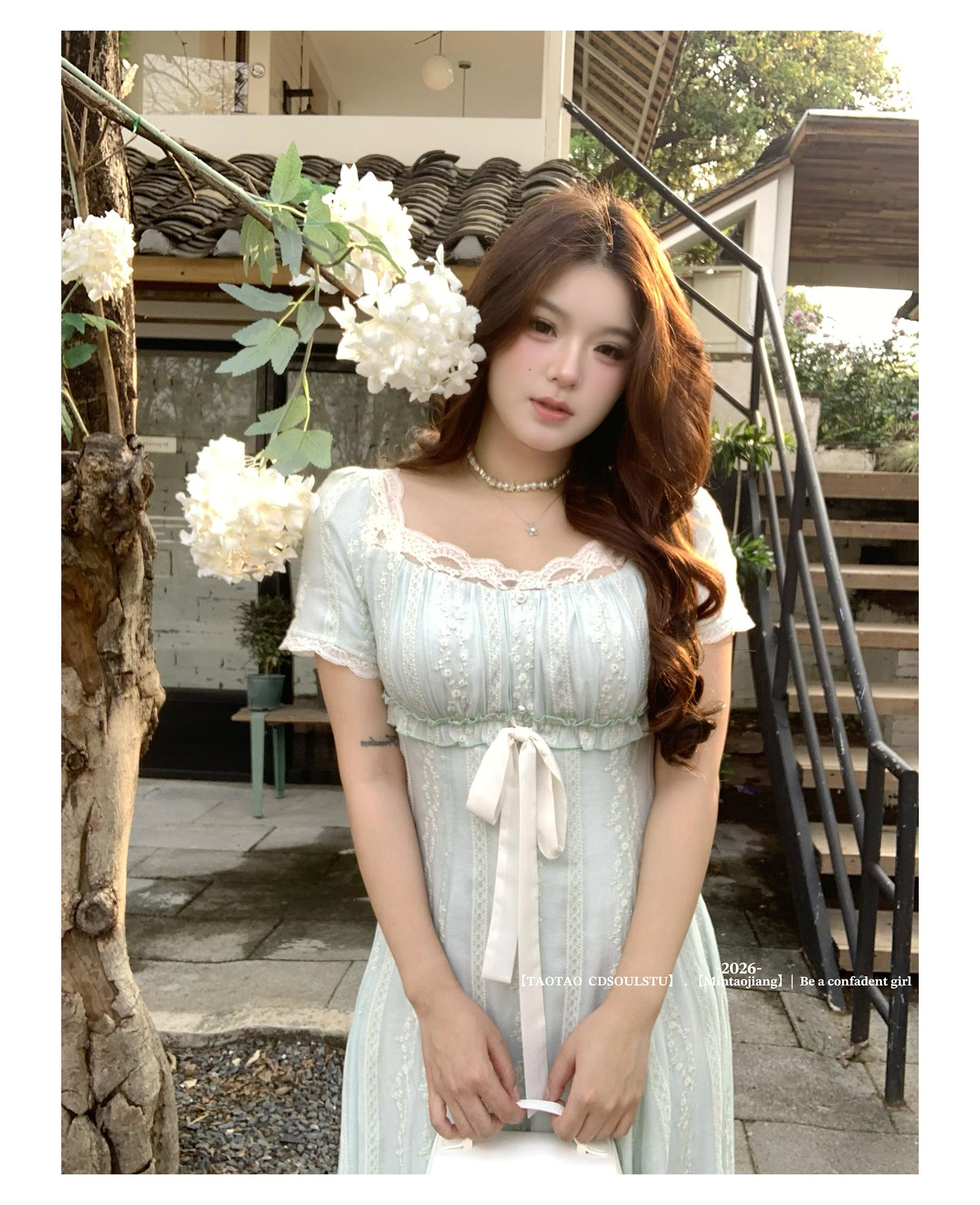 sweet 부드러운 밀가루 칭란 마이크로 지방 달콤함 소녀 특별 조정 질감 센스 자수 무거운 작업 허리 수축 긍정적 인 어깨 드레스