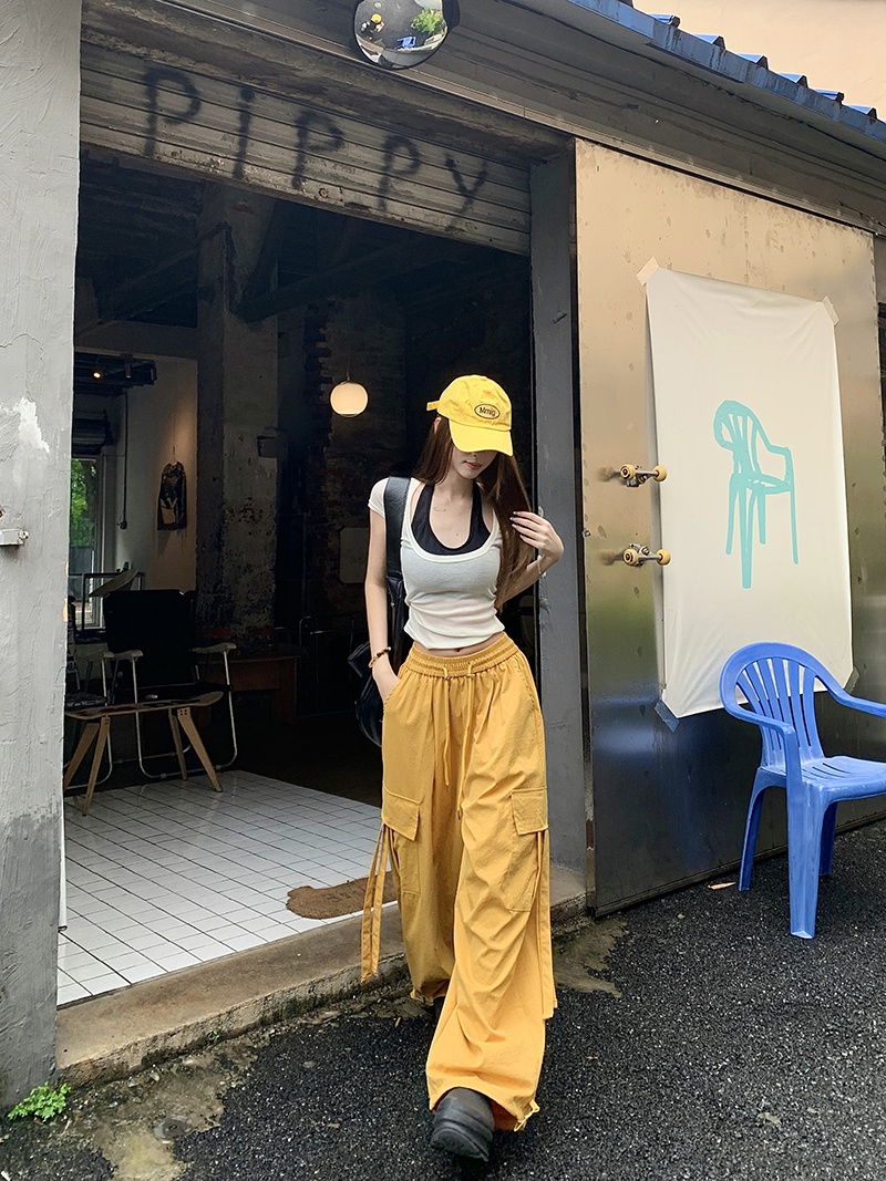 실사 아메리칸 디자인 센스 화이트 핫걸 워크웨어 팬츠 여성 하이웨이스트 슬림해 보이는 스트레이트 팬츠 루즈핏 와이드 레그 팬츠 바닥 청소 바지