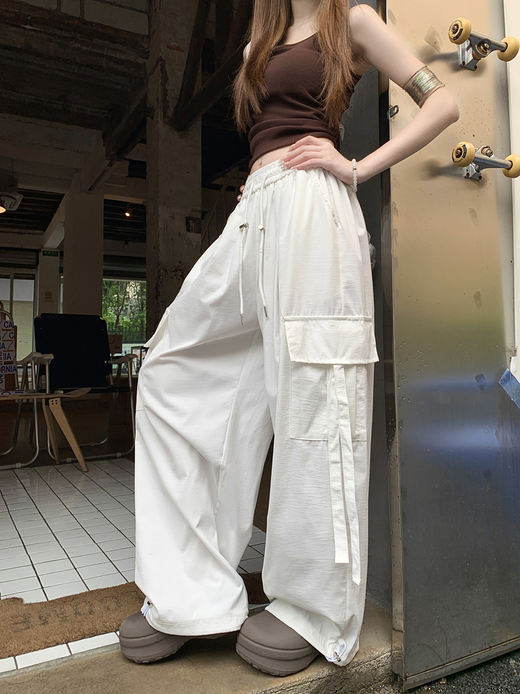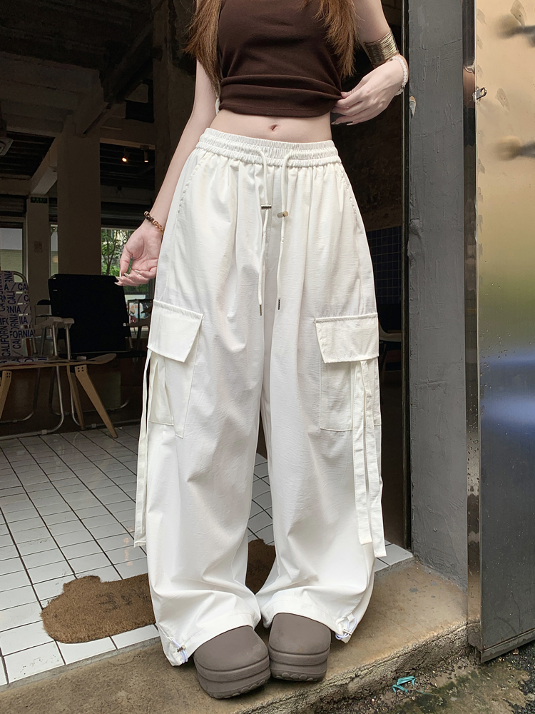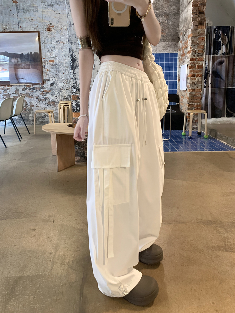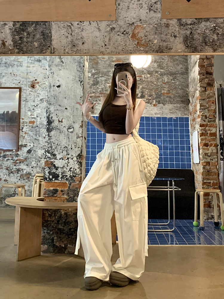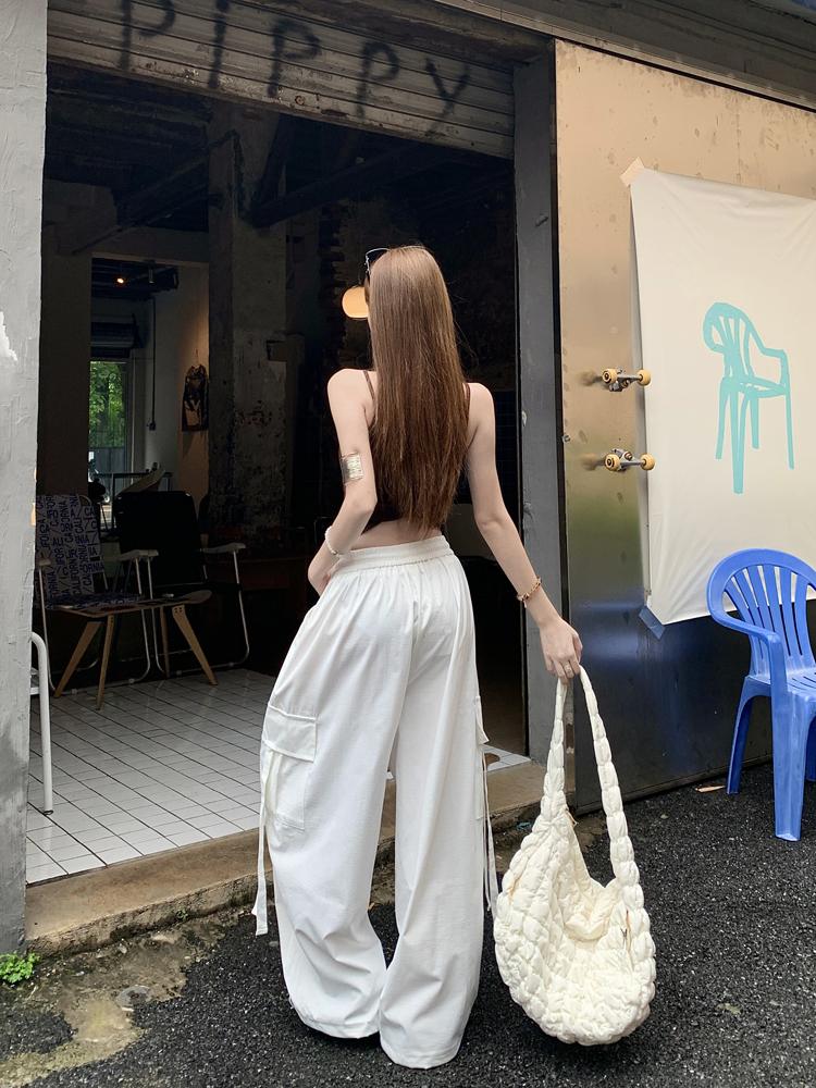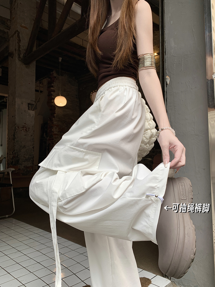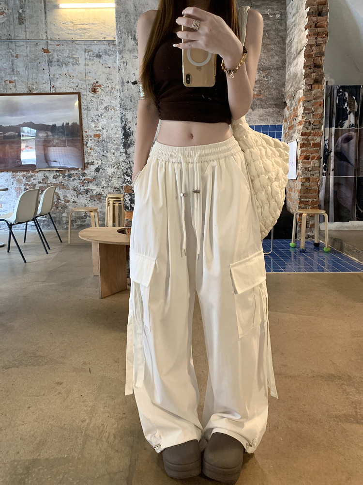 실사 아메리칸 디자인 센스 화이트 핫걸 워크웨어 팬츠 여성 하이웨이스트 슬림해 보이는 스트레이트 팬츠 루즈핏 와이드 레그 팬츠 바닥 청소 바지