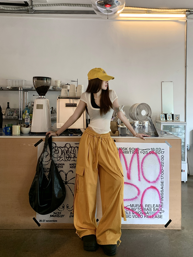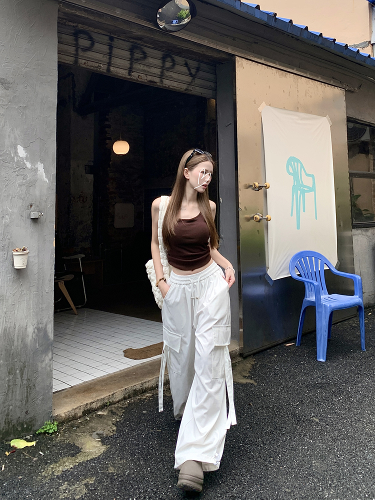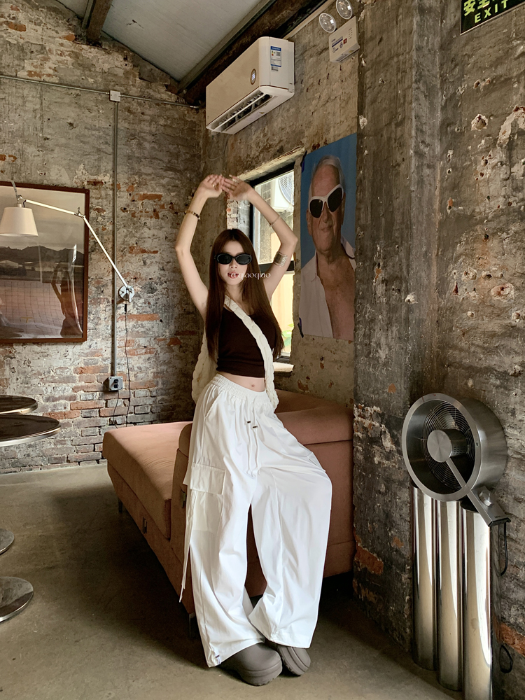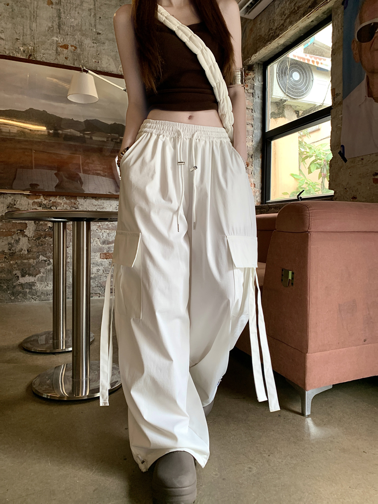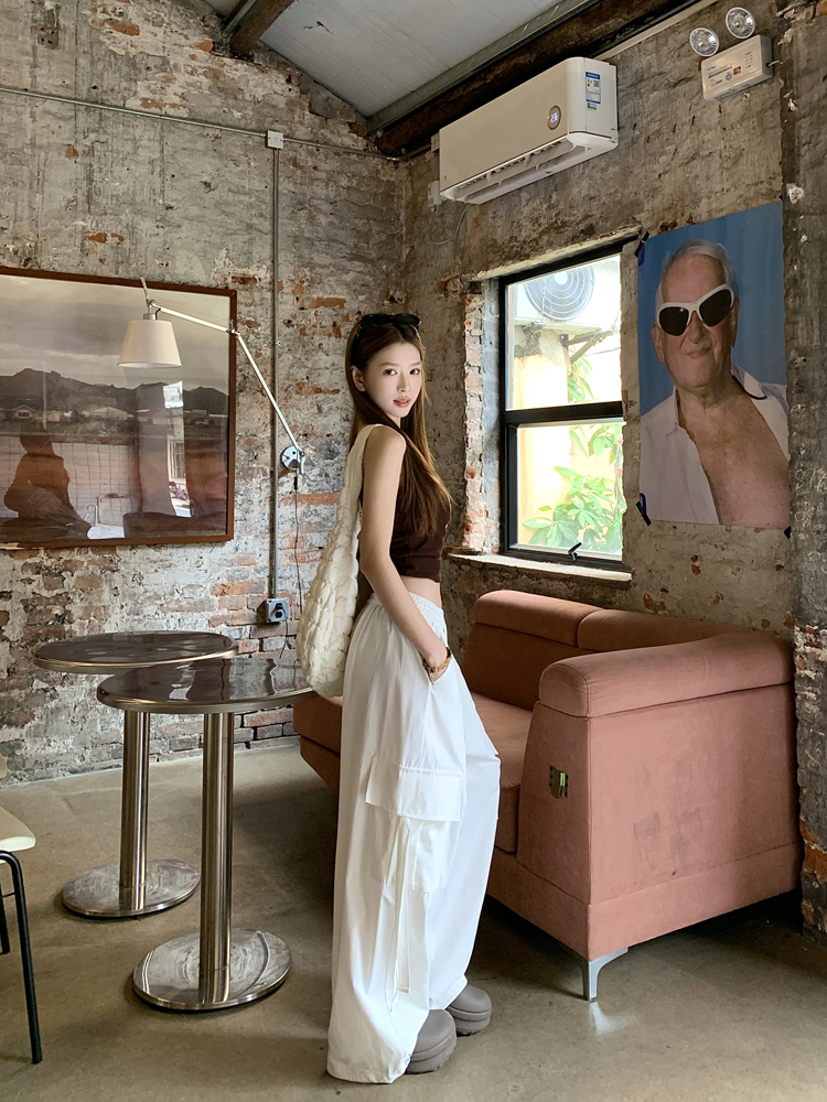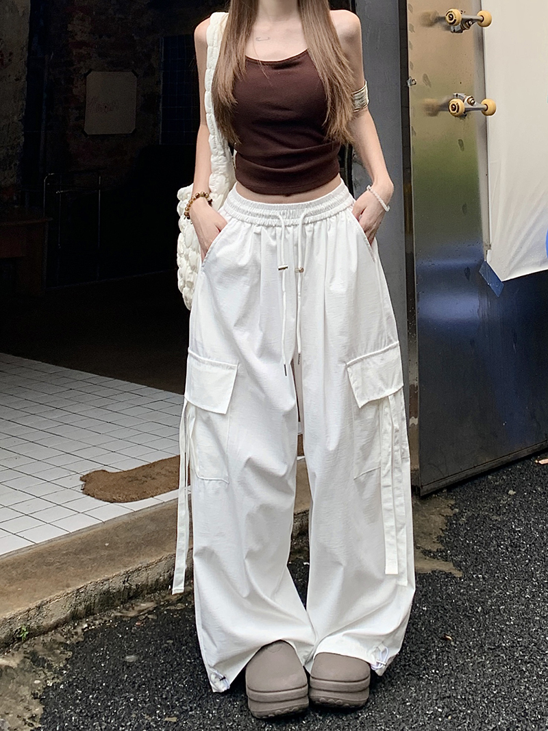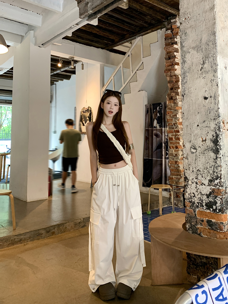 실사 아메리칸 디자인 센스 화이트 핫걸 워크웨어 팬츠 여성 하이웨이스트 슬림해 보이는 스트레이트 팬츠 루즈핏 와이드 레그 팬츠 바닥 청소 바지