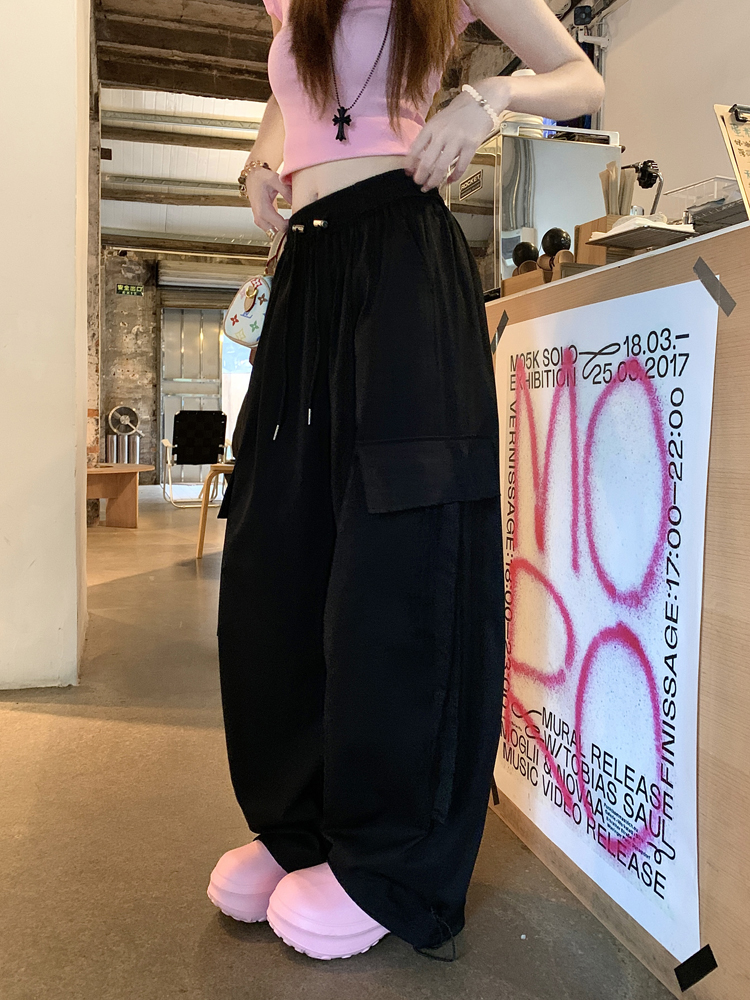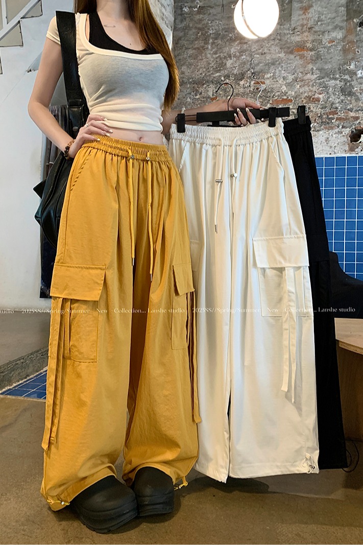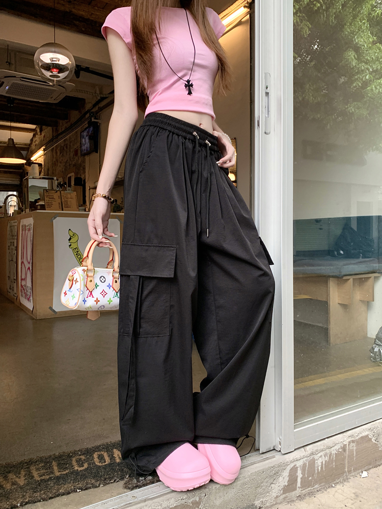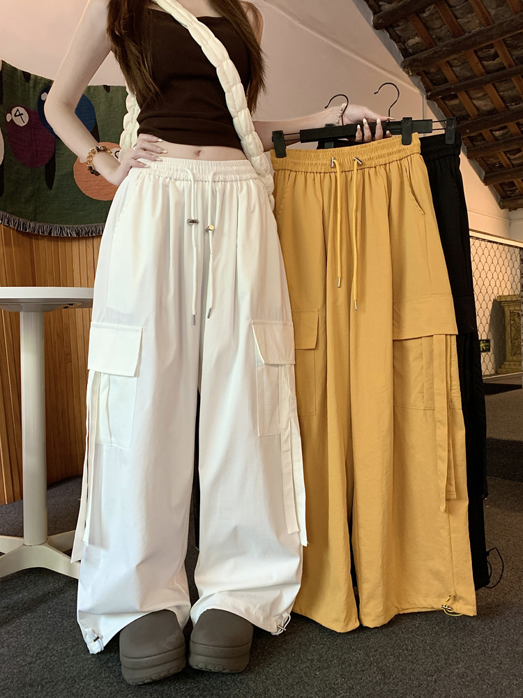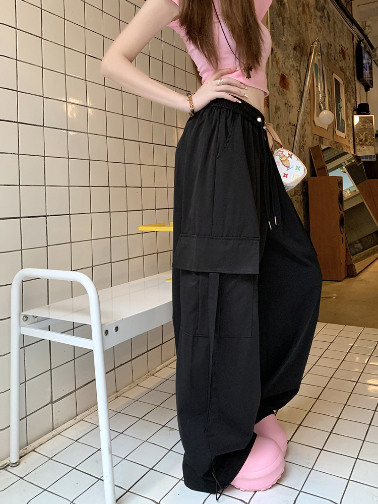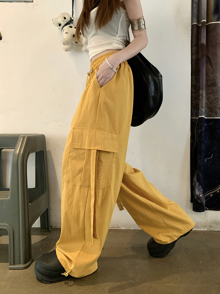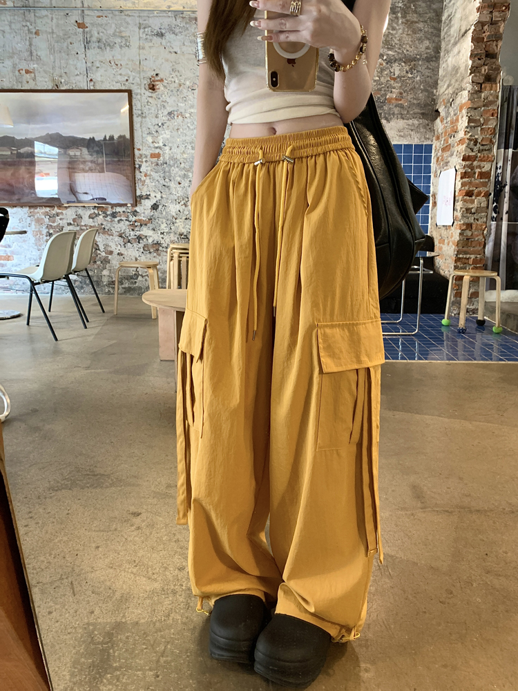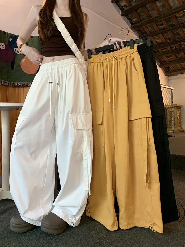실사 느긋한 센스 캐주얼 바지 여성 여름 단색 허리밴드 바지 슬림해 보이는 와이드 레그 팬츠 루즈핏 도루 센스 바닥 청소 바지
