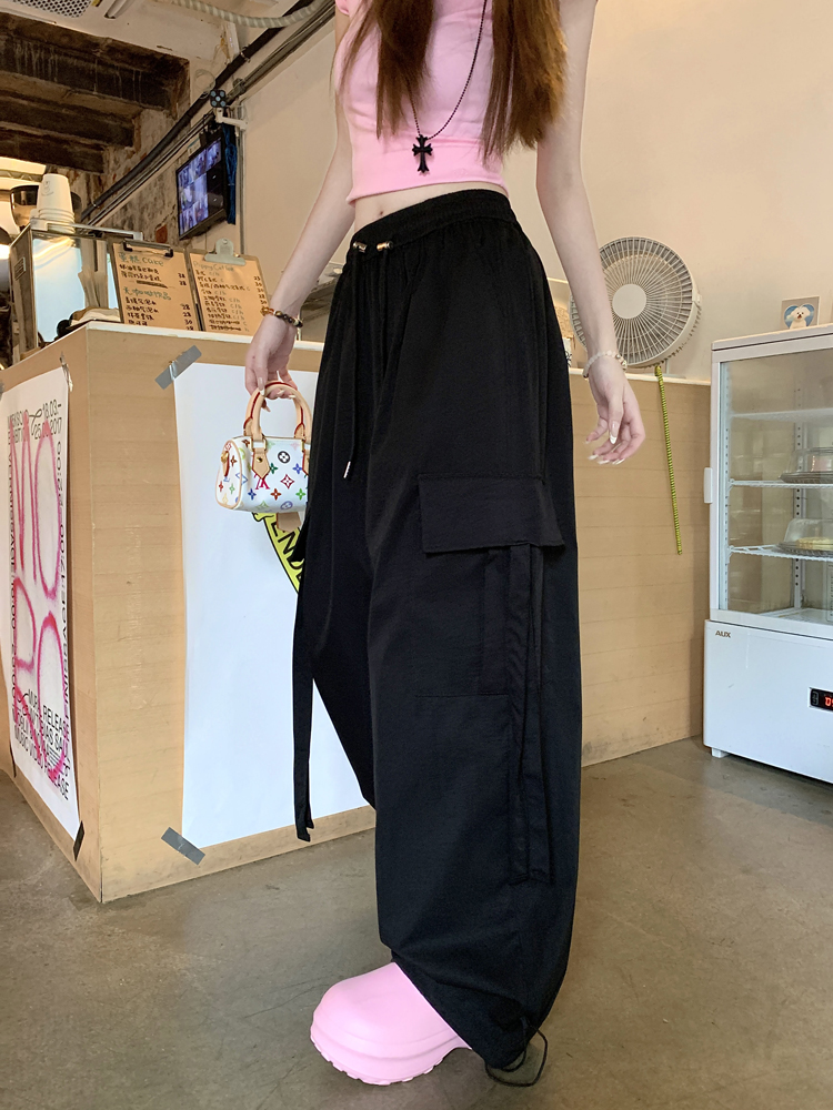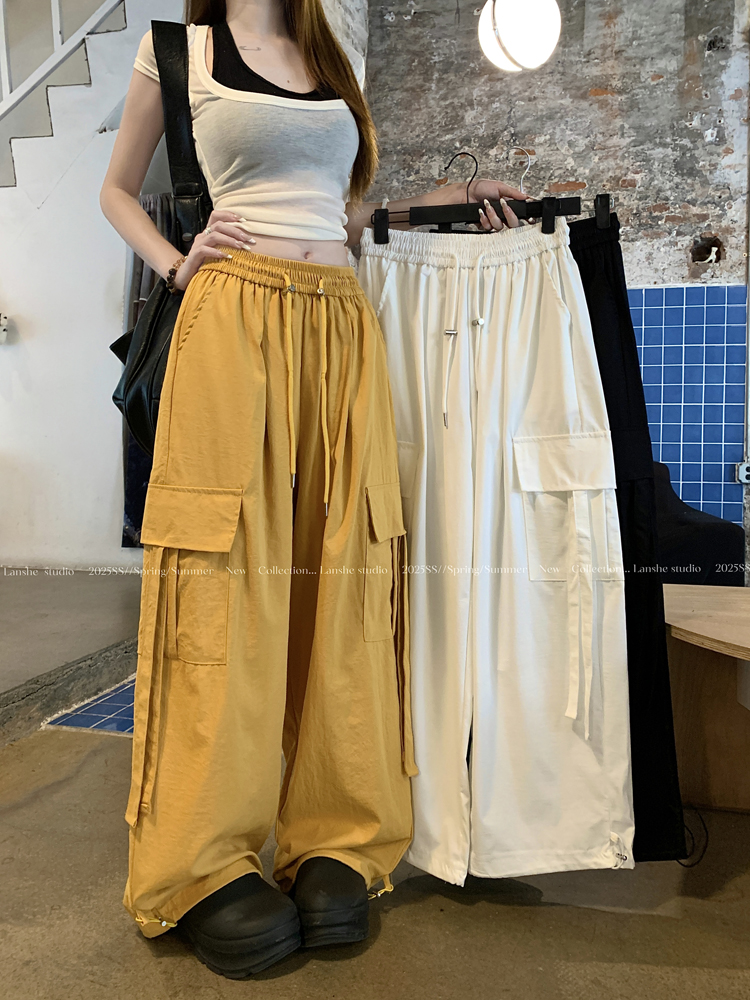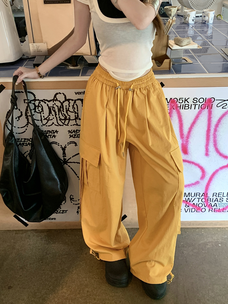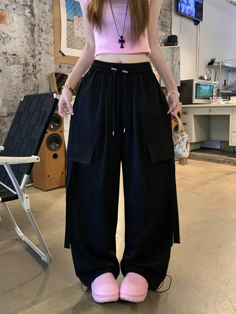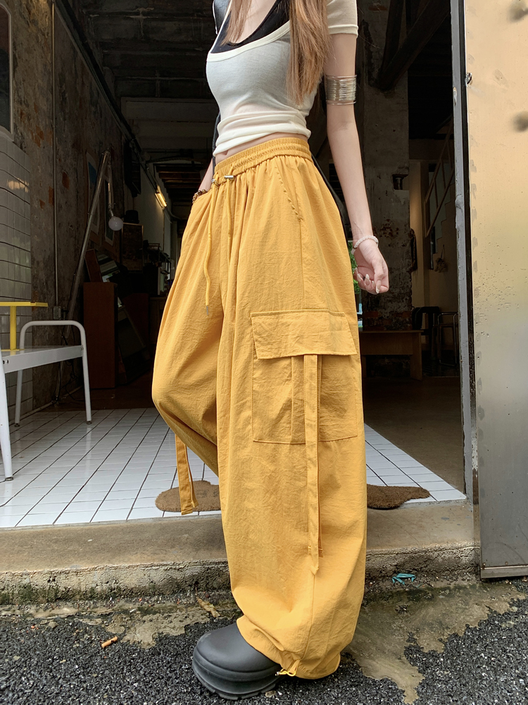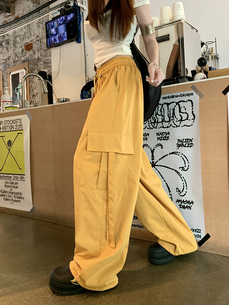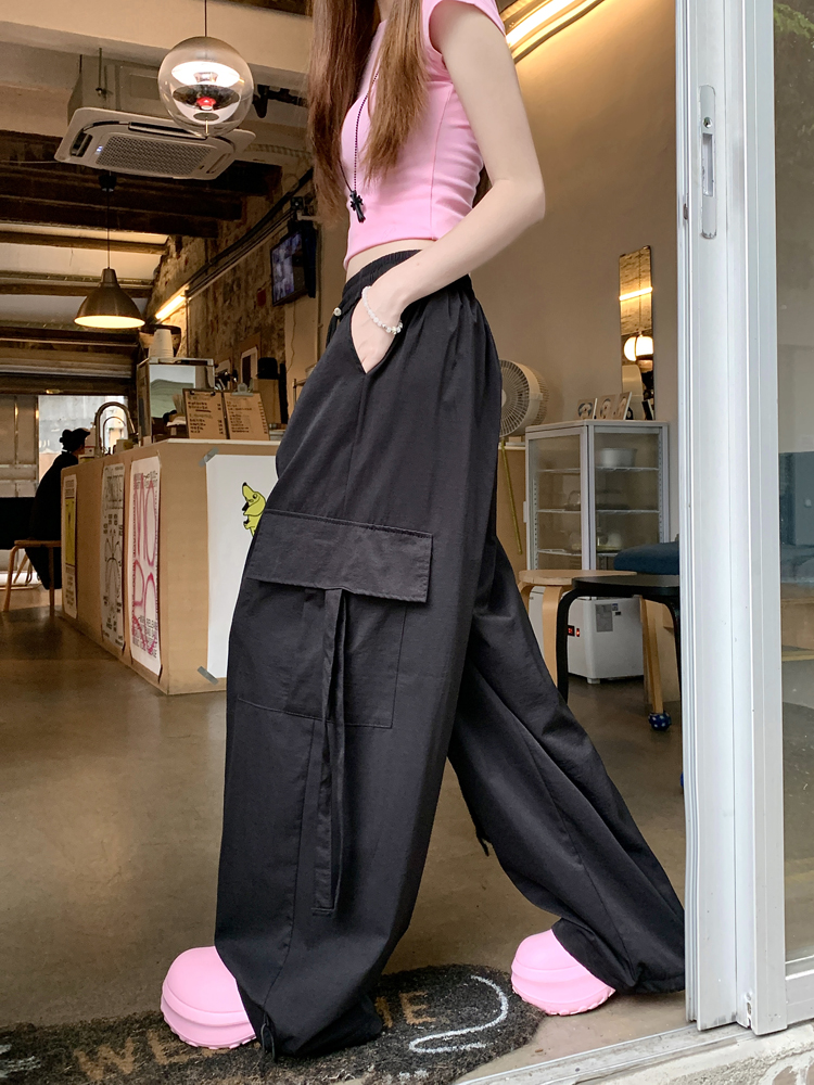 실사 느긋한 센스 캐주얼 바지 여성 여름 단색 허리밴드 바지 슬림해 보이는 와이드 레그 팬츠 루즈핏 도루 센스 바닥 청소 바지