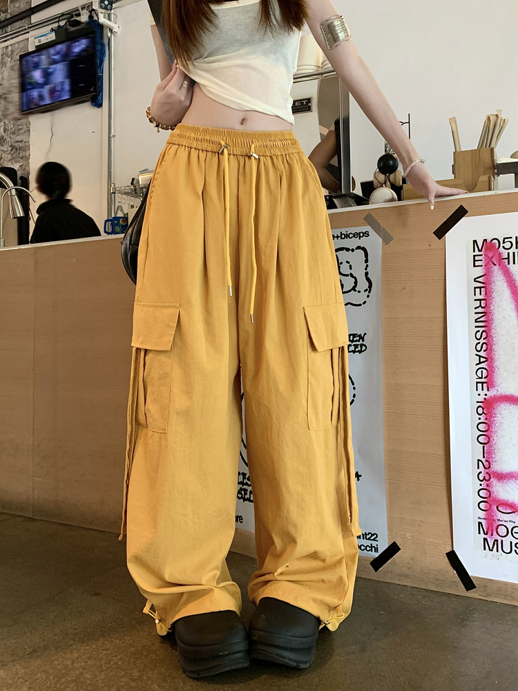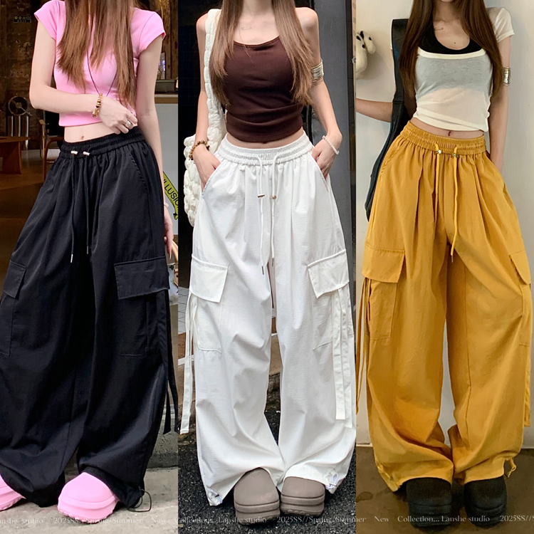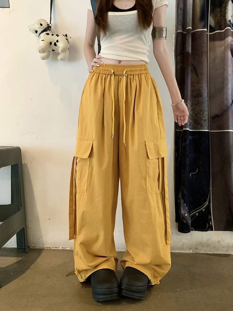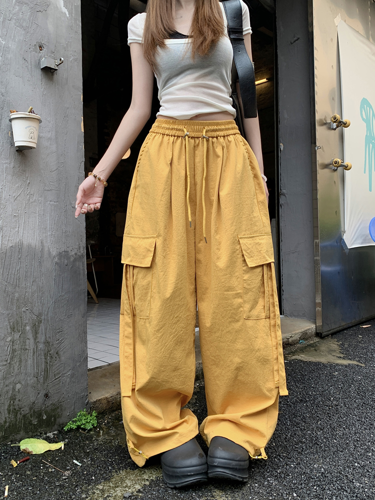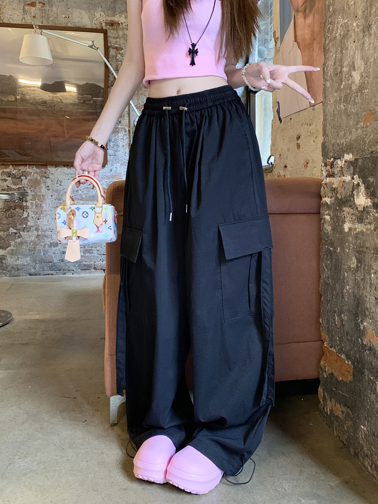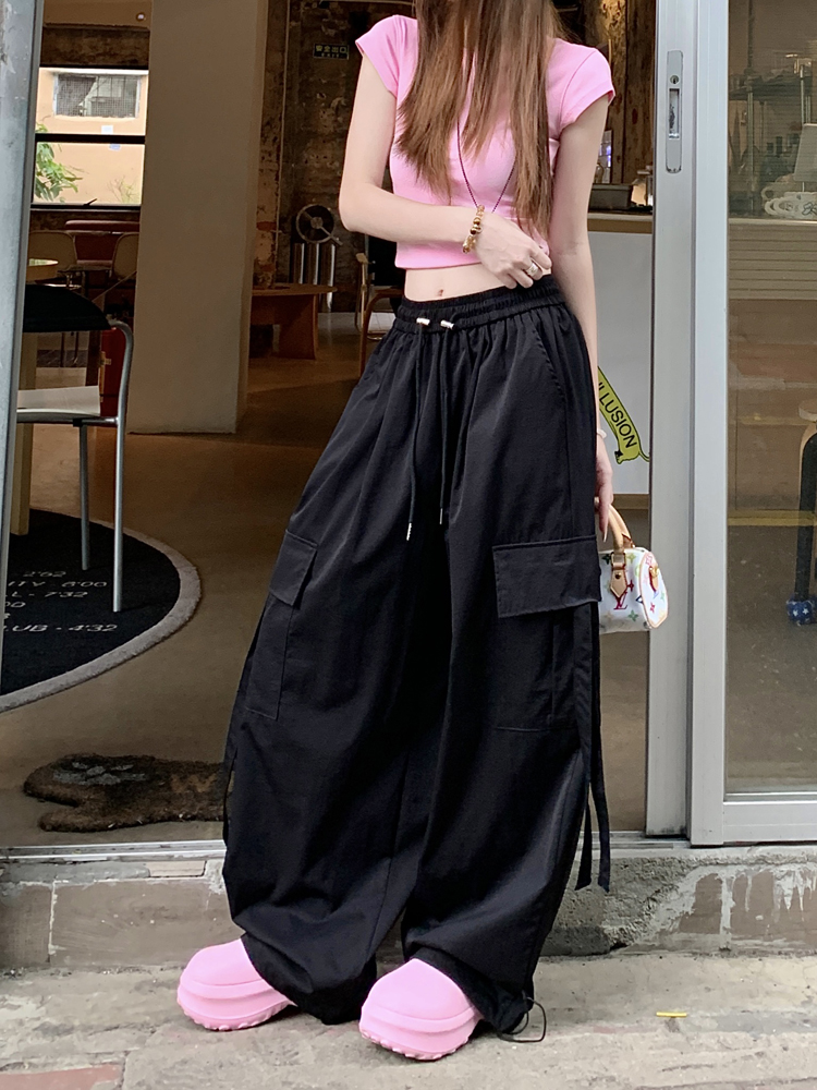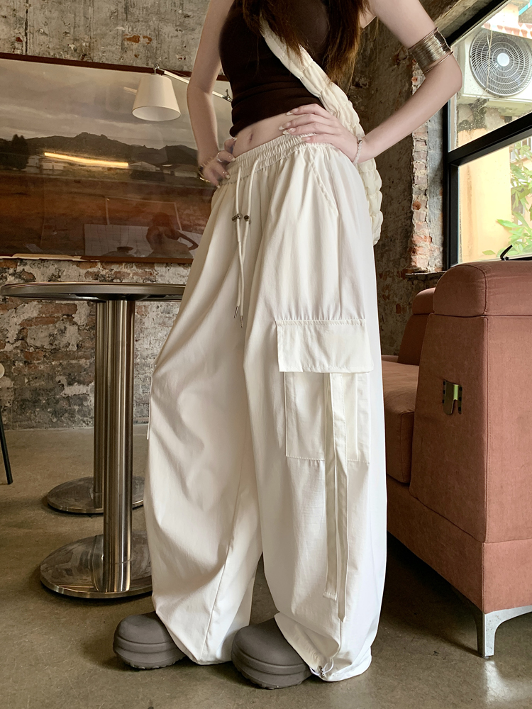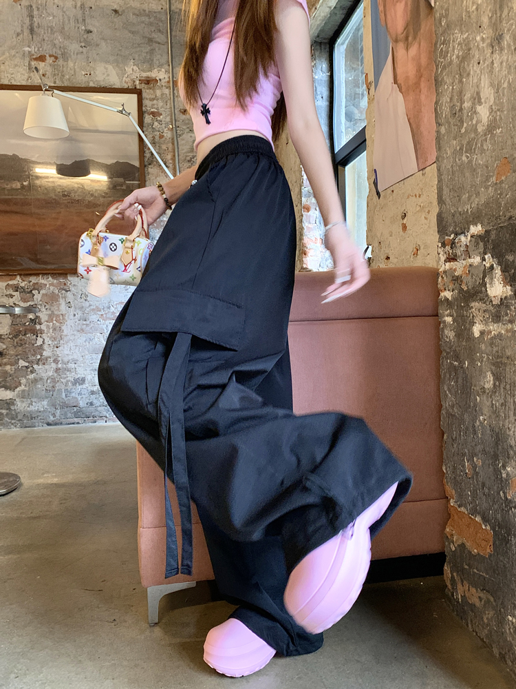 실사 느긋한 센스 캐주얼 바지 여성 여름 단색 허리밴드 바지 슬림해 보이는 와이드 레그 팬츠 루즈핏 도루 센스 바닥 청소 바지