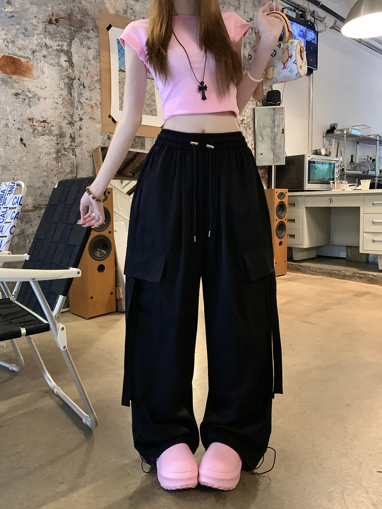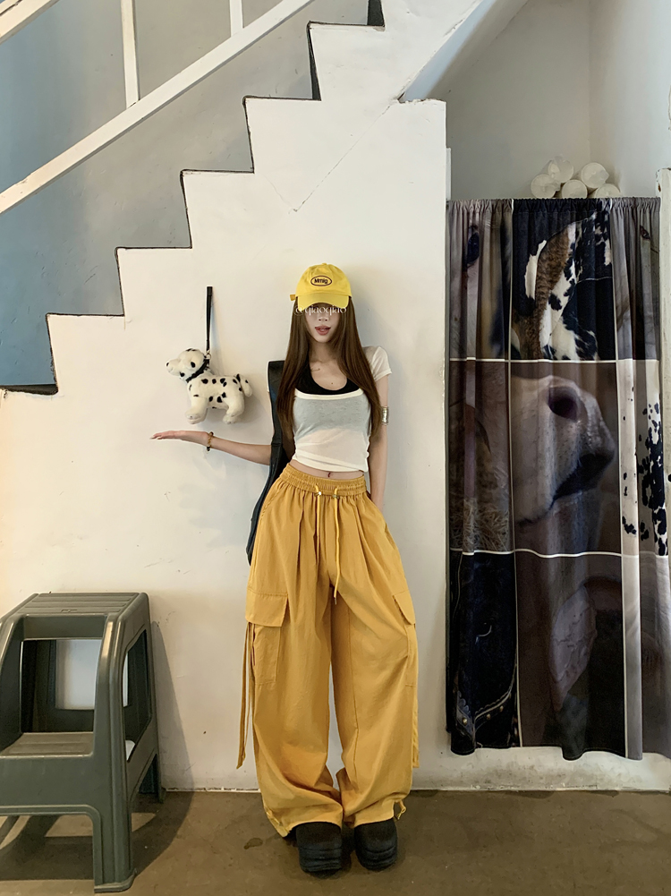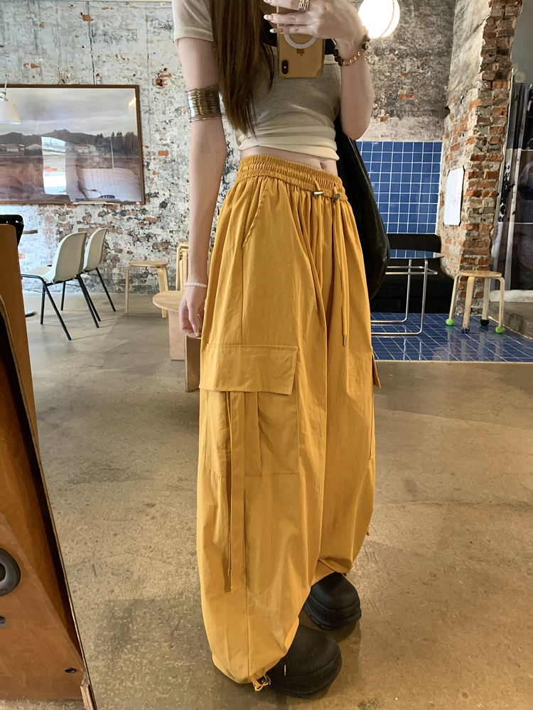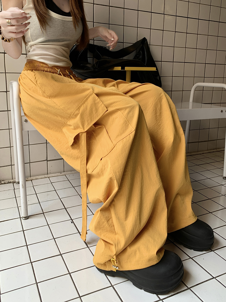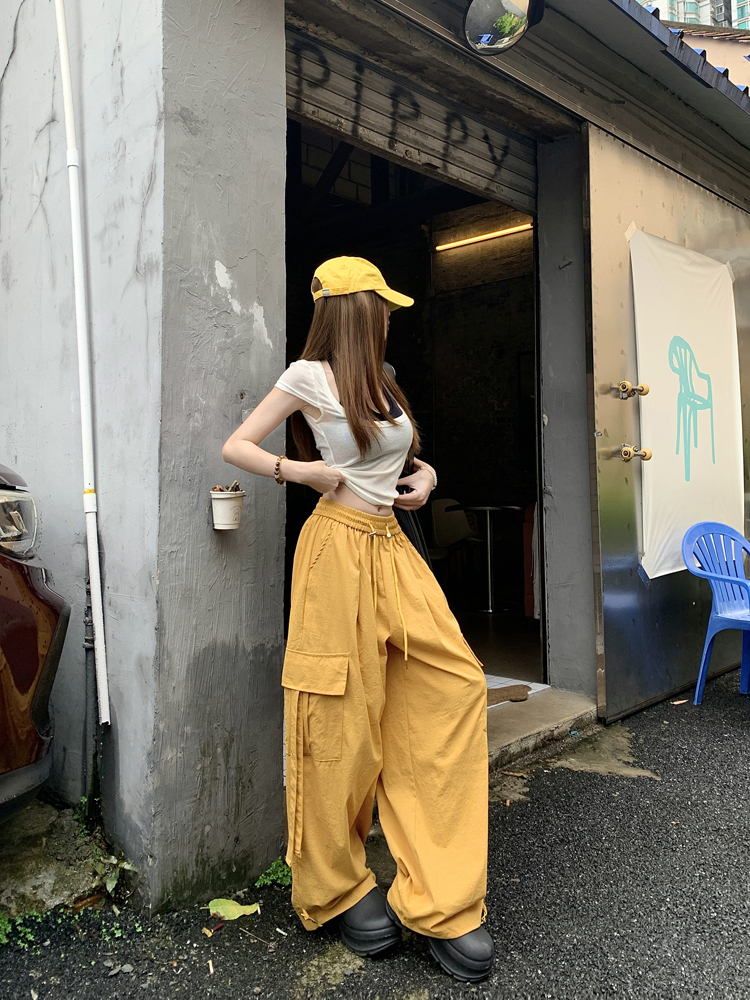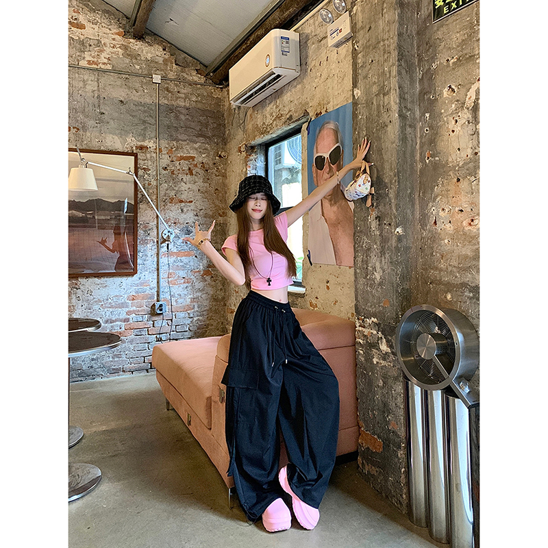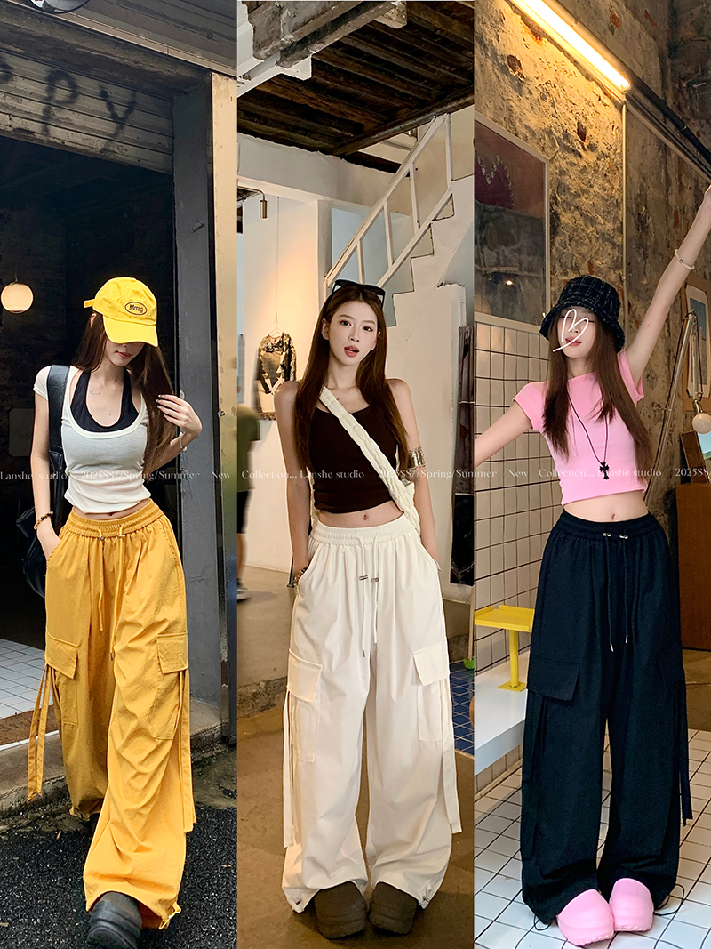 실사 느긋한 센스 캐주얼 바지 여성 여름 단색 허리밴드 바지 슬림해 보이는 와이드 레그 팬츠 루즈핏 도루 센스 바닥 청소 바지